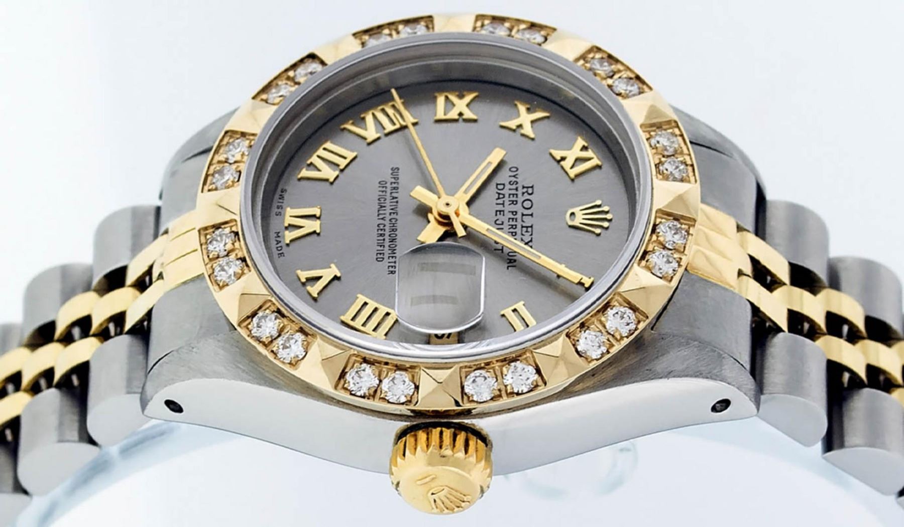 One Ladies 14K Two Tone Rolex Datejust Polished, Serviced & Electronically Tested, 14K Yellow Gold & Stainless Steel Case: 26mm, 14K Yellow Gold Crown, Custom Bezel: New 18K Yellow Gold Pyramid Diamond Bezel, Diamond Count: 24 Diamonds In Bezel. Total Weight .50 Carat, Clarity: SI-VS, Color: G to H. Custom Crystal: New Synthetic Sapphire Cyclops Lens. Custom Hands: New Luminescent Hands. Movement: Automatic Winding Movement Caliber 2030. Custom Dial: Slate Grey With Roman Hour Markers. Date Window: 3 O'Clock Position Date Display, Model: Datejust. Condition: G-6 Extra Fine The Watch Is In Very Good Condition Free Of All Scratches And Dents. . Bracelet: Two Tone 14K Yellow Gold & Stainless Steel Jubilee. Bright Polish. 6.0 Inch Length, Adjustable. Standard Clasp, With Rolex Logo. This Watch Has Been Serviced Time Tested And Is In Excellent Condition It Is Free Of All Scratches And Dents.