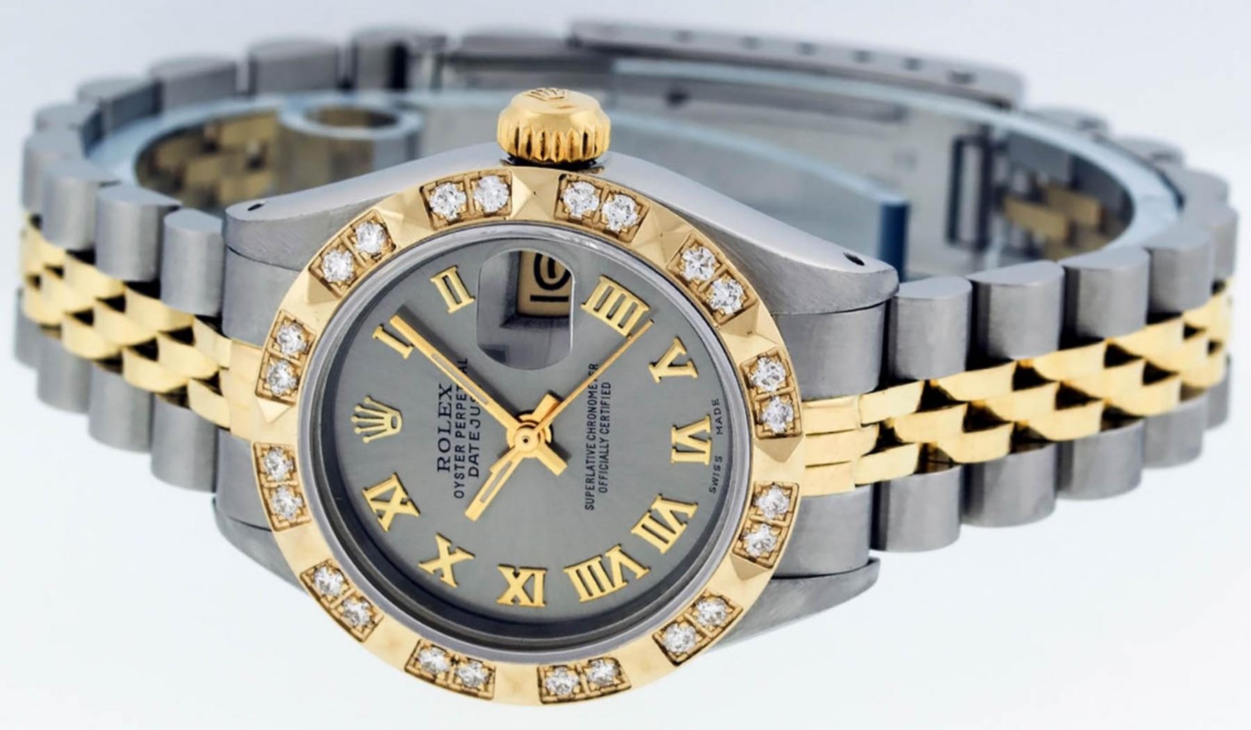 One Ladies 14K Two Tone Rolex Datejust Polished, Serviced & Electronically Tested, 14K Yellow Gold & Stainless Steel Case: 26mm, 14K Yellow Gold Crown, Custom Bezel: New 18K Yellow Gold Pyramid Diamond Bezel, Diamond Count: 24 Diamonds In Bezel. Total Weight .50 Carat, Clarity: SI-VS, Color: G to H. Custom Crystal: New Synthetic Sapphire Cyclops Lens. Custom Hands: New Luminescent Hands. Movement: Automatic Winding Movement Caliber 2030. Custom Dial: Slate Grey With Roman Hour Markers. Date Window: 3 O'Clock Position Date Display, Model: Datejust. Condition: G-6 Extra Fine The Watch Is In Very Good Condition Free Of All Scratches And Dents. . Bracelet: Two Tone 14K Yellow Gold & Stainless Steel Jubilee. Bright Polish. 6.0 Inch Length, Adjustable. Standard Clasp, With Rolex Logo. This Watch Has Been Serviced Time Tested And Is In Excellent Condition It Is Free Of All Scratches And Dents.