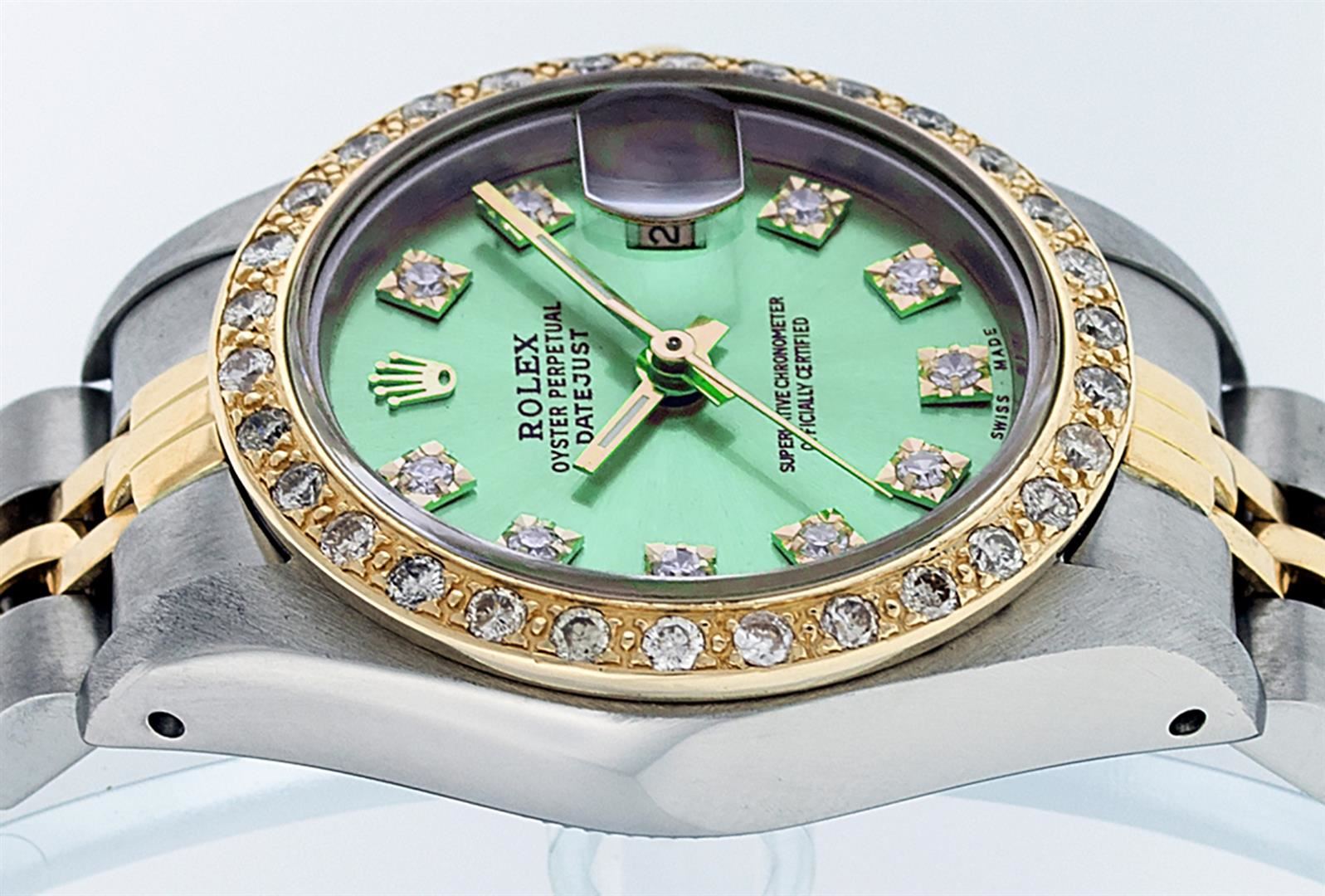 One Ladies 14K Two Tone Rolex Datejust Polished, Serviced & Electronically Tested, 14K Yellow Gold & Stainless Steel Case: 26mm, 14K Yellow Gold Crown, Custom Bezel: New 18K .70ctw Yellow Gold Beadset Diamond Bezel, Diamond Count: 32 Diamonds, Total Weight 1.00 Carat, Clarity: SI-VS, Color: G to H. Custom Crystal: New Scratch Resistant Synthetic Sapphire Cyclops Lens. Custom Hands: New Luminescent Hands. Movement: Automatic Winding Movement Caliber 2030. Custom Dial: Green VS Diamond Dial, Diamond Count: 10 Single Cut Diamonds in Dial, G To H In Color, VS Clarity. Date Window: 3 O'Clock Position Date Display, Model: Datejust, Condition: G-6 Extra Fine. Bracelet: Two Tone 14K Yellow Gold & Stainless Steel Jubilee. Bright Polish. 6.0 Inch Length, Adjustable. Standard Clasp, With Rolex Logo. This Watch Has Been Serviced Time Tested And Is In Excellent Condition It Is Free Of All Scratches And Dents.