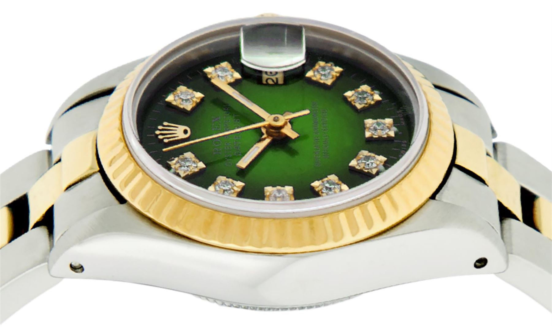 One Ladies 14K Two Tone Rolex Datejust Polished, Serviced & Electronically Tested, 14K Yellow Gold & Stainless Steel Case: 26mm, 14K Yellow Gold Crown, Bezel: 14K Yellow Gold Fluted Bezel. Custom Crystal: New Acrylic Cyclops Lens. Custom Hands: New Luminescent Hands. Movement: Automatic Winding Movement Caliber 2030. Custom Dial: Green Vignette With Diamond Hour Markers Dash Track & Lumi Dots, Diamond Count: 10 Single Cut Diamonds, Color: G to H, Clarity: VS. Date Window: 3 O'Clock Position Date Display, Model: Datejust. Condition: G-6 Extra Fine. Bracelet: Two Tone 14K Yellow Gold & Stainless Steel Oyster Band. Bright Polish. 6.0 Inch Length, Adjustable. Standard Clasp, With Rolex Logo. This Watch Has Been Serviced Time Tested And Is In Excellent Condition It Is Free Of All Scratches And Dents.