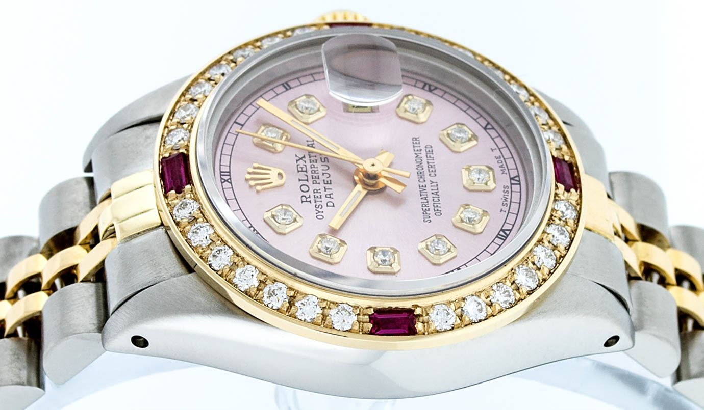 One Ladies 14K Two Tone Rolex Datejust Polished, Serviced & Electronically Tested, 14K Yellow Gold & Stainless Steel Case: 26mm, 14K Yellow Gold Crown, Custom Bezel: New 18K Yellow Gold Ruby Beadset Diamond Bezel, Diamond + Gem Count: 28 Diamonds + 4 Rubies Total Weight .70 Carat, Clarity: Si-VS, Color: G to H. Custom Crystal: New Synthetic Sapphire Cyclops Lens. Custom Hands: New Luminescent Hands. Movement: Automatic Winding Movement Caliber 2030. Custom Dial: Ice Pink Set With Diamond Hour Markers, Diamond Count: 10 Diamond in Dial, G To H In Color, Si-VS Clarity. Date Window: 3 O'Clock Position Date Display, Model: Datejust, Condition: G-6 Extra Fine. Bracelet: Two Tone 14K Yellow Gold & Stainless Steel Jubilee. Bright Polish. 6.0 Inch Length, Adjustable. Standard Clasp, With Rolex Logo. This Watch Has Been Serviced Time Tested And Is In Excellent Condition It Is Free Of All Scratches And Dents.