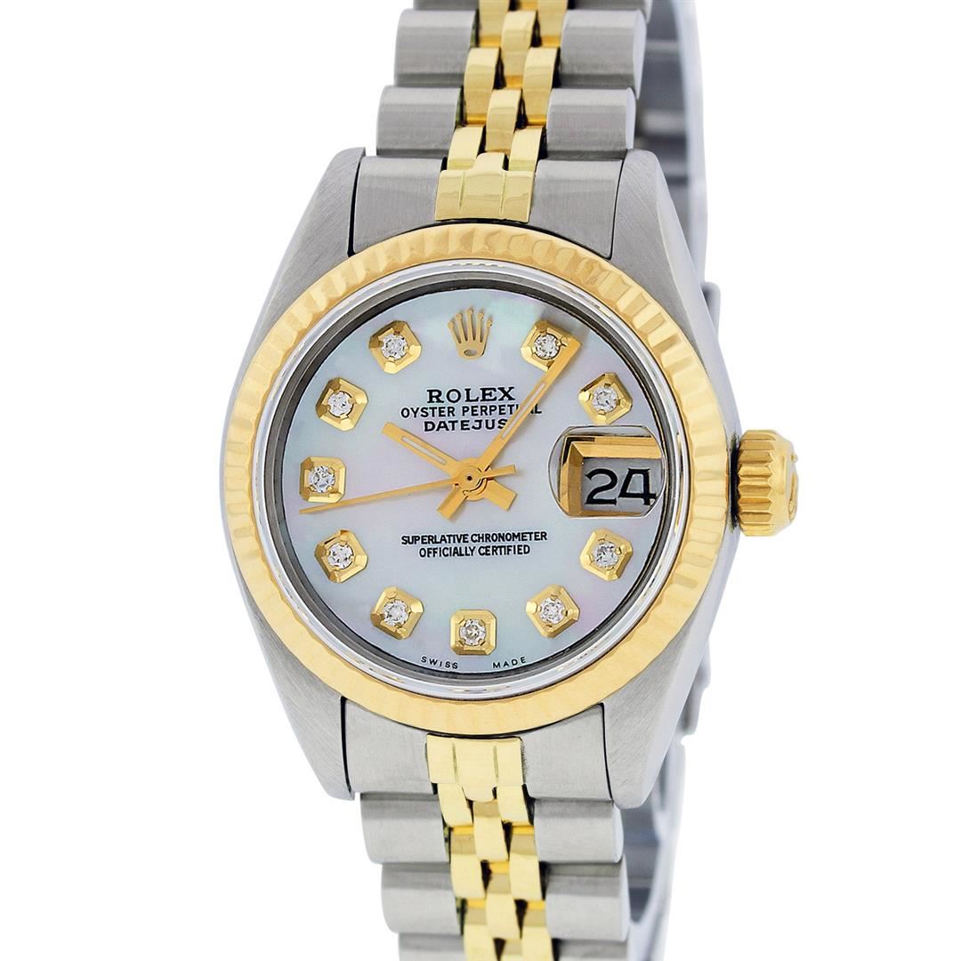 One Ladies 14K Two Tone Rolex Datejust Polished, Serviced & Electronically Tested, 14K Yellow Gold & Stainless Steel Case: 26mm, 14K Yellow Gold Crown, Bezel: 14K Yellow Gold Fluted Bezel. Custom Crystal: New Acrylic Cyclops Lens. Custom Hands: New Luminescent Hands. Movement: Automatic Winding Movement Caliber 2030. Custom Dial: Mother Of Pearl With Diamond Hour Markers, Diamond Count: 10 Diamonds In Dial, Color: G to H, Clarity: VS2-SI1. Date Window: 3 O'Clock Position Date Display, Model: Datejust. Condition: G-6 Extra Fine. Bracelet: Two Tone 14K Yellow Gold & Stainless Steel Jubilee Band. Bright Polish. 6.0 Inch Length, Adjustable. Standard Clasp, With Rolex Logo. This Watch Has Been Serviced Time Tested And Is In Excellent Condition It Is Free Of All Scratches And Dents.