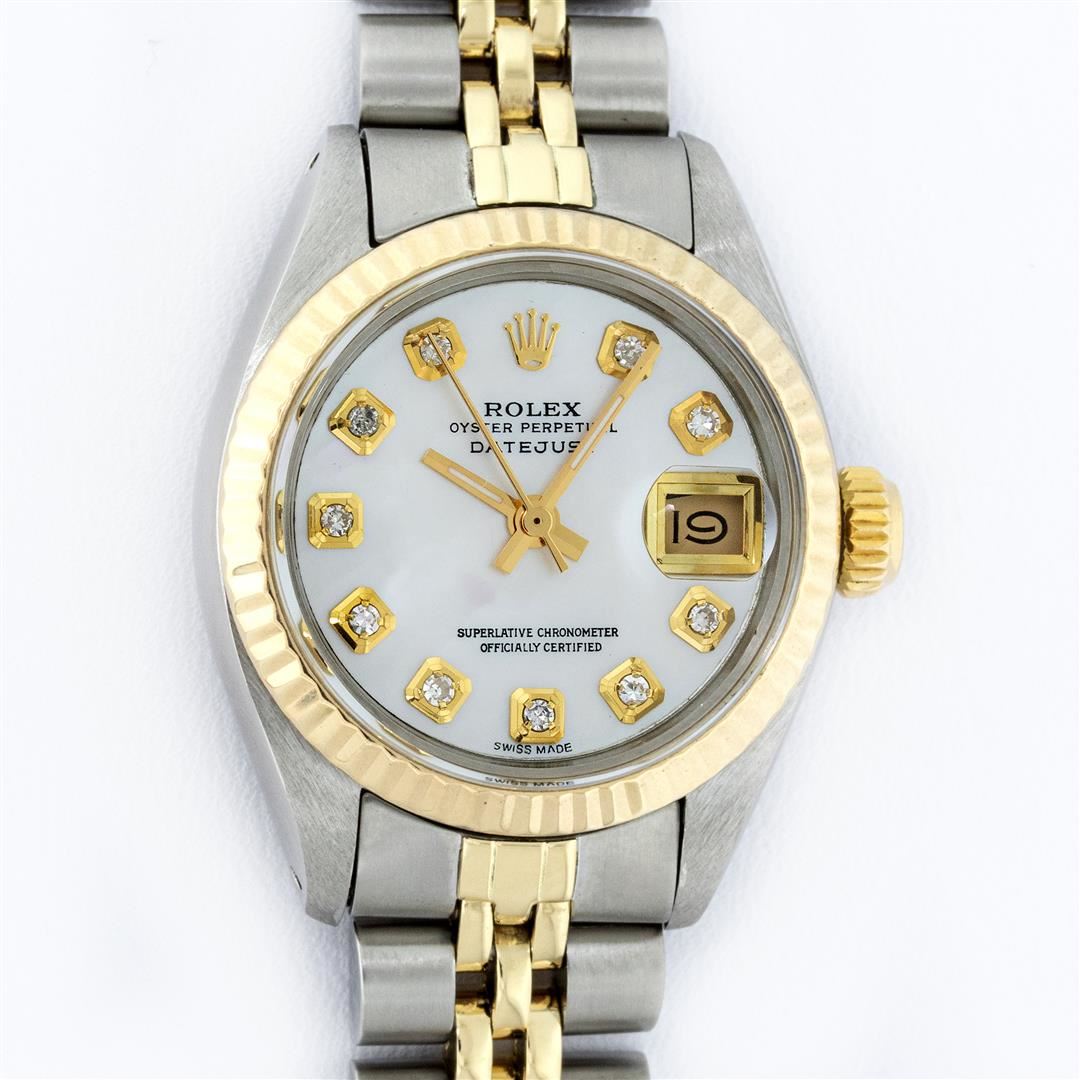 One Ladies 14K Two Tone Rolex Datejust Polished, Serviced & Electronically Tested, 14K Yellow Gold & Stainless Steel Case: 26mm, 14K Yellow Gold Crown, Bezel: 14K Yellow Gold Fluted Bezel. Custom Crystal: New Acrylic Cyclops Lens. Custom Hands: New Luminescent Hands. Movement: Automatic Winding Movement Caliber 2030. Custom Dial: Mother Of Pearl With Diamond Hour Markers, Diamond Count: 10 Diamonds In Dial, Color: G to H, Clarity: VS2-SI1. Date Window: 3 O'Clock Position Date Display, Model: Datejust. Condition: G-6 Extra Fine. Bracelet: Two Tone 14K Yellow Gold & Stainless Steel Jubilee Band. Bright Polish. 6.0 Inch Length, Adjustable. Standard Clasp, With Rolex Logo. This Watch Has Been Serviced Time Tested And Is In Excellent Condition It Is Free Of All Scratches And Dents.