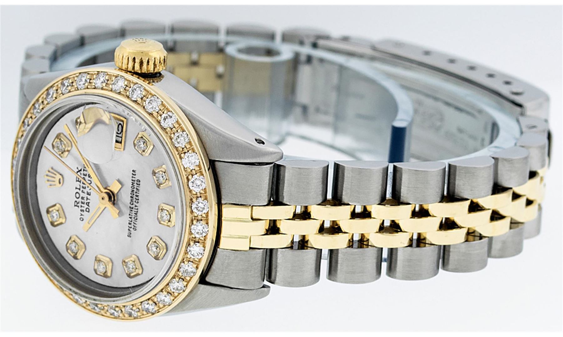 One Ladies 14K Two Tone Rolex Datejust Polished, Serviced & Electronically Tested, 14K Yellow Gold & Stainless Steel Case: 26mm, 14K Yellow Gold Crown, Custom Bezel: 18K Yellow Gold� Beadset Diamond Bezel, Diamond Count: 32 Diamonds Total Weight .70 Carat, Clarity: Si-VS, Color: G to H. Custom Crystal: Synthetic Sapphire Cyclops Lens. Custom Hands: New Luminescent Hands. Movement: Automatic Winding Movement Caliber 2030. Custom Dial: Mother Of Pearl Dial Set With Diamond Hour Markers, 10 Diamond in Dial G To H In Color, SI-VS Clarity. Date Window: 3 O'Clock Position Date Display, Model: Datejust. Condition: G-6 Extra Fine. Bracelet: Two Tone 14K Yellow Gold & Stainless Steel Jubilee. Bright Polish. 6.0 Inch Length, Adjustable. Standard Clasp, With Rolex Logo. This Watch Has Been Serviced Time Tested And Is In Excellent Condition It Is Free Of All Scratches And Dents.
