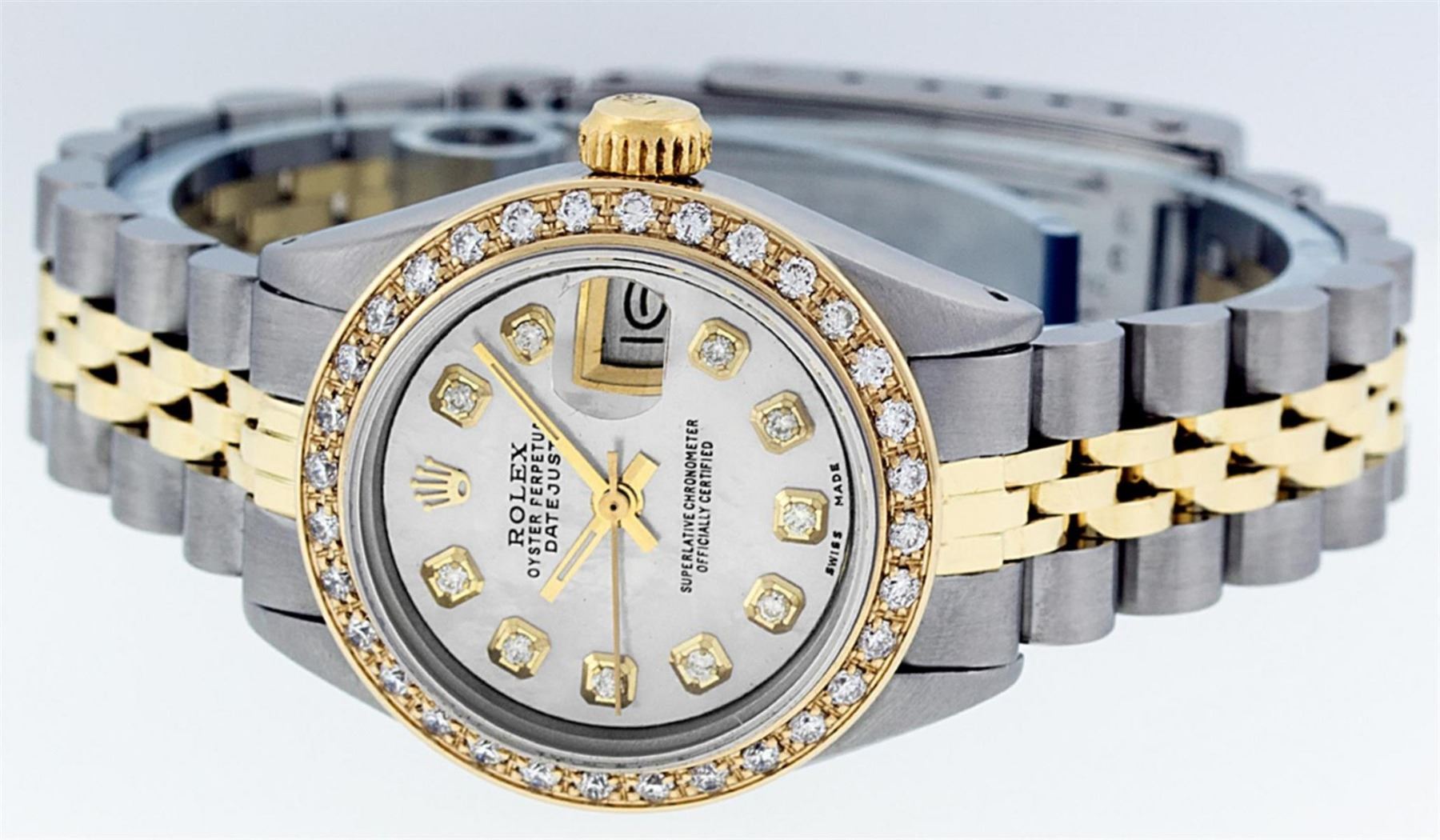 One Ladies 14K Two Tone Rolex Datejust Polished, Serviced & Electronically Tested, 14K Yellow Gold & Stainless Steel Case: 26mm, 14K Yellow Gold Crown, Custom Bezel: 18K Yellow Gold Beadset Diamond Bezel, Diamond Count: 32 Diamonds Total Weight .70 Carat, Clarity: Si-VS, Color: G to H. Custom Crystal: Synthetic Sapphire Cyclops Lens. Custom Hands: New Luminescent Hands. Movement: Automatic Winding Movement Caliber 2030. Custom Dial: Mother Of Pearl Dial Set With Diamond Hour Markers, 10 Diamond in Dial G To H In Color, SI-VS Clarity. Date Window: 3 O'Clock Position Date Display, Model: Datejust. Condition: G-6 Extra Fine. Bracelet: Two Tone 14K Yellow Gold & Stainless Steel Jubilee. Bright Polish. 6.0 Inch Length, Adjustable. Standard Clasp, With Rolex Logo. This Watch Has Been Serviced Time Tested And Is In Excellent Condition It Is Free Of All Scratches And Dents.