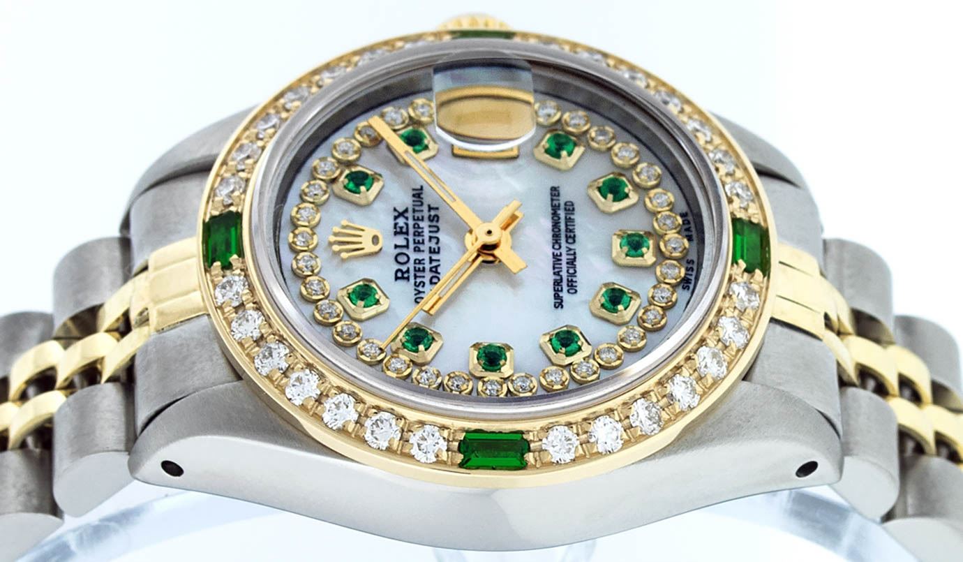 One Ladies 14K Two Tone Rolex Datejust Polished, Serviced & Electronically Tested, 14K Yellow Gold & Stainless Steel Case: 26mm, 14K Yellow Gold Crown, Custom Bezel: New 18K Yellow Gold Synthetic Emerald Beadset Diamond Bezel, Diamond Count: 28 Diamonds + 4 Synthetic Emeralds . Total Weight .70 Carat, Clarity: SI-VS, Color: G to H. Custom Crystal: New Synthetic Sapphire Cyclops Lens. Custom Hands: New Luminescent Hands. Movement: Automatic Winding Movement Caliber 2030. Custom Dial: Mother Of Pearl With Green Emerald String Diamond Hour Markers. 10 Emeralds + 33 Diamonds In Dial, Clarity: SI-VS, Color: G to H. Date Window: 3 O'Clock Position Date Display, Model: Datejust. Condition: G-6 Extra Fine. Bracelet: Two Tone 14K Yellow Gold & Stainless Steel Jubilee. Bright Polish. 6.0 Inch Length, Adjustable. Standard Clasp, With Rolex Logo. This Watch Has Been Serviced Time Tested And Is In Excellent Condition It Is Free Of All Scratches And Dents.