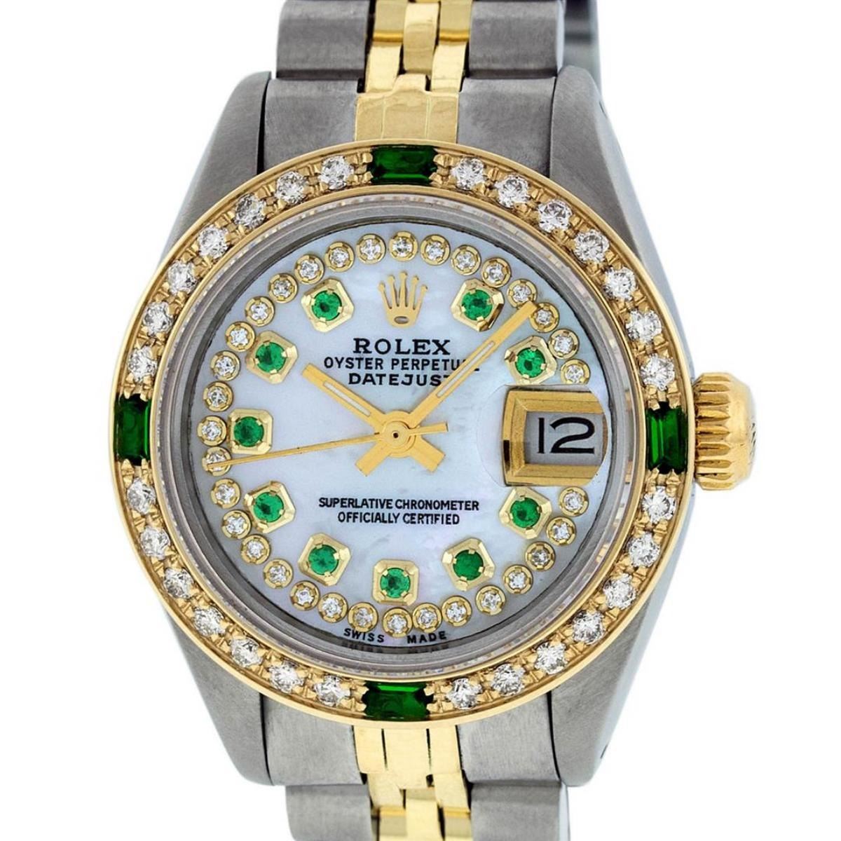 One Ladies 14K Two Tone Rolex Datejust Polished, Serviced & Electronically Tested, 14K Yellow Gold & Stainless Steel Case: 26mm, 14K Yellow Gold Crown, Custom Bezel: New 18K Yellow Gold Synthetic Emerald� Beadset Diamond Bezel, Diamond Count:�28 Diamonds + 4 Synthetic Emeralds�. Total Weight .70 Carat, Clarity: SI-VS, Color: G to H. Custom Crystal: New Synthetic Sapphire Cyclops Lens. Custom Hands: New Luminescent Hands. Movement: Automatic Winding Movement Caliber 2030. Custom Dial: Mother Of Pearl With Green Emerald String Diamond Hour Markers. 10 Emeralds + 33 Diamonds In Dial, Clarity: SI-VS, Color: G to H. Date Window: 3 O'Clock Position Date Display, Model: Datejust. Condition: G-6 Extra Fine. Bracelet: Two Tone 14K Yellow Gold & Stainless Steel Jubilee. Bright Polish.�6.0 Inch Length, Adjustable. Standard Clasp, With Rolex Logo. This Watch Has Been Serviced Time Tested And Is In Excellent Condition It Is Free Of All Scratches And Dents.