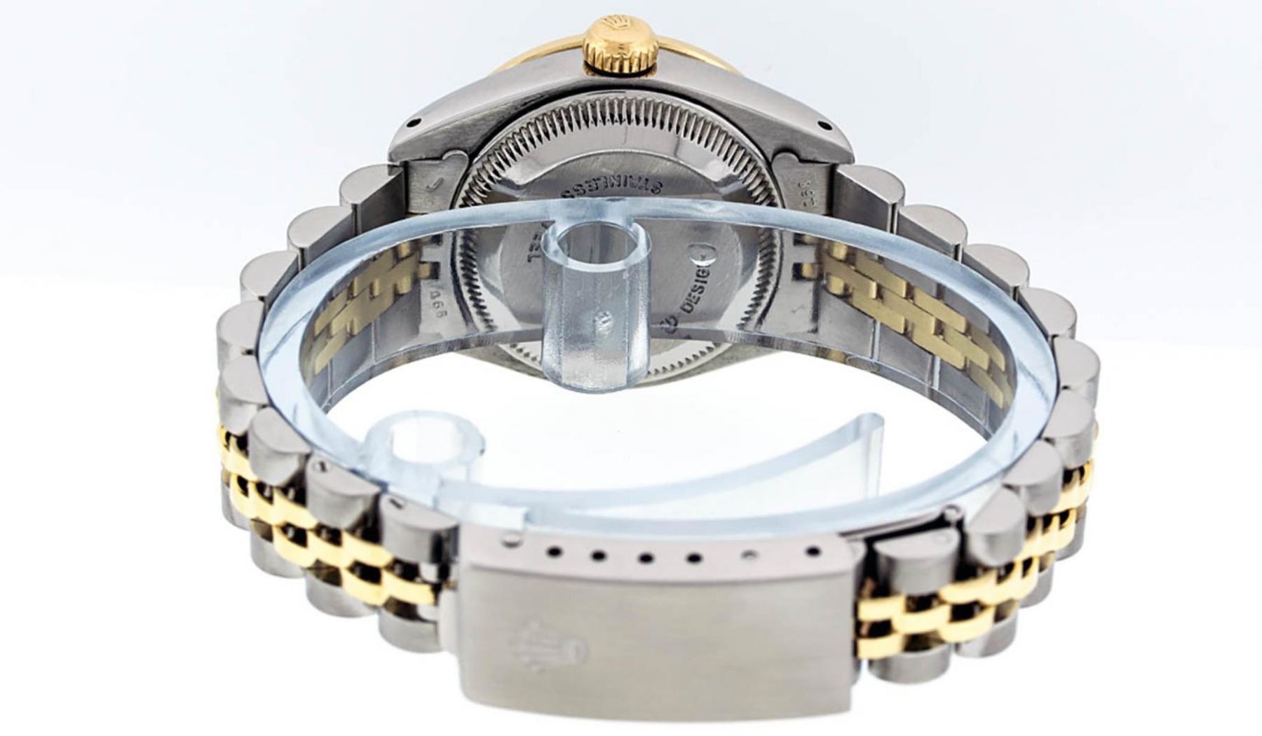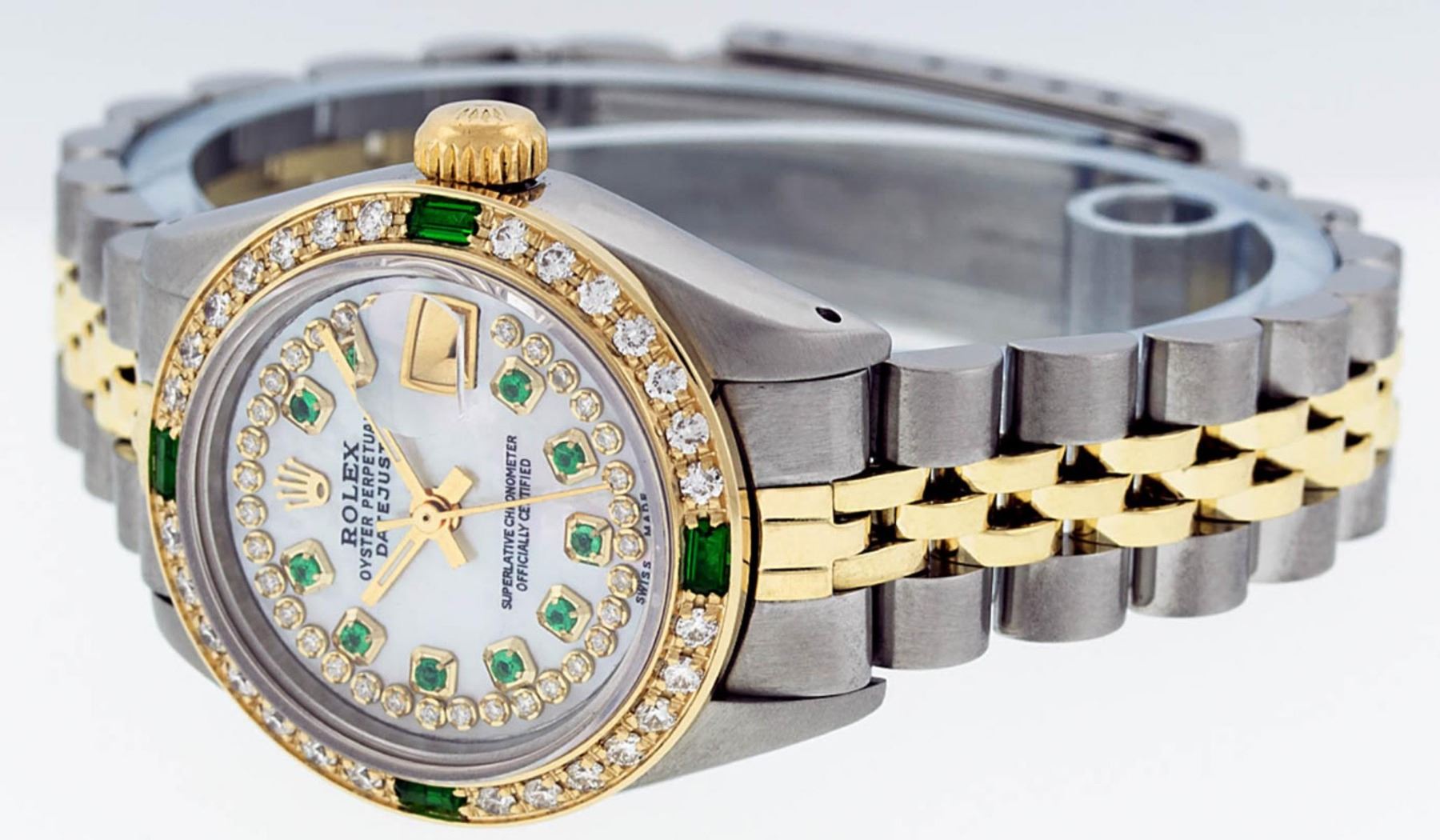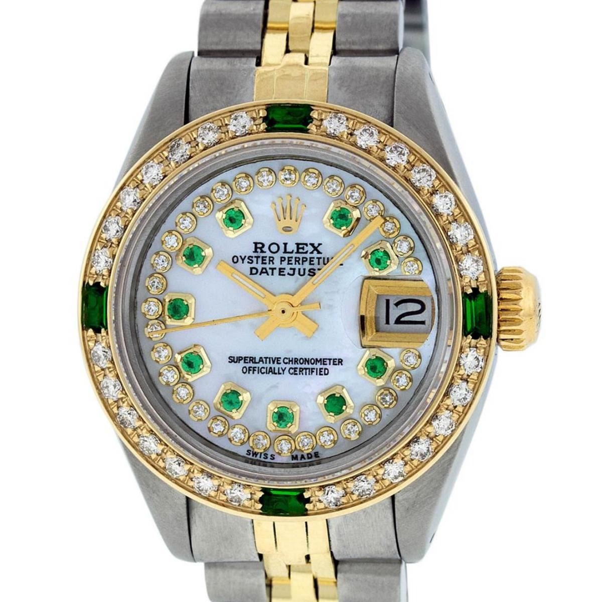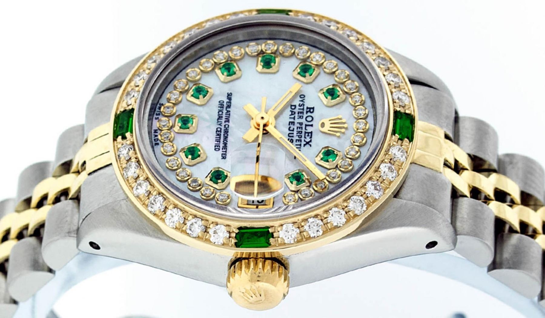One Ladies 14K Two Tone Rolex Datejust Polished, Serviced & Electronically Tested, 14K Yellow Gold & Stainless Steel Case: 26mm, 14K Yellow Gold Crown, Custom Bezel: New 18K Yellow Gold Synthetic Emerald Beadset Diamond Bezel, Diamond Count: 28 Diamonds + 4 Synthetic Emeralds . Total Weight .70 Carat, Clarity: SI-VS, Color: G to H. Custom Crystal: New Synthetic Sapphire Cyclops Lens. Custom Hands: New Luminescent Hands. Movement: Automatic Winding Movement Caliber 2030. Custom Dial: Mother Of Pearl With Green Emerald String Diamond Hour Markers. 10 Emeralds + 33 Diamonds In Dial, Clarity: SI-VS, Color: G to H. Date Window: 3 O'Clock Position Date Display, Model: Datejust. Condition: G-6 Extra Fine. Bracelet: Two Tone 14K Yellow Gold & Stainless Steel Jubilee. Bright Polish. 6.0 Inch Length, Adjustable. Standard Clasp, With Rolex Logo. This Watch Has Been Serviced Time Tested And Is In Excellent Condition It Is Free Of All Scratches And Dents.