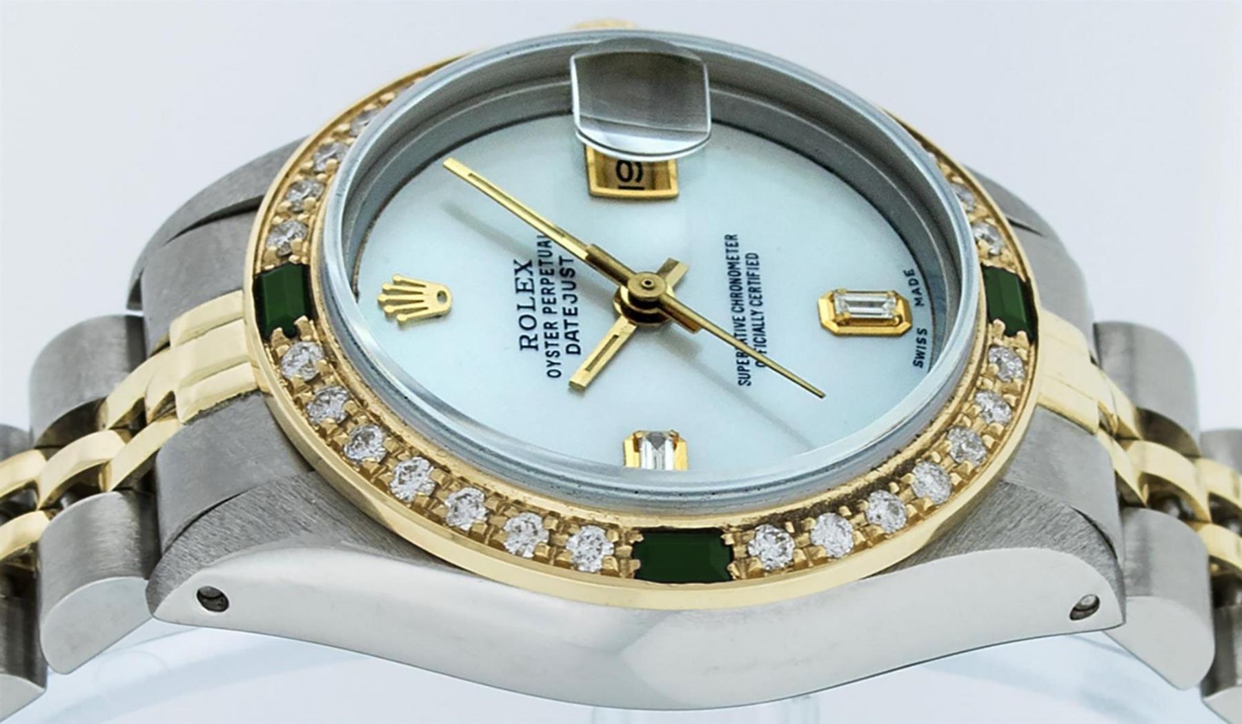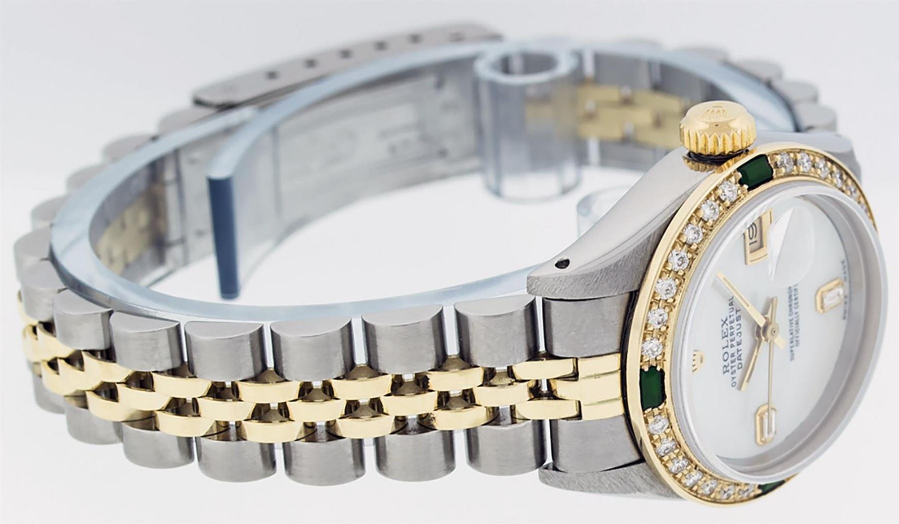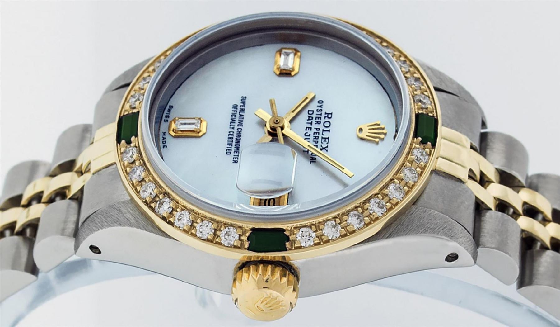 One Ladies 14K Two Tone Rolex Datejust Polished, Serviced & Electronically Tested, 14K Yellow Gold & Stainless Steel Case: 26mm, 14K Yellow Gold Crown, Custom Bezel: New 18K Yellow Gold Emerald Beadset Diamond Bezel, Diamond Count: 28 Diamonds + 4 Emeralds In Bezel. Total Bezel Weight .70 Carat, Clarity: SI-VS, Color: G to H. Custom Crystal: New Scratch Resistant Synthetic Sapphire Cyclops Lens. Custom Hands: New Luminescent Hands. Movement: Automatic Winding Movement Caliber 2030. Custom Dial: Mother Of Pearl With Baguette Diamonds, Stone Count: 2 Baguettes. Date Window: 3 O'Clock Position Date Display, Model: Datejust. Condition: G-6 Extra Fine. Bracelet: Two Tone 14K Yellow Gold & Stainless Steel Jubilee Band. Bright Polish. 6.0 Inch Length, Adjustable. Standard Clasp, With Rolex Logo. This Watch Has Been Serviced Time Tested And Is In Excellent Condition It Is Free Of All Scratches And Dents.