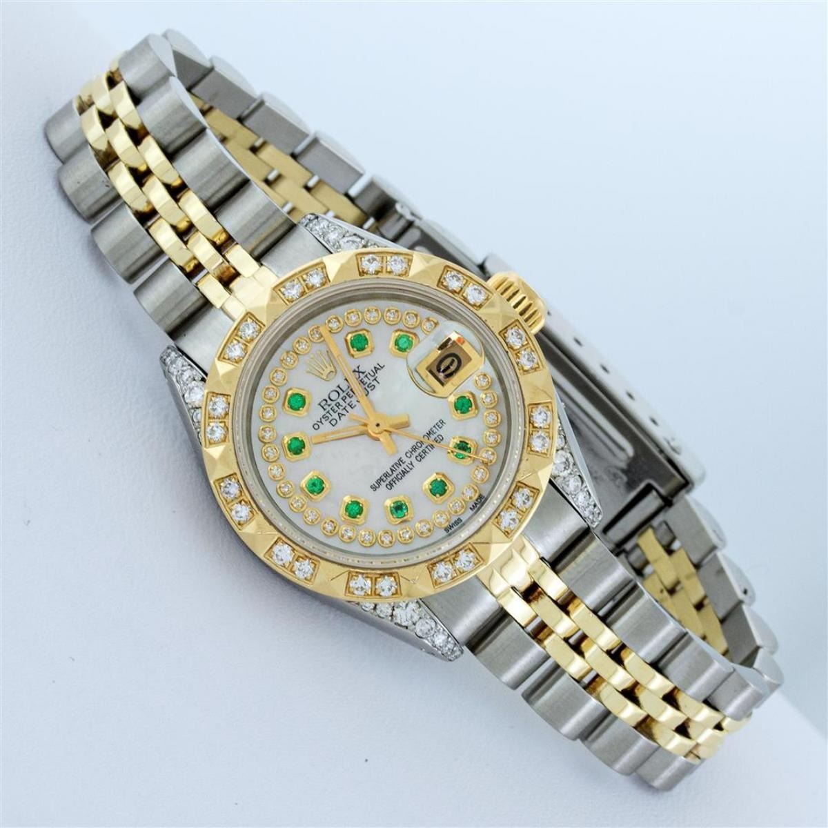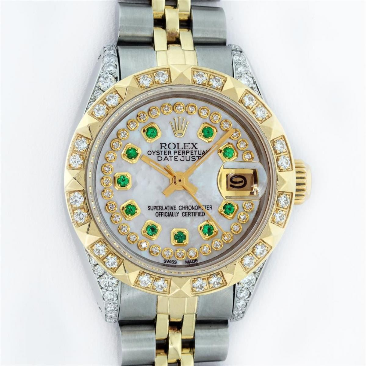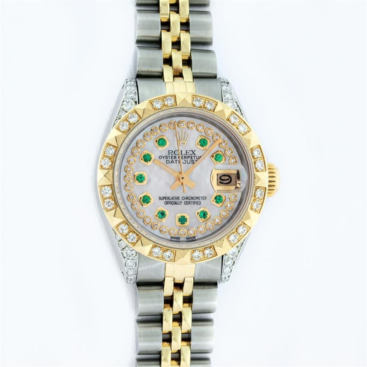 One Ladies 14K Two Tone Rolex Datejust Polished, Serviced & Electronically Tested, 14K Yellow Gold & Stainless Steel Case: 26mm, 14K Yellow Gold Crown, Diamond Lugs: 24 Diamonds On Lugs, Clarity: SI-VS, Color: G to H, Clarity SI-VS. Custom Bezel: New 18K Yellow Gold Pyramid Diamond Bezel, Diamond Count: 24 Diamonds On Bezel, Total Bezel Weight .50 Carat, Clarity: SI-VS, Color: G to H. Custom Crystal: New Scratch Resistant Sapphire Cyclops Lens. Custom Hands: New Luminescent Hands. Movement: Automatic Winding Movement Caliber 2030. Custom Dial: Mother Of Pearl With Emerald Hour Markers, Stone Count: 10 Emeralds + 33 Diamonds In Dial, Clarity: SI-VS, Color: G to H. Date Window: 3 O'Clock Position Date Display, Model: Datejust. Condition: G-6 Extra Fine. Bracelet: Two Tone 14K Yellow Gold & Stainless Steel Jubilee. Bright Polish. 6.0 Inch Length, Adjustable. Standard Clasp, With Rolex Logo. This Watch Has Been Serviced Time Tested And Is In Excellent Condition It Is Free Of All Scratches And Dents.