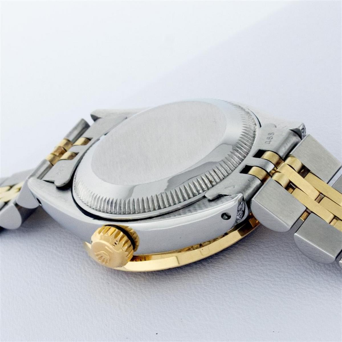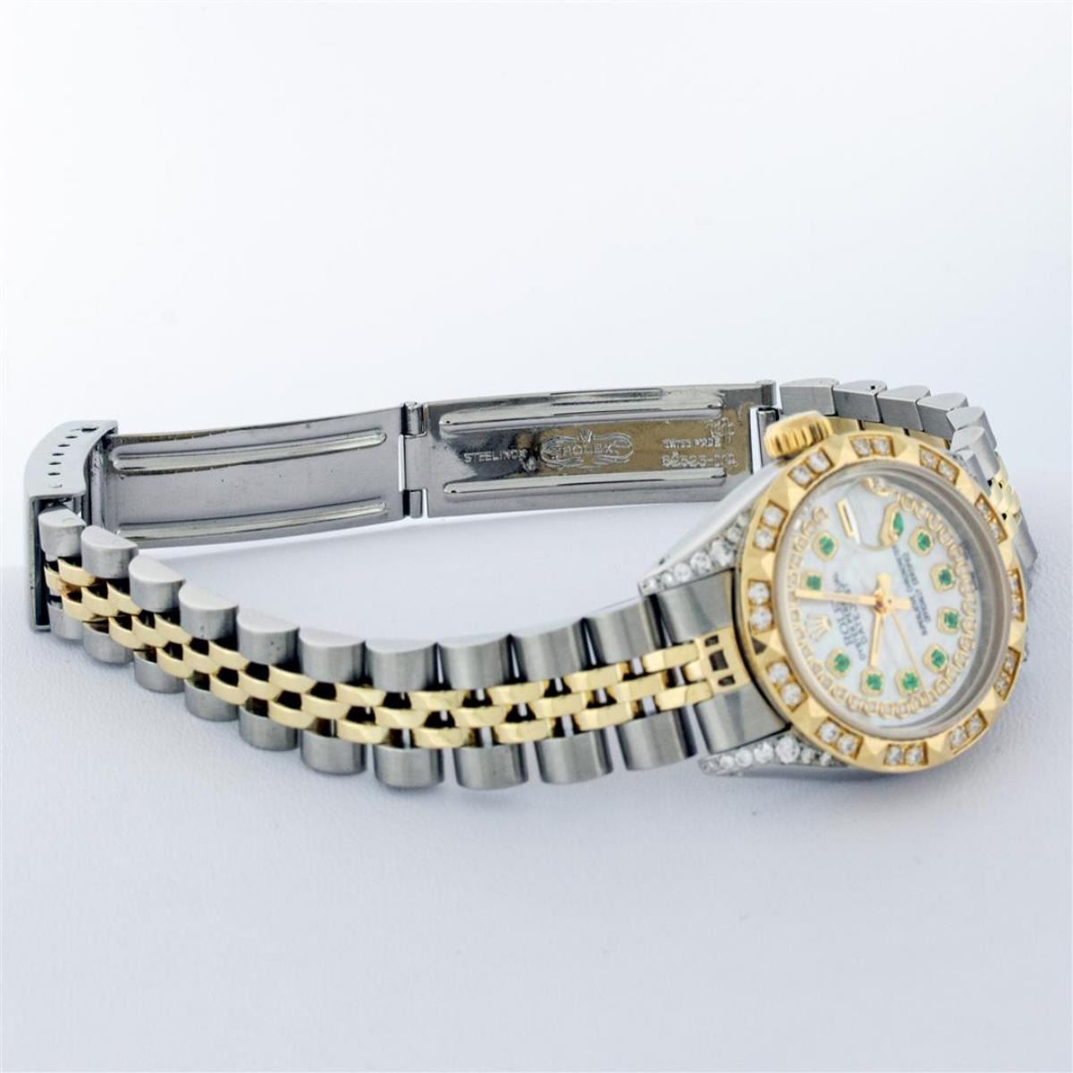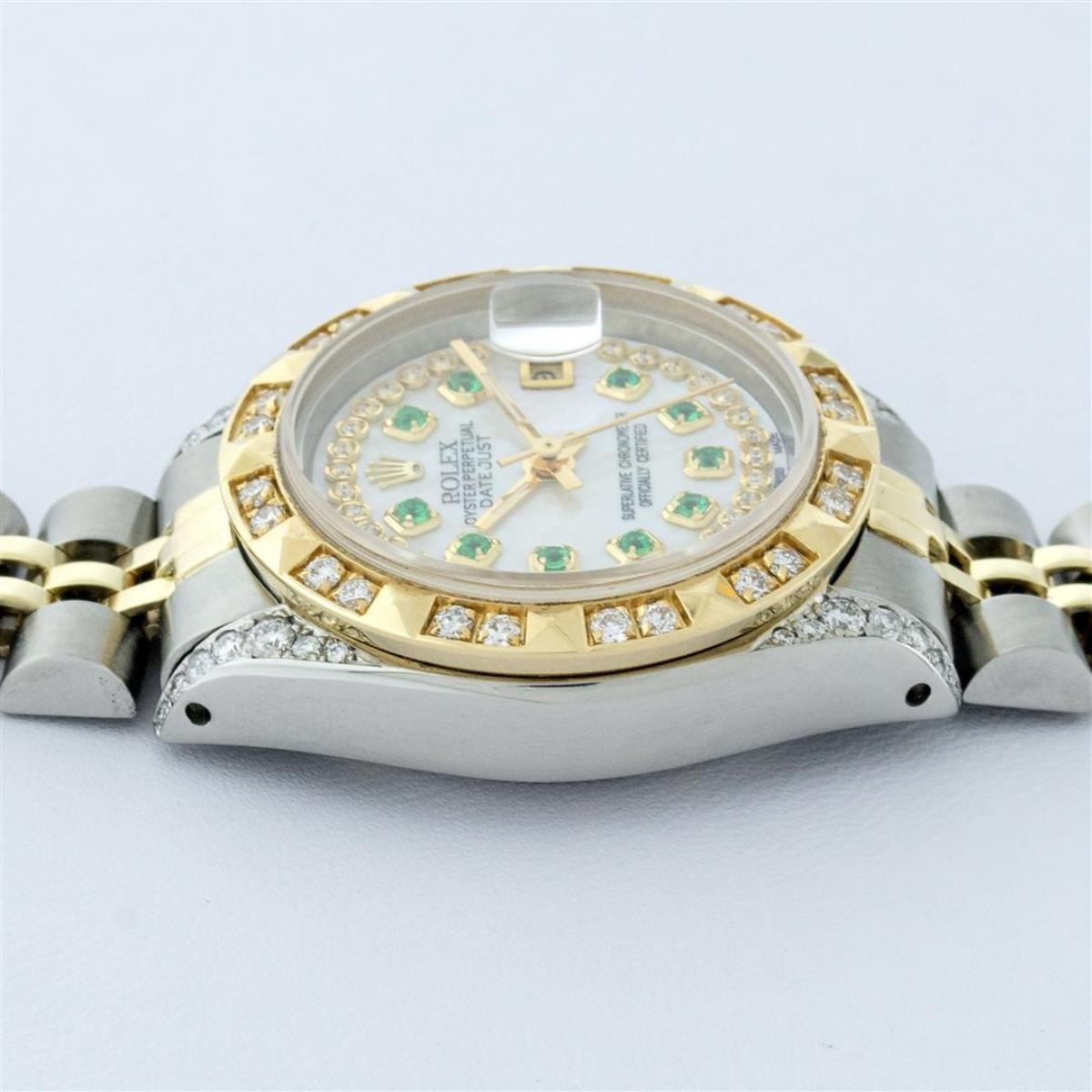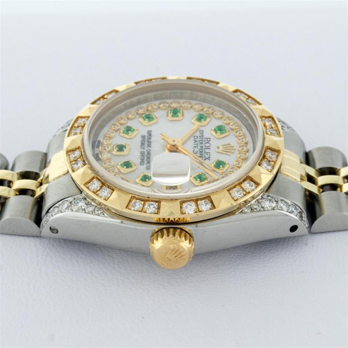 One Ladies 14K Two Tone Rolex Datejust Polished, Serviced & Electronically Tested, 14K Yellow Gold & Stainless Steel Case: 26mm, 14K Yellow Gold Crown, Diamond Lugs: 24 Diamonds On Lugs, Clarity: SI-VS, Color: G to H, Clarity SI-VS. Custom Bezel: New 18K Yellow Gold Pyramid Diamond Bezel, Diamond Count: 24 Diamonds On Bezel, Total Bezel Weight .50 Carat, Clarity: SI-VS, Color: G to H. Custom Crystal: New Scratch Resistant Sapphire Cyclops Lens. Custom Hands: New Luminescent Hands. Movement: Automatic Winding Movement Caliber 2030. Custom Dial: Mother Of Pearl With Emerald Hour Markers, Stone Count: 10 Emeralds + 33 Diamonds In Dial, Clarity: SI-VS, Color: G to H. Date Window: 3 O'Clock Position Date Display, Model: Datejust. Condition: G-6 Extra Fine. Bracelet: Two Tone 14K Yellow Gold & Stainless Steel Jubilee. Bright Polish. 6.0 Inch Length, Adjustable. Standard Clasp, With Rolex Logo. This Watch Has Been Serviced Time Tested And Is In Excellent Condition It Is Free Of All Scratches And Dents.