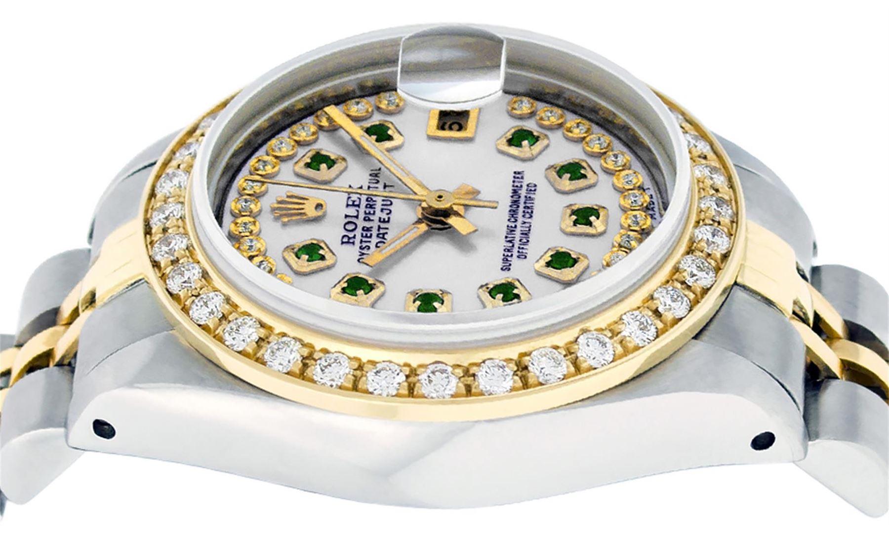 One Ladies 14K Two Tone Rolex Datejust Polished, Serviced & Electronically Tested, 14K Yellow Gold & Stainless Steel Case: 26mm, 14K Yellow Gold Crown, Custom Bezel: New 18K Yellow Gold Beadset Diamond Bezel, Diamond Count: 32 Diamonds In Bezel, Total Weight .70 Carat, Clarity: SI-VS, Color: G to H. Custom Crystal: New Synthetic Sapphire Cyclops Lens. Custom Hands: New Luminescent Hands. Movement: Automatic Winding Movement Caliber 2030. Custom Dial: Mother Of Pearl Emerald String Diamond Dial, Stone Count: 10 Emeralds + 33 Diamonds In Dial. Clarity: SI-VS, Color: G to H. Date Window: 3 O'Clock Position Date Display, Model: Datejust. Condition: G-6 Extra Fine. Bracelet: Two Tone 14K Yellow Gold & Stainless Steel Jubilee. Bright Polish. 6.0 Inch Length, Adjustable. Standard Clasp, With Rolex Logo. This Watch Has Been Serviced Time Tested And Is In Excellent Condition It Is Free Of All Scratches And Dents.