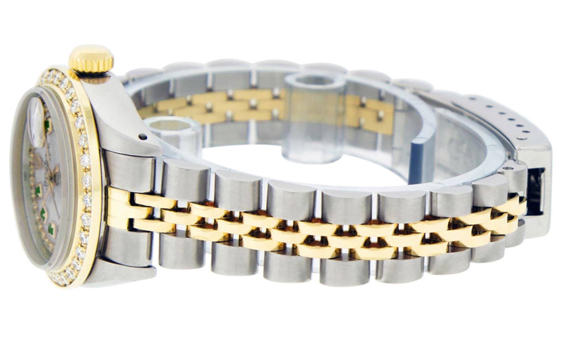 One Ladies 14K Two Tone Rolex Datejust Polished, Serviced & Electronically Tested, 14K Yellow Gold & Stainless Steel Case: 26mm, 14K Yellow Gold Crown, Custom Bezel: New 18K Yellow Gold Beadset Diamond Bezel, Diamond Count: 32 Diamonds In Bezel, Total Weight .70 Carat, Clarity: SI-VS, Color: G to H. Custom Crystal: New Synthetic Sapphire Cyclops Lens. Custom Hands: New Luminescent Hands. Movement: Automatic Winding Movement Caliber 2030. Custom Dial: Mother Of Pearl Emerald String Diamond Dial, Stone Count: 10 Emeralds + 33 Diamonds In Dial. Clarity: SI-VS, Color: G to H. Date Window: 3 O'Clock Position Date Display, Model: Datejust. Condition: G-6 Extra Fine. Bracelet: Two Tone 14K Yellow Gold & Stainless Steel Jubilee. Bright Polish. 6.0 Inch Length, Adjustable. Standard Clasp, With Rolex Logo. This Watch Has Been Serviced Time Tested And Is In Excellent Condition It Is Free Of All Scratches And Dents.
