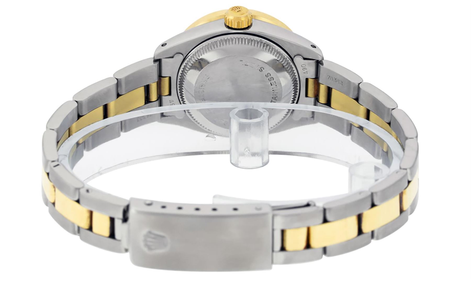 One Ladies 14K Two Tone Rolex Datejust Polished, Serviced & Electronically Tested, 14K Yellow Gold & Stainless Steel Case: 26mm, 14K Yellow Gold Crown, Custom Bezel: New 18K Yellow Gold Pyramid Diamond Bezel, Diamond Count: 24 Diamonds In Bezel. Total Weight .50 Carat, Clarity: SI-VS, Color: G to H. Custom Crystal: New Synthetic Sapphire Cyclops Lens. Custom Hands: New Luminescent Hands. Movement: Automatic Winding Movement Caliber 2030. Custom Dial: Mother Of Pearl With Synthetic Emeralds, Stone Count: 2 Synthetic Emeralds. Date Window: 3 O'Clock Position Date Display, Model: Datejust. Condition: G-6 Extra Fine. Bracelet: Two Tone 14K Yellow Gold & Stainless Steel Jubilee Band. Bright Polish. 6.0 Inch Length, Adjustable. Standard Clasp, With Rolex Logo. This Watch Has Been Serviced Time Tested And Is In Excellent Condition It Is Free Of All Scratches And Dents.