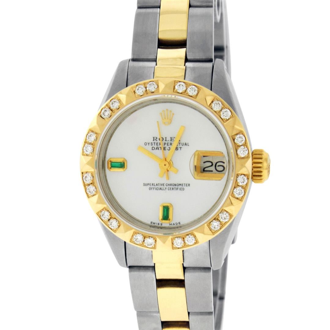 One Ladies 14K Two Tone Rolex Datejust Polished, Serviced & Electronically Tested, 14K Yellow Gold & Stainless Steel Case: 26mm, 14K Yellow Gold Crown, Custom Bezel: New 18K Yellow Gold Pyramid Diamond Bezel, Diamond Count: 24 Diamonds In Bezel. Total Weight .50 Carat, Clarity: SI-VS, Color: G to H. Custom Crystal: New Synthetic Sapphire Cyclops Lens. Custom Hands: New Luminescent Hands. Movement: Automatic Winding Movement Caliber 2030. Custom Dial: Mother Of Pearl With Synthetic Emeralds, Stone Count: 2 Synthetic Emeralds. Date Window: 3 O'Clock Position Date Display, Model: Datejust. Condition: G-6 Extra Fine. Bracelet: Two Tone 14K Yellow Gold & Stainless Steel Jubilee Band. Bright Polish. 6.0 Inch Length, Adjustable. Standard Clasp, With Rolex Logo. This Watch Has Been Serviced Time Tested And Is In Excellent Condition It Is Free Of All Scratches And Dents.