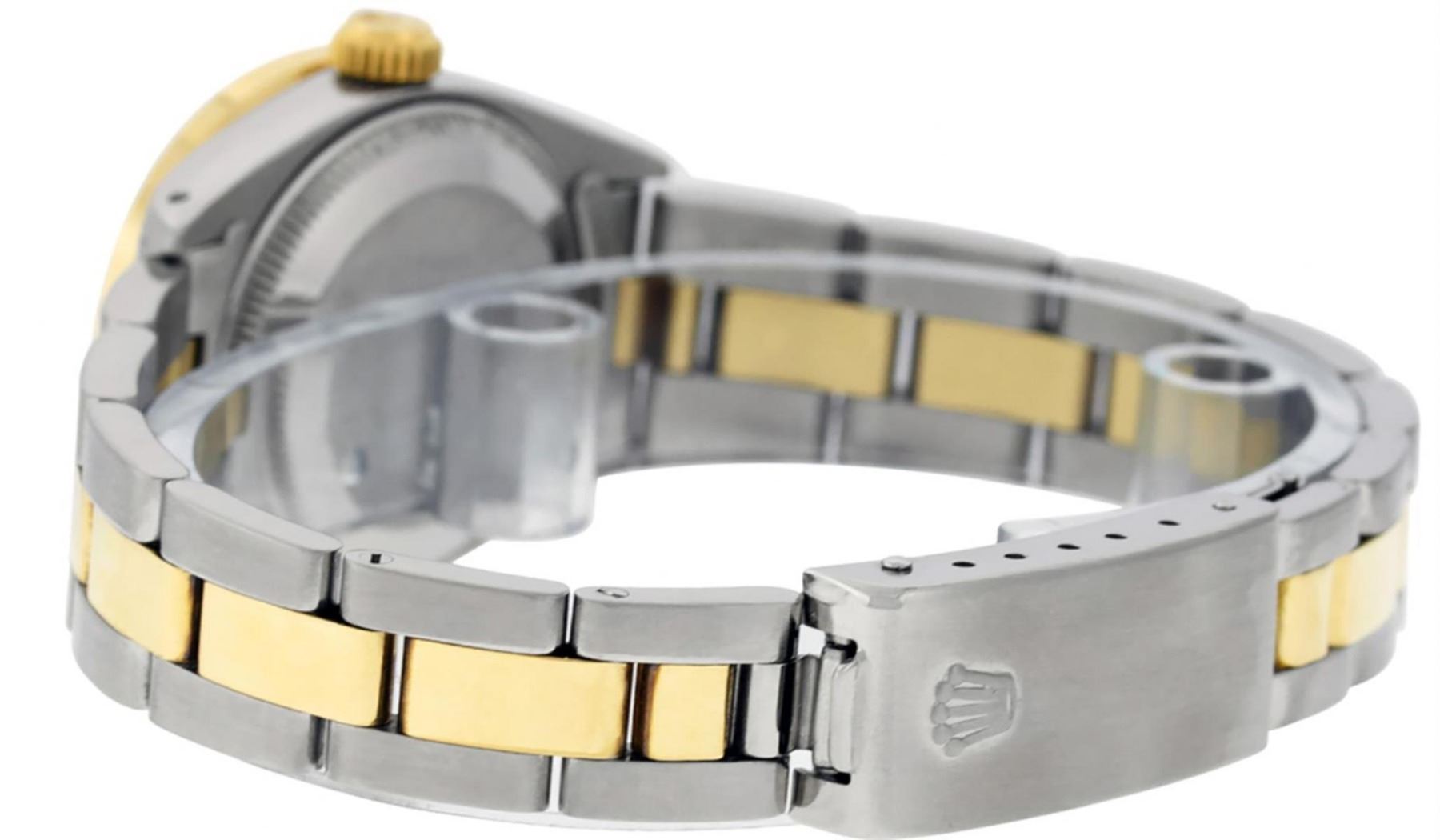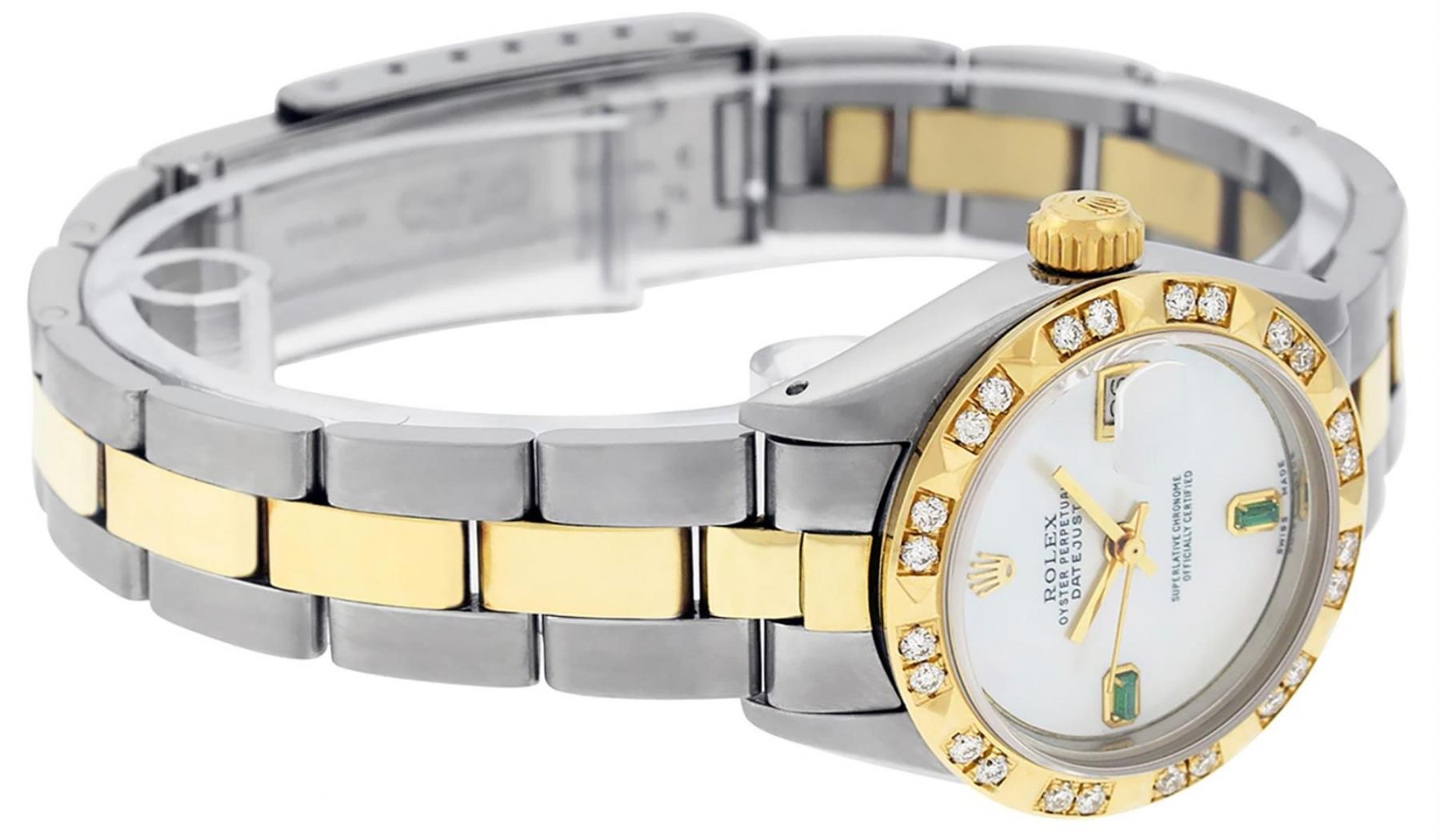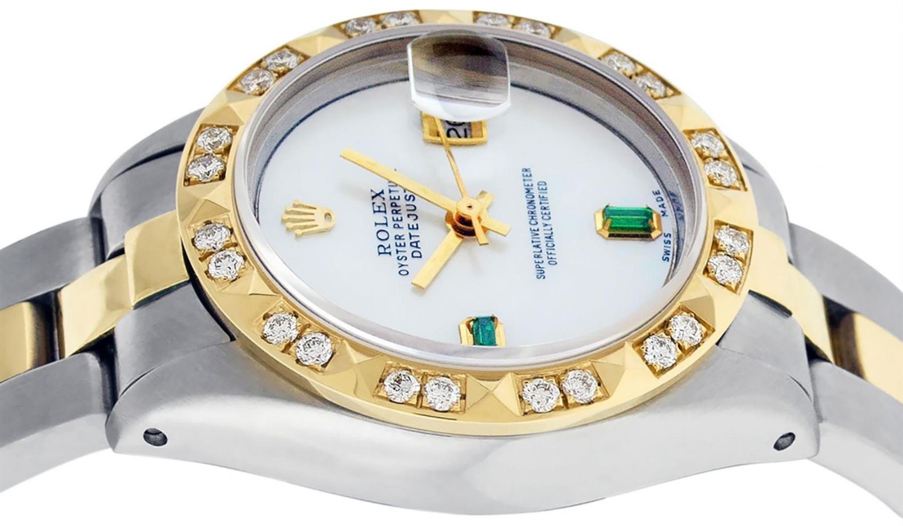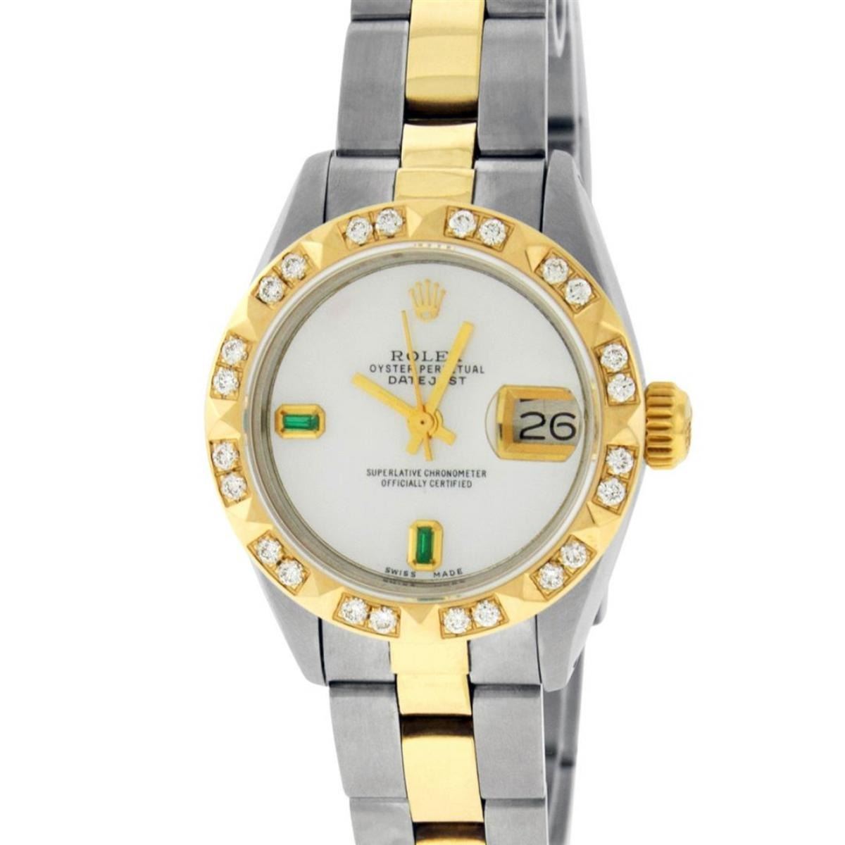 One Ladies 14K Two Tone Rolex Datejust Polished, Serviced & Electronically Tested, 14K Yellow Gold & Stainless Steel Case: 26mm, 14K Yellow Gold Crown, Custom Bezel: New 18K Yellow Gold Pyramid Diamond Bezel, Diamond Count: 24 Diamonds In Bezel. Total Weight .50 Carat, Clarity: SI-VS, Color: G to H. Custom Crystal: New Synthetic Sapphire Cyclops Lens. Custom Hands: New Luminescent Hands. Movement: Automatic Winding Movement Caliber 2030. Custom Dial: Mother Of Pearl With Synthetic Emeralds, Stone Count: 2 Synthetic Emeralds. Date Window: 3 O'Clock Position Date Display, Model: Datejust. Condition: G-6 Extra Fine. Bracelet: Two Tone 14K Yellow Gold & Stainless Steel Jubilee Band. Bright Polish. 6.0 Inch Length, Adjustable. Standard Clasp, With Rolex Logo. This Watch Has Been Serviced Time Tested And Is In Excellent Condition It Is Free Of All Scratches And Dents.