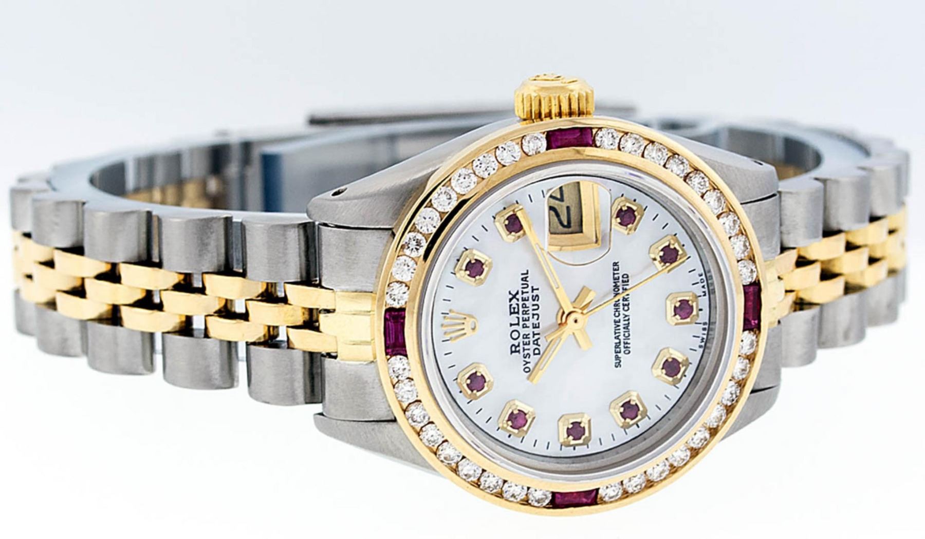 One Ladies 14K Two Tone Rolex Datejust Polished, Serviced & Electronically Tested, 14K Yellow Gold & Stainless Steel Case: 26mm, 14K Yellow Gold Crown, Custom Bezel: New 18K Yellow Gold Ruby Channel Set Diamond Bezel, Diamond + Gem Count:�36 Diamonds + 4 Rubies Total Weight 1.00 Carat, Clarity: SI-VS, Color: G to H. Custom Crystal: New Synthetic Sapphire Cyclops Lens. Custom Hands: New Luminescent Hands. Movement: Automatic Winding Movement Caliber 2030. Custom Dial: Mother Of Pearl with Ruby Hour Markers, Stone Count: 10 Rubies In Dial. Date Window: 3 O'Clock Position Date Display, Model: Datejust, Condition: G-6 Extra Fine. Bracelet: Two Tone 14K Yellow Gold & Stainless Steel Jubilee. Bright Polish.�6.0 Inch Length, Adjustable. Standard Clasp, With Rolex Logo. This Watch Has Been Serviced Time Tested And Is In Excellent Condition It Is Free Of All Scratches And Dents.