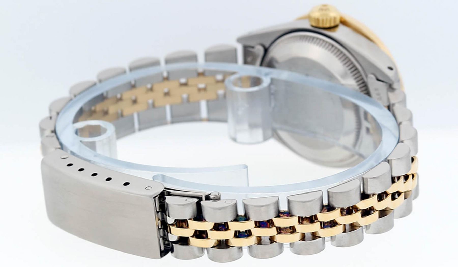 One Ladies 14K Two Tone Rolex Datejust Polished, Serviced & Electronically Tested, 14K Yellow Gold & Stainless Steel Case: 26mm, 14K Yellow Gold Crown, Custom Bezel: New 18K Yellow Gold Ruby Channel Set Diamond Bezel, Diamond + Gem Count: 36 Diamonds + 4 Rubies Total Weight 1.00 Carat, Clarity: SI-VS, Color: G to H. Custom Crystal: New Synthetic Sapphire Cyclops Lens. Custom Hands: New Luminescent Hands. Movement: Automatic Winding Movement Caliber 2030. Custom Dial: Mother Of Pearl with Ruby Hour Markers, Stone Count: 10 Rubies In Dial. Date Window: 3 O'Clock Position Date Display, Model: Datejust, Condition: G-6 Extra Fine. Bracelet: Two Tone 14K Yellow Gold & Stainless Steel Jubilee. Bright Polish. 6.0 Inch Length, Adjustable. Standard Clasp, With Rolex Logo. This Watch Has Been Serviced Time Tested And Is In Excellent Condition It Is Free Of All Scratches And Dents.