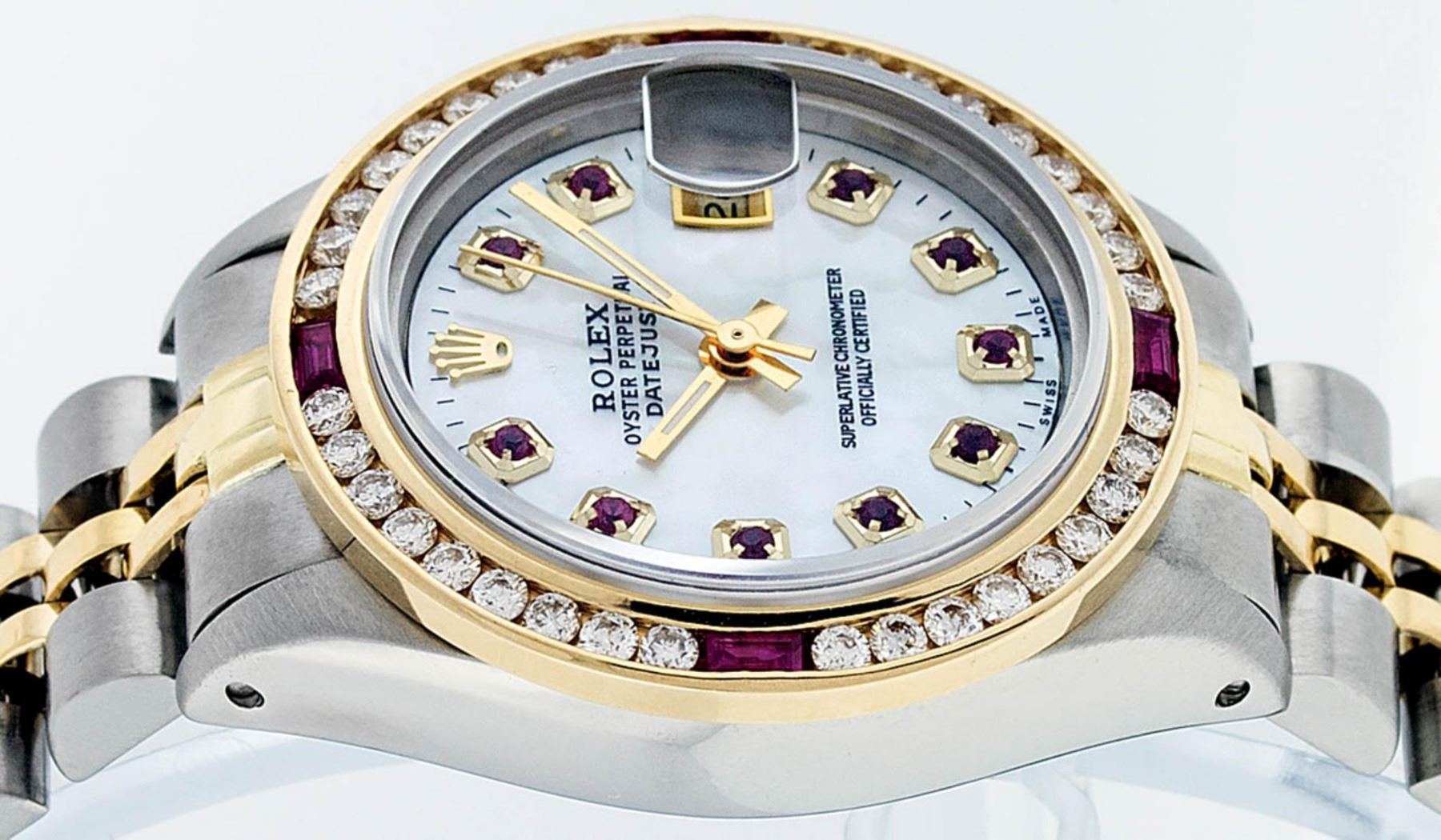 One Ladies 14K Two Tone Rolex Datejust Polished, Serviced & Electronically Tested, 14K Yellow Gold & Stainless Steel Case: 26mm, 14K Yellow Gold Crown, Custom Bezel: New 18K Yellow Gold Ruby Channel Set Diamond Bezel, Diamond + Gem Count: 36 Diamonds + 4 Rubies Total Weight 1.00 Carat, Clarity: SI-VS, Color: G to H. Custom Crystal: New Synthetic Sapphire Cyclops Lens. Custom Hands: New Luminescent Hands. Movement: Automatic Winding Movement Caliber 2030. Custom Dial: Mother Of Pearl with Ruby Hour Markers, Stone Count: 10 Rubies In Dial. Date Window: 3 O'Clock Position Date Display, Model: Datejust, Condition: G-6 Extra Fine. Bracelet: Two Tone 14K Yellow Gold & Stainless Steel Jubilee. Bright Polish. 6.0 Inch Length, Adjustable. Standard Clasp, With Rolex Logo. This Watch Has Been Serviced Time Tested And Is In Excellent Condition It Is Free Of All Scratches And Dents.