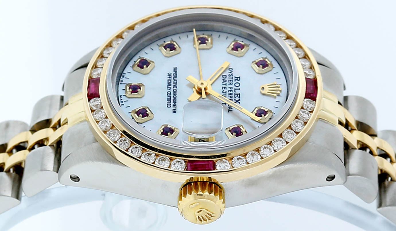 One Ladies 14K Two Tone Rolex Datejust Polished, Serviced & Electronically Tested, 14K Yellow Gold & Stainless Steel Case: 26mm, 14K Yellow Gold Crown, Custom Bezel: New 18K Yellow Gold Ruby Channel Set Diamond Bezel, Diamond + Gem Count: 36 Diamonds + 4 Rubies Total Weight 1.00 Carat, Clarity: SI-VS, Color: G to H. Custom Crystal: New Synthetic Sapphire Cyclops Lens. Custom Hands: New Luminescent Hands. Movement: Automatic Winding Movement Caliber 2030. Custom Dial: Mother Of Pearl with Ruby Hour Markers, Stone Count: 10 Rubies In Dial. Date Window: 3 O'Clock Position Date Display, Model: Datejust, Condition: G-6 Extra Fine. Bracelet: Two Tone 14K Yellow Gold & Stainless Steel Jubilee. Bright Polish. 6.0 Inch Length, Adjustable. Standard Clasp, With Rolex Logo. This Watch Has Been Serviced Time Tested And Is In Excellent Condition It Is Free Of All Scratches And Dents.