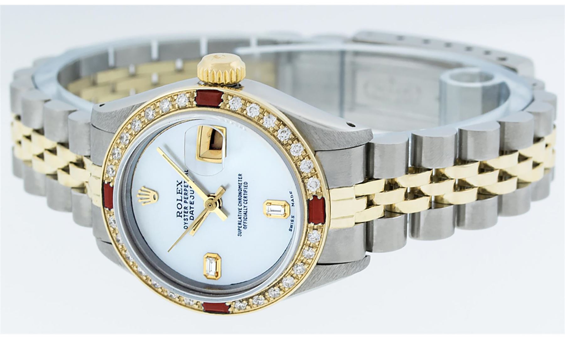 One Ladies 14K Two Tone Rolex Datejust Polished, Serviced & Electronically Tested, 14K Yellow Gold & Stainless Steel Case: 26mm, 14K Yellow Gold Crown, Custom Bezel: New 18K Yellow Gold Ruby Beadset Diamond Bezel, Diamond Count: 28 Diamonds + 4 Rubies In Bezel. Total Bezel Weight .70 Carat, Clarity: SI-VS, Color: G to H. Custom Crystal: New Scratch Resistant Synthetic Sapphire Cyclops Lens. Custom Hands: New Luminescent Hands. Movement: Automatic Winding Movement Caliber 2030. Custom Dial: Mother Of Pearl With Baguette Diamonds, Stone Count: 2 Baguettes. Date Window: 3 O'Clock Position Date Display, Model: Datejust. Condition: G-6 Extra Fine. Bracelet: Two Tone 14K Yellow Gold & Stainless Steel Jubilee Band. Bright Polish. 6.0 Inch Length, Adjustable. Standard Clasp, With Rolex Logo. This Watch Has Been Serviced Time Tested And Is In Excellent Condition It Is Free Of All Scratches And Dents.
