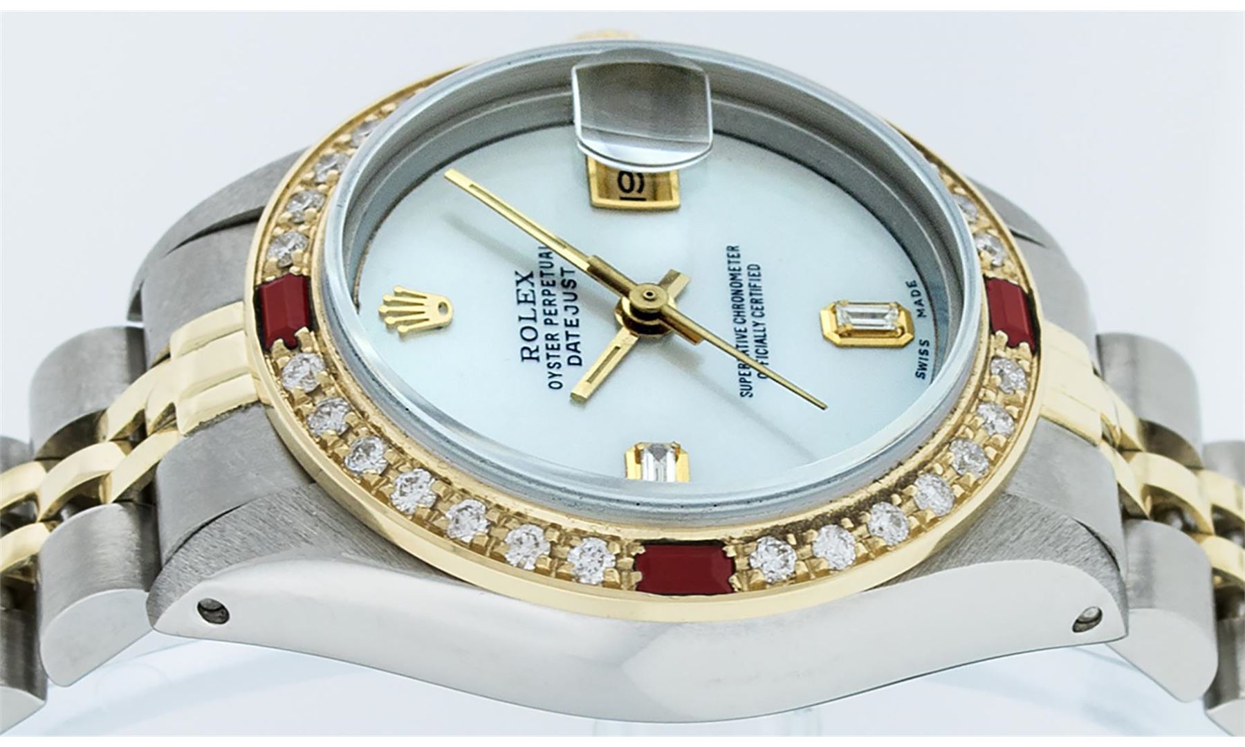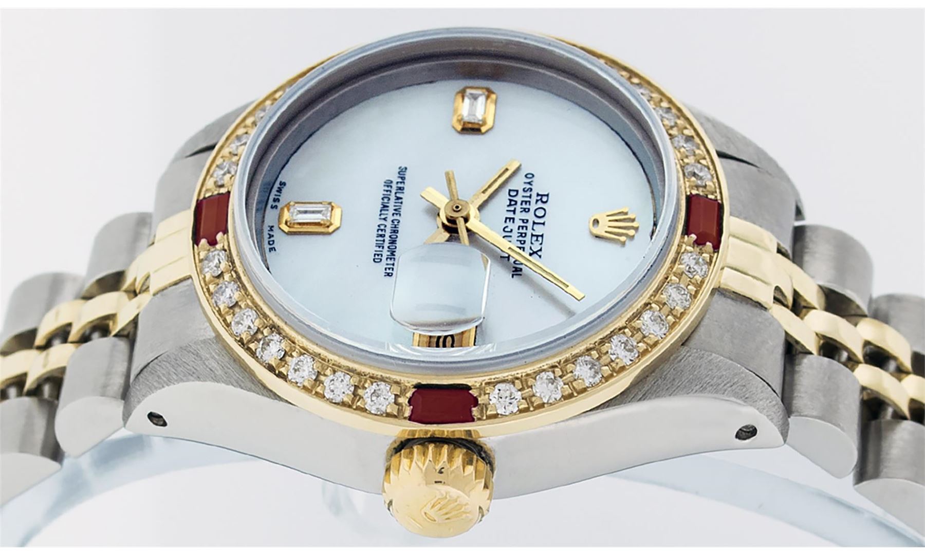 One Ladies 14K Two Tone Rolex Datejust Polished, Serviced & Electronically Tested, 14K Yellow Gold & Stainless Steel Case: 26mm, 14K Yellow Gold Crown, Custom Bezel: New 18K Yellow Gold Ruby Beadset Diamond Bezel, Diamond Count: 28 Diamonds + 4 Rubies In Bezel. Total Bezel Weight .70 Carat, Clarity: SI-VS, Color: G to H. Custom Crystal: New Scratch Resistant Synthetic Sapphire Cyclops Lens. Custom Hands: New Luminescent Hands. Movement: Automatic Winding Movement Caliber 2030. Custom Dial: Mother Of Pearl With Baguette Diamonds, Stone Count: 2 Baguettes. Date Window: 3 O'Clock Position Date Display, Model: Datejust. Condition: G-6 Extra Fine. Bracelet: Two Tone 14K Yellow Gold & Stainless Steel Jubilee Band. Bright Polish. 6.0 Inch Length, Adjustable. Standard Clasp, With Rolex Logo. This Watch Has Been Serviced Time Tested And Is In Excellent Condition It Is Free Of All Scratches And Dents.