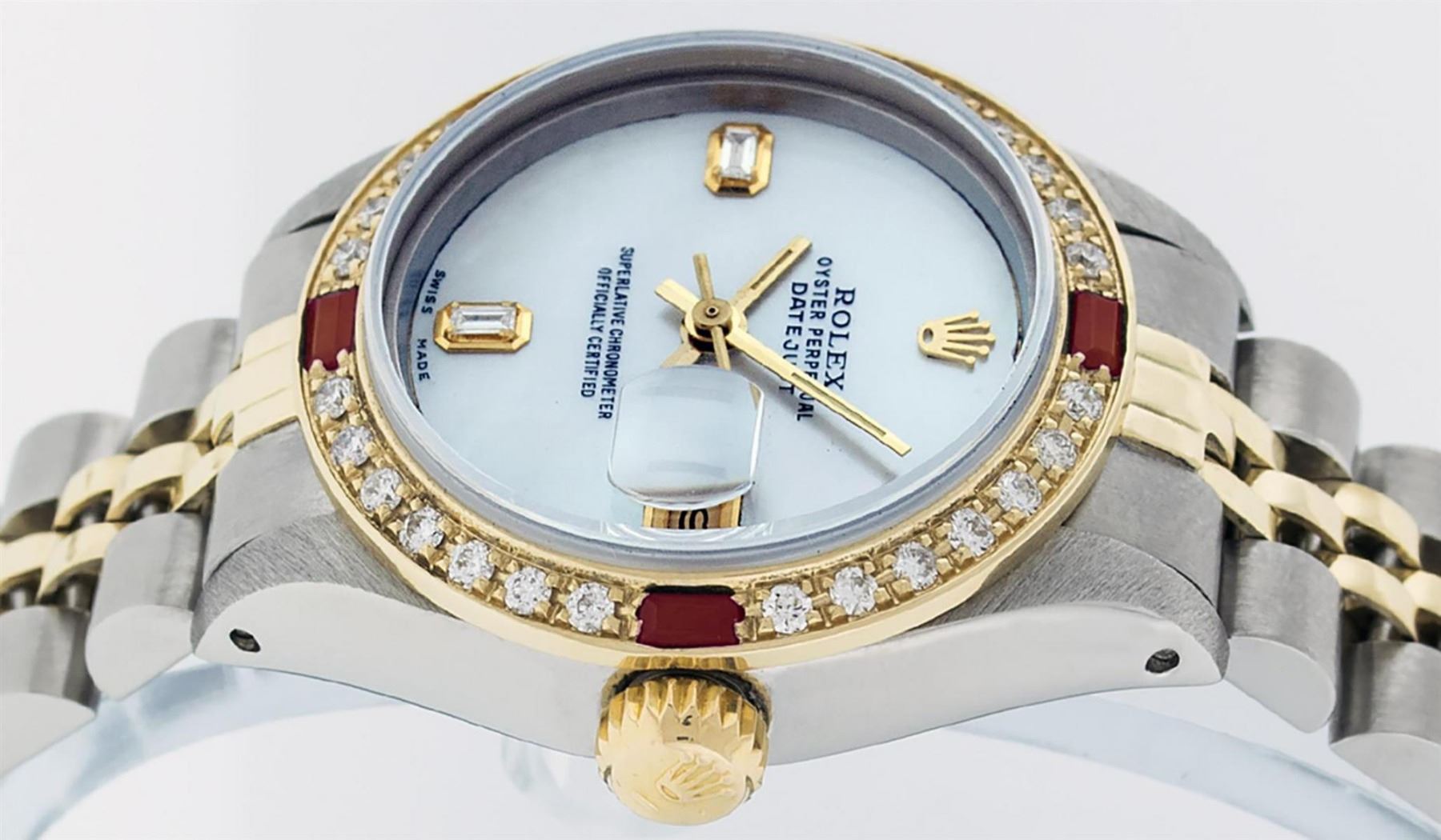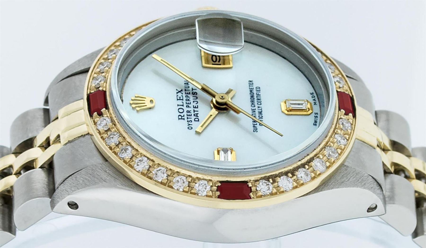 One Ladies 14K Two Tone Rolex Datejust Polished, Serviced & Electronically Tested, 14K Yellow Gold & Stainless Steel Case: 26mm, 14K Yellow Gold Crown, Custom Bezel: New 18K Yellow Gold Ruby Beadset Diamond Bezel, Diamond Count: 28 Diamonds + 4 Rubies In Bezel. Total Bezel Weight .70 Carat, Clarity: SI-VS, Color: G to H. Custom Crystal: New Scratch Resistant Synthetic Sapphire Cyclops Lens. Custom Hands: New Luminescent Hands. Movement: Automatic Winding Movement Caliber 2030. Custom Dial: Mother Of Pearl With Baguette Diamonds, Stone Count: 2 Baguettes. Date Window: 3 O'Clock Position Date Display, Model: Datejust. Condition: G-6 Extra Fine. Bracelet: Two Tone 14K Yellow Gold & Stainless Steel Jubilee Band. Bright Polish. 6.0 Inch Length, Adjustable. Standard Clasp, With Rolex Logo. This Watch Has Been Serviced Time Tested And Is In Excellent Condition It Is Free Of All Scratches And Dents.