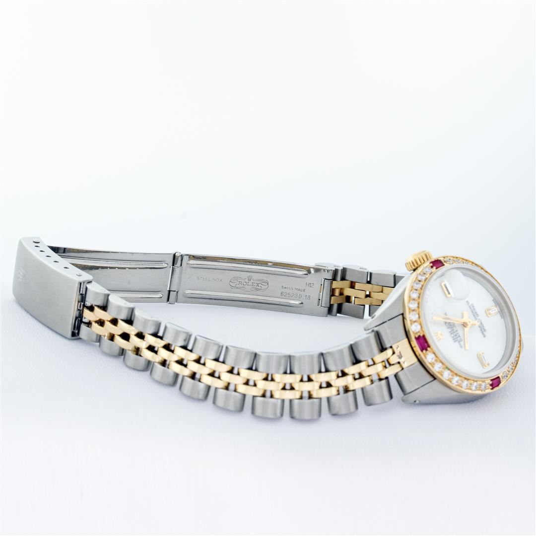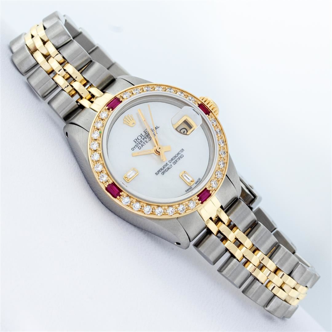 One Ladies 14K Two Tone Rolex Datejust Polished, Serviced & Electronically Tested, 14K Yellow Gold & Stainless Steel Case: 26mm, 14K Yellow Gold Crown, Custom Bezel: New 18K Yellow Gold Ruby Beadset Diamond Bezel, Diamond Count: 28 Diamonds + 4 Rubies In Bezel. Total Bezel Weight .70 Carat, Clarity: SI-VS, Color: G to H. Custom Crystal: New Scratch Resistant Synthetic Sapphire Cyclops Lens. Custom Hands: New Luminescent Hands. Movement: Automatic Winding Movement Caliber 2030. Custom Dial: Mother Of Pearl With Baguette Diamonds, Stone Count: 2 Baguettes. Date Window: 3 O'Clock Position Date Display, Model: Datejust. Condition: G-6 Extra Fine. Bracelet: Two Tone 14K Yellow Gold & Stainless Steel Jubilee Band. Bright Polish. 6.0 Inch Length, Adjustable. Standard Clasp, With Rolex Logo. This Watch Has Been Serviced Time Tested And Is In Excellent Condition It Is Free Of All Scratches And Dents.