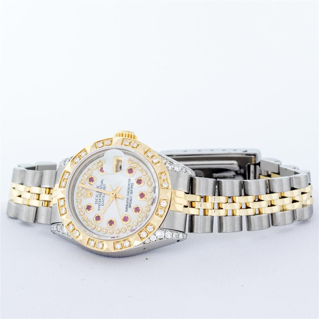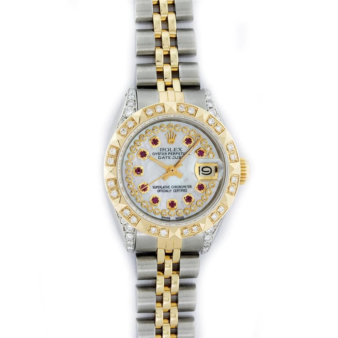 One Ladies 14K Two Tone Rolex Datejust Polished, Serviced & Electronically Tested, 14K Yellow Gold & Stainless Steel Case: 26mm, 14K Yellow Gold Crown, Diamond Lugs: 24 Diamonds On Lugs, Clarity: SI-VS, Color: G to H, Clarity SI-VS. Custom Bezel: New 18K Yellow Gold Pyramid Diamond Bezel, Diamond Count: 24 Diamonds, Total Weight .50 Carat, Clarity: SI-VS, Color: G to H. Custom Crystal: New Synthetic Scratch Resistant Sapphire Cyclops Lens. Custom Hands: New Luminescent Hands. Movement: Automatic Winding Movement Caliber 2030. Custom Dial: Mother Of Pearl With Ruby Hour Markers, Stone Count: 10 Rubies + 33 Diamonds In Dial, Clarity: SI-VS, Color: G to H. Date Window: 3 O'Clock Position Date Display, Model: Datejust. Condition: G-6 Extra Fine. Bracelet: Two Tone 14K Yellow Gold & Stainless Steel Jubilee. Bright Polish. 6.0 Inch Length, Adjustable. Standard Clasp, With Rolex Logo. This Watch Has Been Serviced Time Tested And Is In Excellent Condition It Is Free Of All Scratches And Dents.