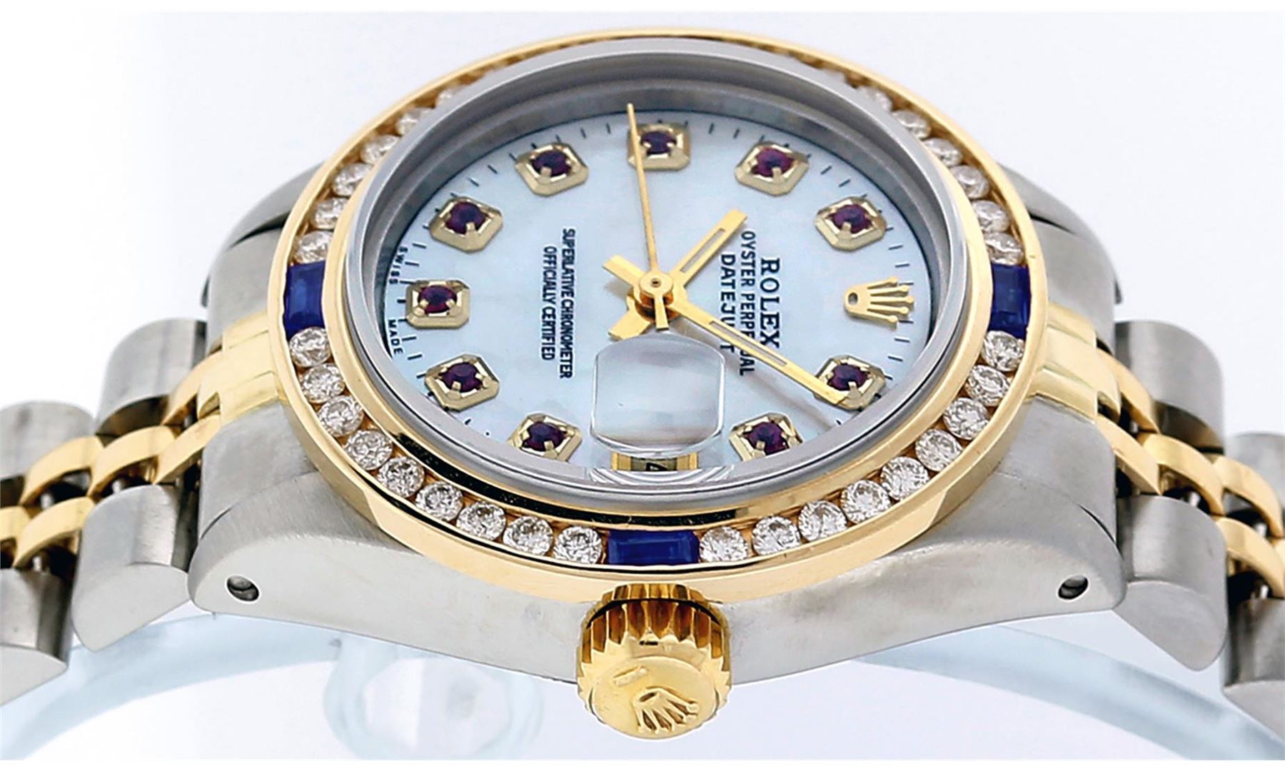 One Ladies 14K Two Tone Rolex Datejust Polished, Serviced & Electronically Tested, 14K Yellow Gold & Stainless Steel Case: 26mm, 14K Yellow Gold Crown, Custom Bezel: New 18K Yellow Gold Sapphire Channel Set Diamond Bezel, Diamond + Gem Count: 36 Diamonds + 4 Sapphires, Total Weight 1.00 Carat, Clarity: SI-VS, Color: G to H. Custom Crystal: New Scratch Resistant Synthetic Sapphire Cyclops Lens. Custom Hands: New Luminescent Hands. Movement: Automatic Winding Movement Caliber 2030. Custom Dial: Mother Of Pearl with Ruby Hour Markers And Dash Tracks, Stone Count: 10 Rubies In Dial. Date Window: 3 O'Clock Position Date Display, Model: Datejust, Condition: G-6 Extra Fine. Bracelet: Two Tone 14K Yellow Gold & Stainless Steel Jubilee. Bright Polish. 6.0 Inch Length, Adjustable. Standard Clasp, With Rolex Logo. This Watch Has Been Serviced Time Tested And Is In Excellent Condition It Is Free Of All Scratches And Dents.