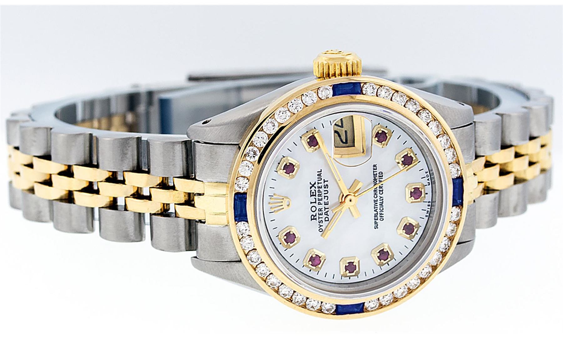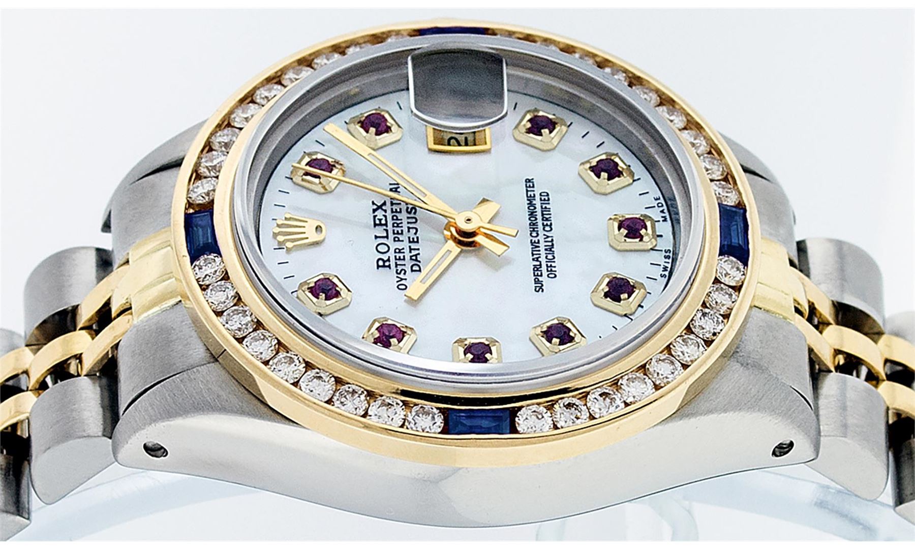 One Ladies 14K Two Tone Rolex Datejust Polished, Serviced & Electronically Tested, 14K Yellow Gold & Stainless Steel Case: 26mm, 14K Yellow Gold Crown, Custom Bezel: New 18K Yellow Gold Sapphire Channel Set Diamond Bezel, Diamond + Gem Count: 36 Diamonds + 4 Sapphires, Total Weight 1.00 Carat, Clarity: SI-VS, Color: G to H. Custom Crystal: New Scratch Resistant Synthetic Sapphire Cyclops Lens. Custom Hands: New Luminescent Hands. Movement: Automatic Winding Movement Caliber 2030. Custom Dial: Mother Of Pearl with Ruby Hour Markers And Dash Tracks, Stone Count: 10 Rubies In Dial. Date Window: 3 O'Clock Position Date Display, Model: Datejust, Condition: G-6 Extra Fine. Bracelet: Two Tone 14K Yellow Gold & Stainless Steel Jubilee. Bright Polish. 6.0 Inch Length, Adjustable. Standard Clasp, With Rolex Logo. This Watch Has Been Serviced Time Tested And Is In Excellent Condition It Is Free Of All Scratches And Dents.