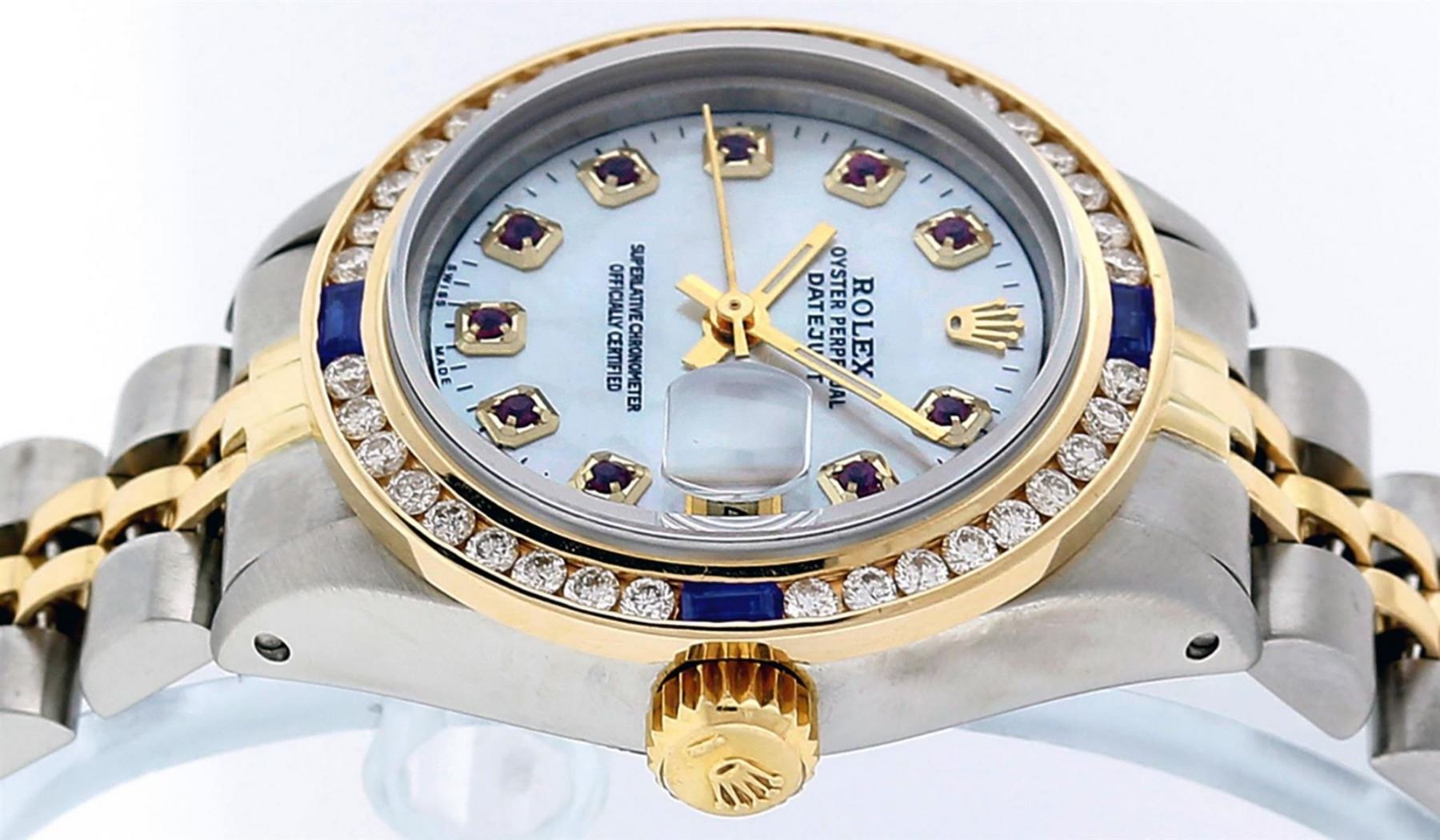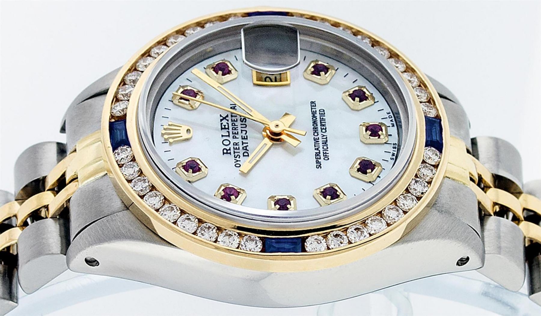 One Ladies 14K Two Tone Rolex Datejust Polished, Serviced & Electronically Tested, 14K Yellow Gold & Stainless Steel Case: 26mm, 14K Yellow Gold Crown, Custom Bezel: New 18K Yellow Gold Sapphire Channel Set Diamond Bezel, Diamond + Gem Count: 36 Diamonds + 4 Sapphires, Total Weight 1.00 Carat, Clarity: SI-VS, Color: G to H. Custom Crystal: New Scratch Resistant Synthetic Sapphire Cyclops Lens. Custom Hands: New Luminescent Hands. Movement: Automatic Winding Movement Caliber 2030. Custom Dial: Mother Of Pearl with Ruby Hour Markers And Dash Tracks, Stone Count: 10 Rubies In Dial. Date Window: 3 O'Clock Position Date Display, Model: Datejust, Condition: G-6 Extra Fine. Bracelet: Two Tone 14K Yellow Gold & Stainless Steel Jubilee. Bright Polish. 6.0 Inch Length, Adjustable. Standard Clasp, With Rolex Logo. This Watch Has Been Serviced Time Tested And Is In Excellent Condition It Is Free Of All Scratches And Dents.