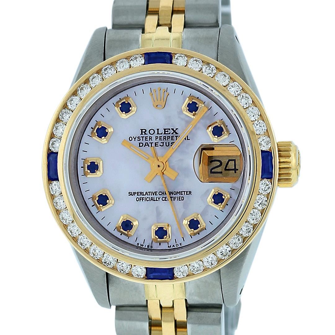 One Ladies 14K Two Tone Rolex Datejust Polished, Serviced & Electronically Tested, 14K Yellow Gold & Stainless Steel Case: 26mm, 14K Yellow Gold Crown, Custom Bezel: New 18K Yellow Gold Sapphire Channel Set Diamond Bezel, Diamond + Gem Count: 36 Diamonds + 4 Sapphires, Total Weight 1.00 Carat, Clarity: SI-VS, Color: G to H. Custom Crystal: New Scratch Resistant Synthetic Sapphire Cyclops Lens. Custom Hands: New Luminescent Hands. Movement: Automatic Winding Movement Caliber 2030. Custom Dial: Mother Of Pearl with Sapphire Hour Markers And Dash Tracks, Stone Count: 10 Sapphires In Dial. Date Window: 3 O'Clock Position Date Display, Model: Datejust, Condition: G-6 Extra Fine. Bracelet: Two Tone 14K Yellow Gold & Stainless Steel Jubilee. Bright Polish. 6.0 Inch Length, Adjustable. Standard Clasp, With Rolex Logo. This Watch Has Been Serviced Time Tested And Is In Excellent Condition It Is Free Of All Scratches And Dents.