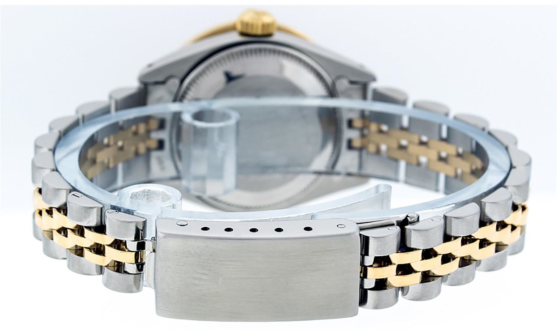 One Ladies 14K Two Tone Rolex Datejust Polished, Serviced & Electronically Tested, 14K Yellow Gold & Stainless Steel Case: 26mm, 14K Yellow Gold Crown, Custom Bezel: New 18K Yellow Gold Sapphire Channel Set Diamond Bezel, Diamond + Gem Count: 36 Diamonds + 4 Sapphires, Total Weight 1.00 Carat, Clarity: SI-VS, Color: G to H. Custom Crystal: New Scratch Resistant Synthetic Sapphire Cyclops Lens. Custom Hands: New Luminescent Hands. Movement: Automatic Winding Movement Caliber 2030. Custom Dial: Mother Of Pearl with Sapphire Hour Markers And Dash Tracks, Stone Count: 10 Sapphires In Dial. Date Window: 3 O'Clock Position Date Display, Model: Datejust, Condition: G-6 Extra Fine. Bracelet: Two Tone 14K Yellow Gold & Stainless Steel Jubilee. Bright Polish. 6.0 Inch Length, Adjustable. Standard Clasp, With Rolex Logo. This Watch Has Been Serviced Time Tested And Is In Excellent Condition It Is Free Of All Scratches And Dents.