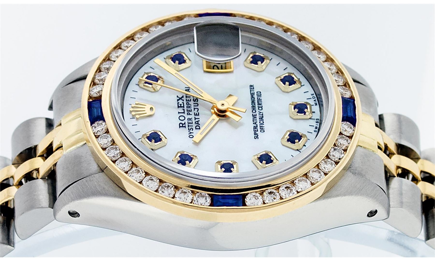 One Ladies 14K Two Tone Rolex Datejust Polished, Serviced & Electronically Tested, 14K Yellow Gold & Stainless Steel Case: 26mm, 14K Yellow Gold Crown, Custom Bezel: New 18K Yellow Gold Sapphire Channel Set Diamond Bezel, Diamond + Gem Count: 36 Diamonds + 4 Sapphires, Total Weight 1.00 Carat, Clarity: SI-VS, Color: G to H. Custom Crystal: New Scratch Resistant Synthetic Sapphire Cyclops Lens. Custom Hands: New Luminescent Hands. Movement: Automatic Winding Movement Caliber 2030. Custom Dial: Mother Of Pearl with Sapphire Hour Markers And Dash Tracks, Stone Count: 10 Sapphires In Dial. Date Window: 3 O'Clock Position Date Display, Model: Datejust, Condition: G-6 Extra Fine. Bracelet: Two Tone 14K Yellow Gold & Stainless Steel Jubilee. Bright Polish. 6.0 Inch Length, Adjustable. Standard Clasp, With Rolex Logo. This Watch Has Been Serviced Time Tested And Is In Excellent Condition It Is Free Of All Scratches And Dents.