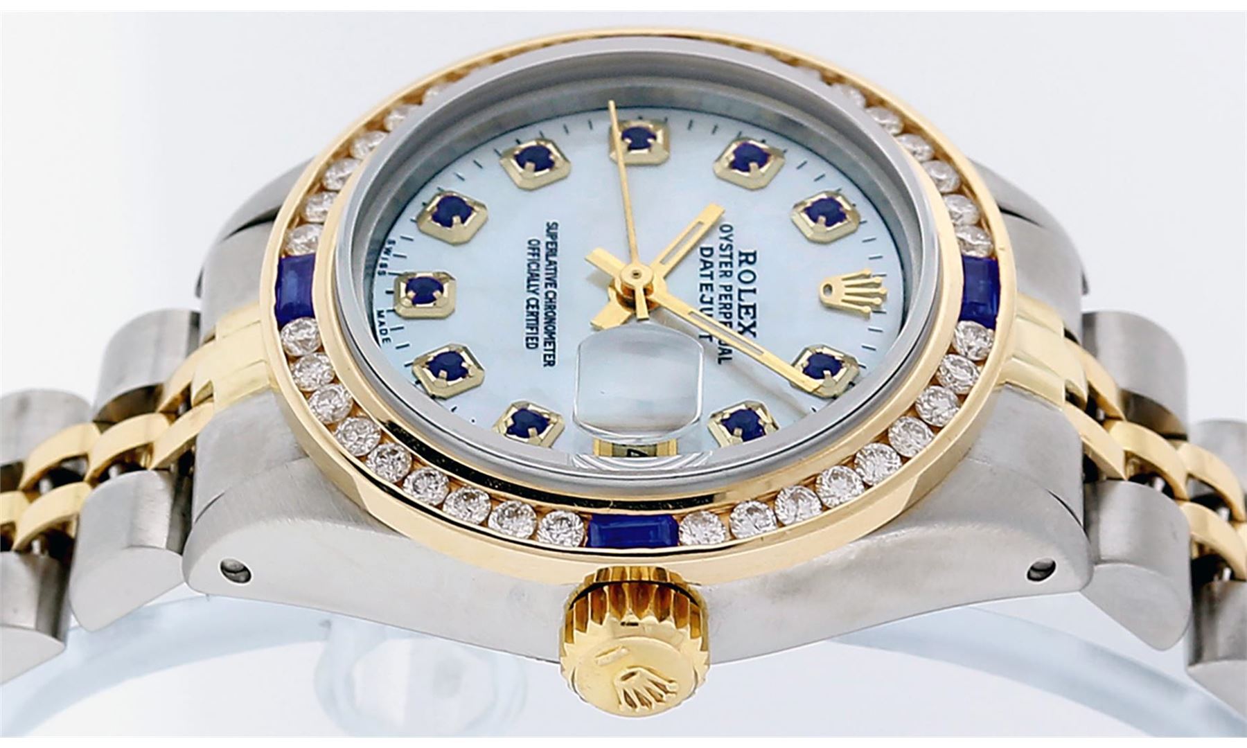 One Ladies 14K Two Tone Rolex Datejust Polished, Serviced & Electronically Tested, 14K Yellow Gold & Stainless Steel Case: 26mm, 14K Yellow Gold Crown, Custom Bezel: New 18K Yellow Gold Sapphire Channel Set Diamond Bezel, Diamond + Gem Count: 36 Diamonds + 4 Sapphires, Total Weight 1.00 Carat, Clarity: SI-VS, Color: G to H. Custom Crystal: New Scratch Resistant Synthetic Sapphire Cyclops Lens. Custom Hands: New Luminescent Hands. Movement: Automatic Winding Movement Caliber 2030. Custom Dial: Mother Of Pearl with Sapphire Hour Markers And Dash Tracks, Stone Count: 10 Sapphires In Dial. Date Window: 3 O'Clock Position Date Display, Model: Datejust, Condition: G-6 Extra Fine. Bracelet: Two Tone 14K Yellow Gold & Stainless Steel Jubilee. Bright Polish. 6.0 Inch Length, Adjustable. Standard Clasp, With Rolex Logo. This Watch Has Been Serviced Time Tested And Is In Excellent Condition It Is Free Of All Scratches And Dents.