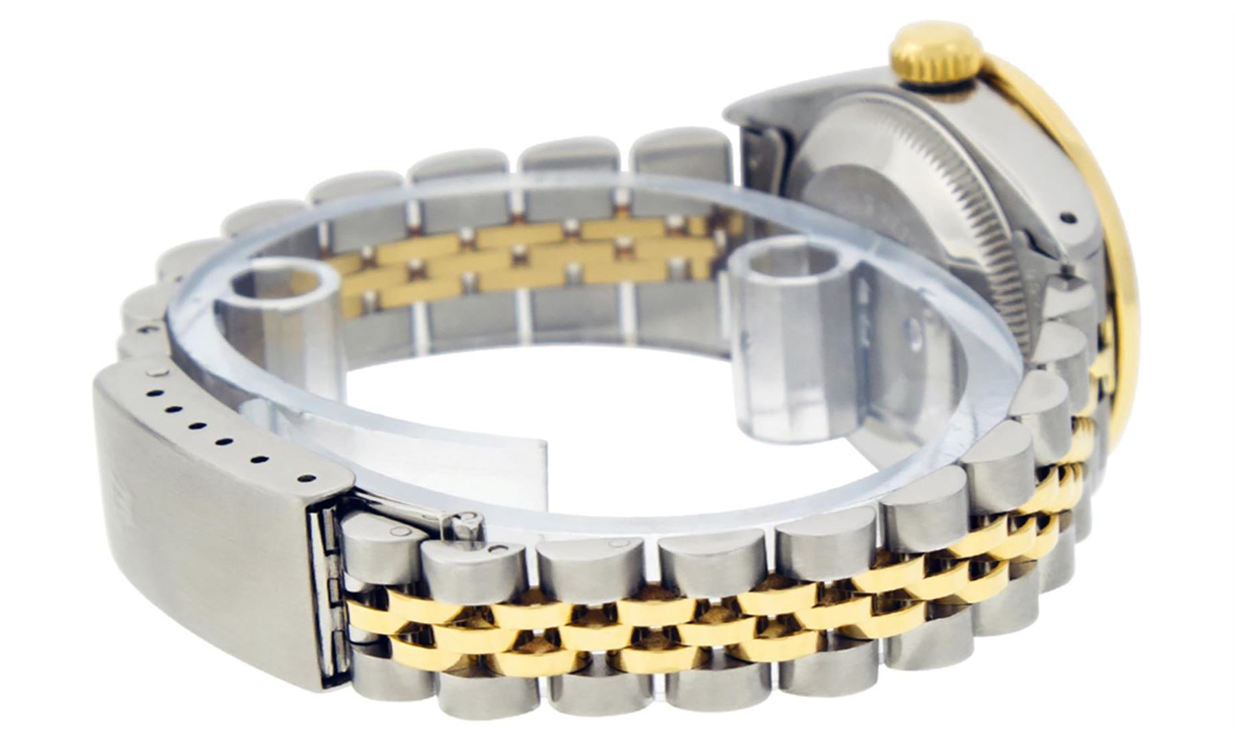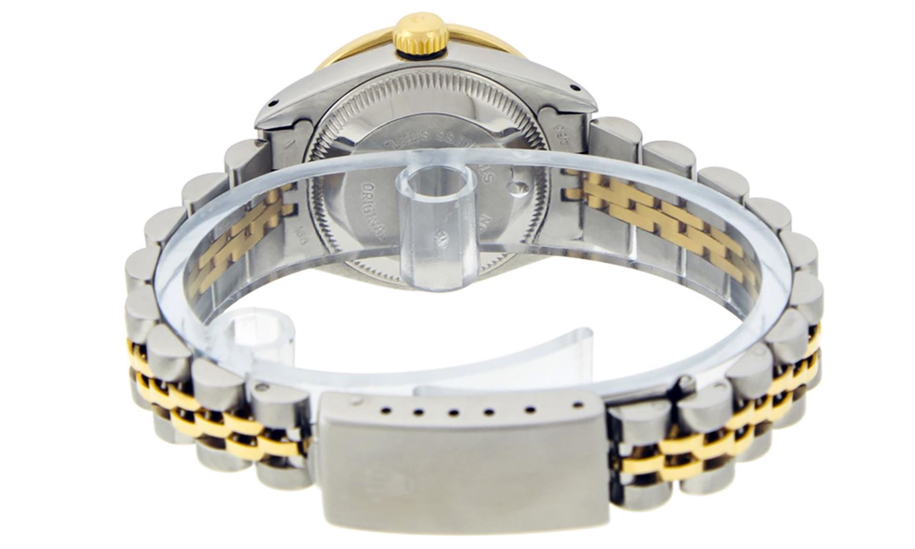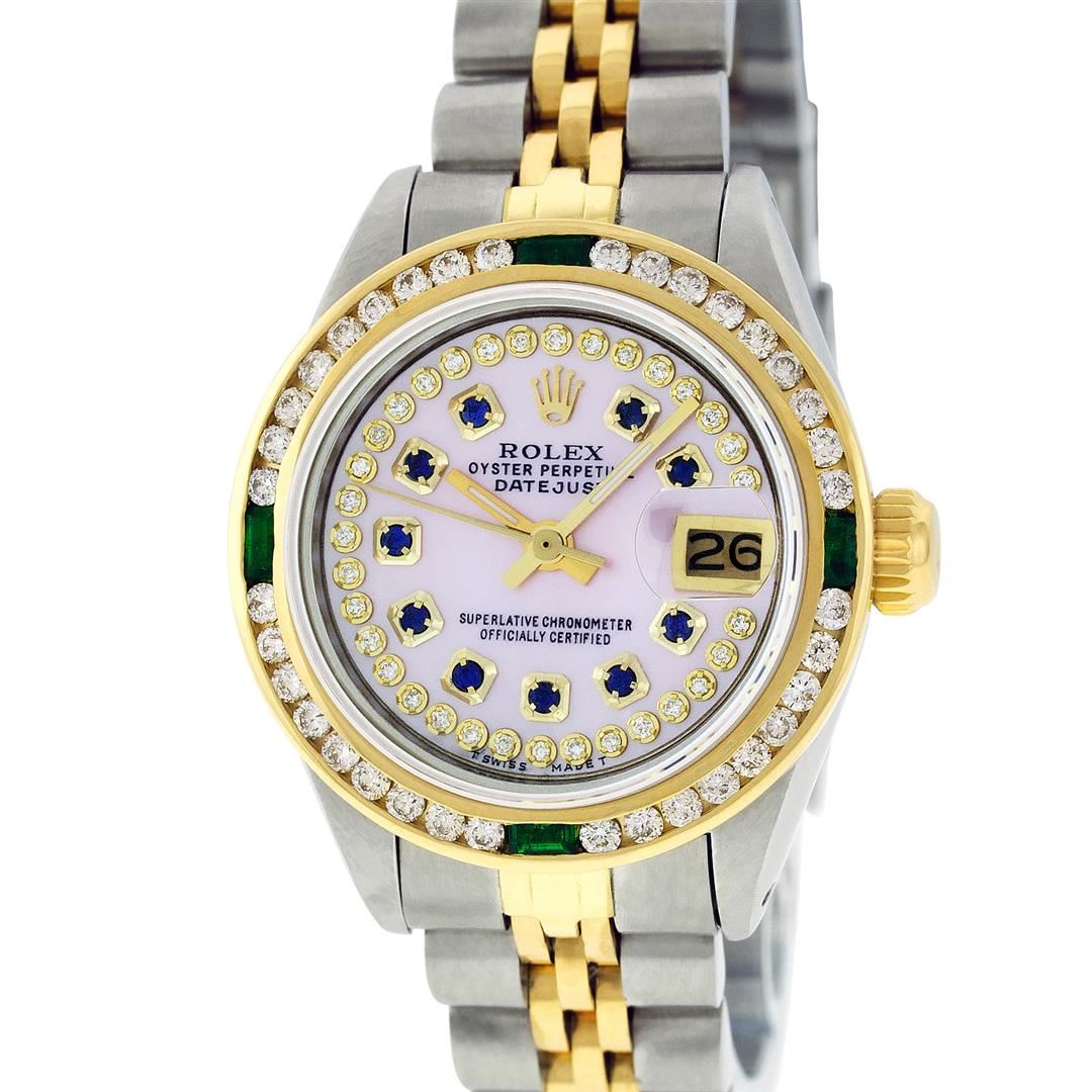One Ladies 14K Two Tone Rolex Datejust Polished, Serviced & Electronically Tested, 14K Yellow Gold & Stainless Steel Case: 26mm, 14K Yellow Gold Crown, Custom Bezel: New 18K Yellow Gold Emerald Channel Set Diamond Bezel, Diamond + Gem Count: 36 Diamonds + 4 Synthetic Emeralds, Total Weight 1.00 Carat, Clarity: SI-VS, Color: G to H. Custom Crystal: New Synthetic Sapphire Cyclops Lens. Custom Hands: New Luminescent Hands. Movement: Automatic Winding Movement Caliber 2030. Custom Dial: Pink Mother Of Pearl with Sapphire Diamond Hour Markers, Stone Count: 10 Sapphires + 33 Diamonds In Dial. Date Window: 3 O'Clock Position Date Display, Model: Datejust, Condition: G-6 Extra Fine. Bracelet: Two Tone 14K Yellow Gold & Stainless Steel Jubilee. Bright Polish. 6.0 Inch Length, Adjustable. Standard Clasp, With Rolex Logo. This Watch Has Been Serviced Time Tested And Is In Excellent Condition It Is Free Of All Scratches And Dents.