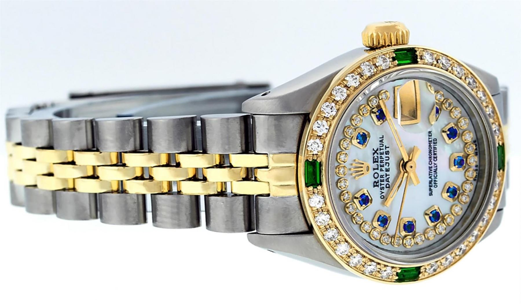 One Ladies 14K Two Tone Rolex Datejust Polished, Serviced & Electronically Tested, 14K Yellow Gold & Stainless Steel Case: 26mm, 14K Yellow Gold Crown, Custom Bezel: New 18K New Yellow Gold Emerald Beadset Diamond Bezel, Diamond Count: 28 Diamonds + 4 Emeralds In Dial, Total Weight .70 Carat, Clarity: SI-VS, Color: G to H. Custom Crystal: New Scratch Resistant Synthetic Sapphire Cyclops Lens. Custom Hands: New Luminescent Hands. Movement: Automatic Winding Movement Caliber 2030. Custom Dial: Mother Of Pearl Sapphire String Diamond Dial, Stone Count: 10 Sapphires + 33 Diamonds In Dial, Clarity: SI-VS, Color: G to H. Date Window: 3 O'Clock Position Date Display, Model: Datejust. Condition: G-6 Extra Fine. Bracelet: Two Tone 14K Yellow Gold & Stainless Steel Jubilee Band. Bright Polish. 6.0 Inch Length, Adjustable. Standard Clasp, With Rolex Logo. This Watch Has Been Serviced Time Tested And Is In Excellent Condition It Is Free Of All Scratches And Dents.
