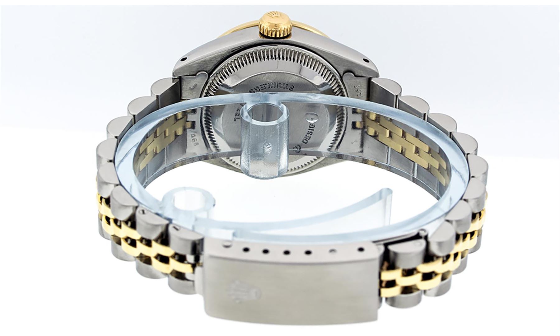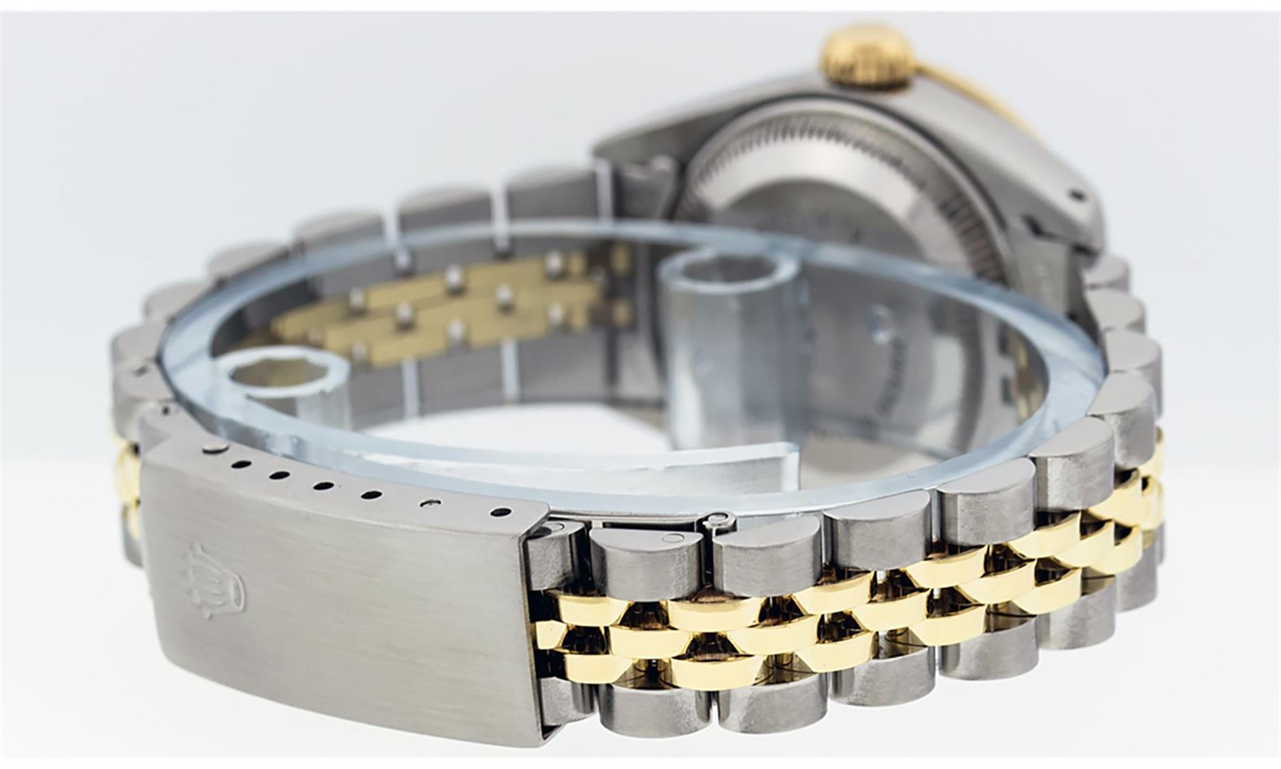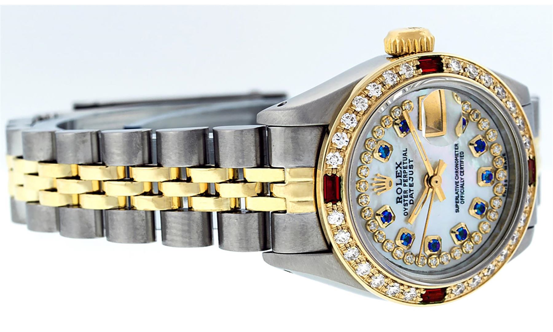 One Ladies 14K Two Tone Rolex Datejust Polished, Serviced & Electronically Tested, 14K Yellow Gold & Stainless Steel Case: 26mm, 14K Yellow Gold Crown, Custom Bezel: New 18K New Yellow Gold Ruby Beadset Diamond Bezel, Diamond Count: 28 Diamonds + 4 Rubies In Dial, Total Weight .70 Carat, Clarity: SI-VS, Color: G to H. Custom Crystal: New Scratch Resistant Synthetic Sapphire Cyclops Lens. Custom Hands: New Luminescent Hands. Movement: Automatic Winding Movement Caliber 2030. Custom Dial: Mother Of Pearl Sapphire String Diamond Dial, Stone Count: 10 Sapphires + 33 Diamonds In Dial, Clarity: SI-VS, Color: G to H. Date Window: 3 O'Clock Position Date Display, Model: Datejust. Condition: G-6 Extra Fine. Bracelet: Two Tone 14K Yellow Gold & Stainless Steel Jubilee Band. Bright Polish. 6.0 Inch Length, Adjustable. Standard Clasp, With Rolex Logo. This Watch Has Been Serviced Time Tested And Is In Excellent Condition It Is Free Of All Scratches And Dents.