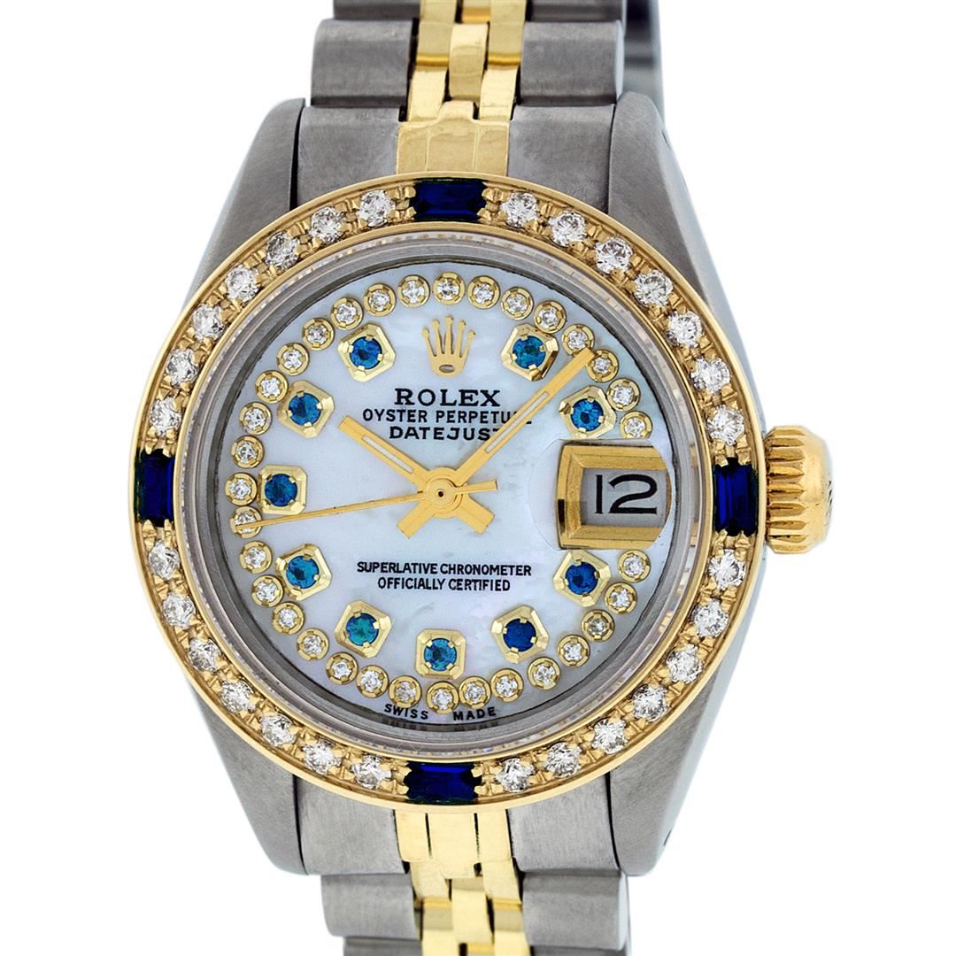 One Ladies 14K Two Tone Rolex Datejust Polished, Serviced & Electronically Tested, 14K Yellow Gold & Stainless Steel Case: 26mm, 14K Yellow Gold Crown, Custom Bezel: New 18K New Yellow Gold Sapphire Beadset Diamond Bezel, Diamond Count: 28 Diamonds + 4 Sapphires In Dial, Total Weight .70 Carat, Clarity: SI-VS, Color: G to H. Custom Crystal: New Scratch Resistant Synthetic Sapphire Cyclops Lens. Custom Hands: New Luminescent Hands. Movement: Automatic Winding Movement Caliber 2030. Custom Dial: Mother Of Pearl Sapphire String Diamond Dial, Stone Count: 10 Sapphires + 33 Diamonds In Dial, Clarity: SI-VS, Color: G to H. Date Window: 3 O'Clock Position Date Display, Model: Datejust. Condition: G-6 Extra Fine. Bracelet: Two Tone 14K Yellow Gold & Stainless Steel Jubilee Band. Bright Polish. 6.0 Inch Length, Adjustable. Standard Clasp, With Rolex Logo. This Watch Has Been Serviced Time Tested And Is In Excellent Condition It Is Free Of All Scratches And Dents.