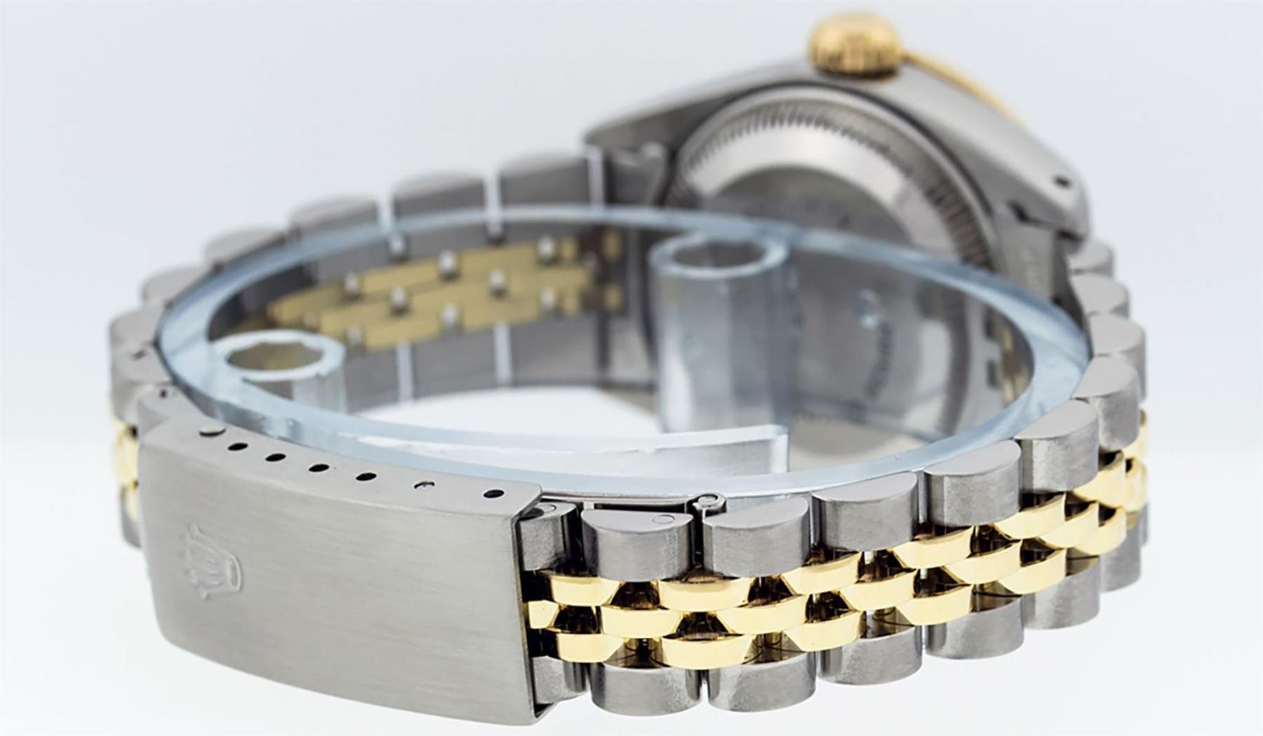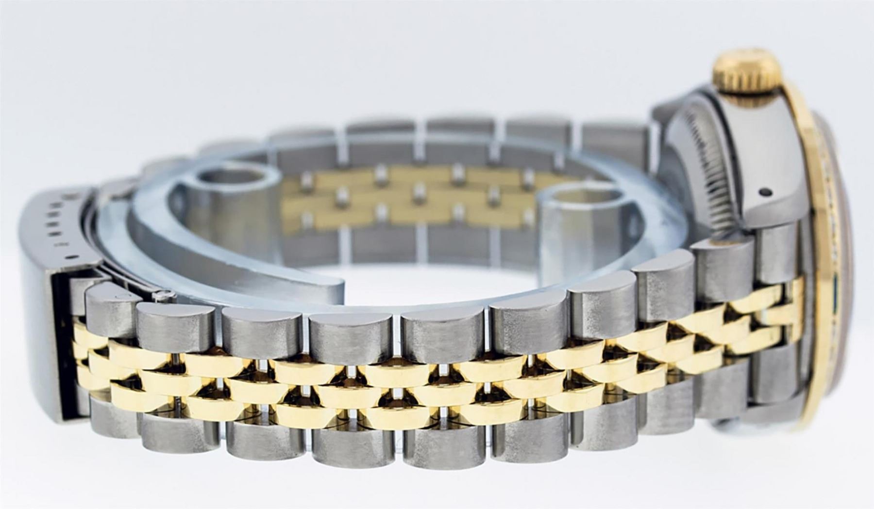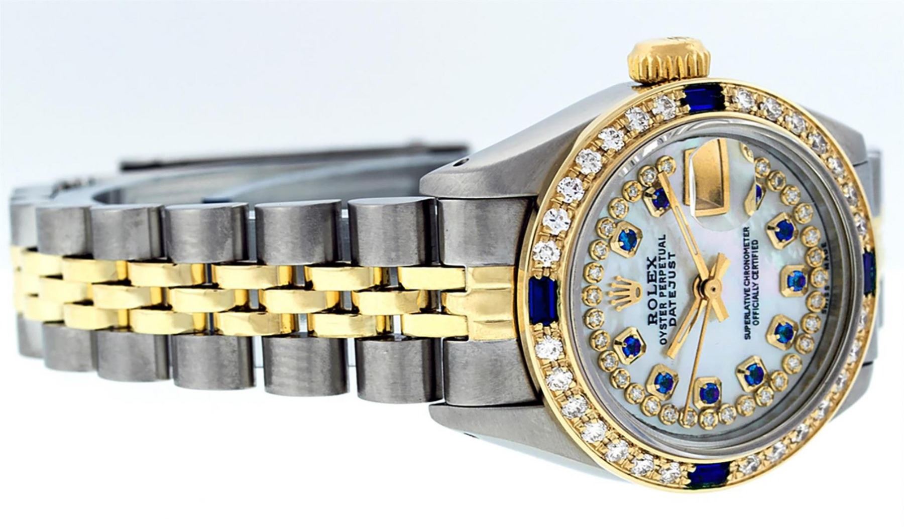 One Ladies 14K Two Tone Rolex Datejust Polished, Serviced & Electronically Tested, 14K Yellow Gold & Stainless Steel Case: 26mm, 14K Yellow Gold Crown, Custom Bezel: New 18K New Yellow Gold Sapphire Beadset Diamond Bezel, Diamond Count: 28 Diamonds + 4 Sapphires In Dial, Total Weight .70 Carat, Clarity: SI-VS, Color: G to H. Custom Crystal: New Scratch Resistant Synthetic Sapphire Cyclops Lens. Custom Hands: New Luminescent Hands. Movement: Automatic Winding Movement Caliber 2030. Custom Dial: Mother Of Pearl Sapphire String Diamond Dial, Stone Count: 10 Sapphires + 33 Diamonds In Dial, Clarity: SI-VS, Color: G to H. Date Window: 3 O'Clock Position Date Display, Model: Datejust. Condition: G-6 Extra Fine. Bracelet: Two Tone 14K Yellow Gold & Stainless Steel Jubilee Band. Bright Polish. 6.0 Inch Length, Adjustable. Standard Clasp, With Rolex Logo. This Watch Has Been Serviced Time Tested And Is In Excellent Condition It Is Free Of All Scratches And Dents.
