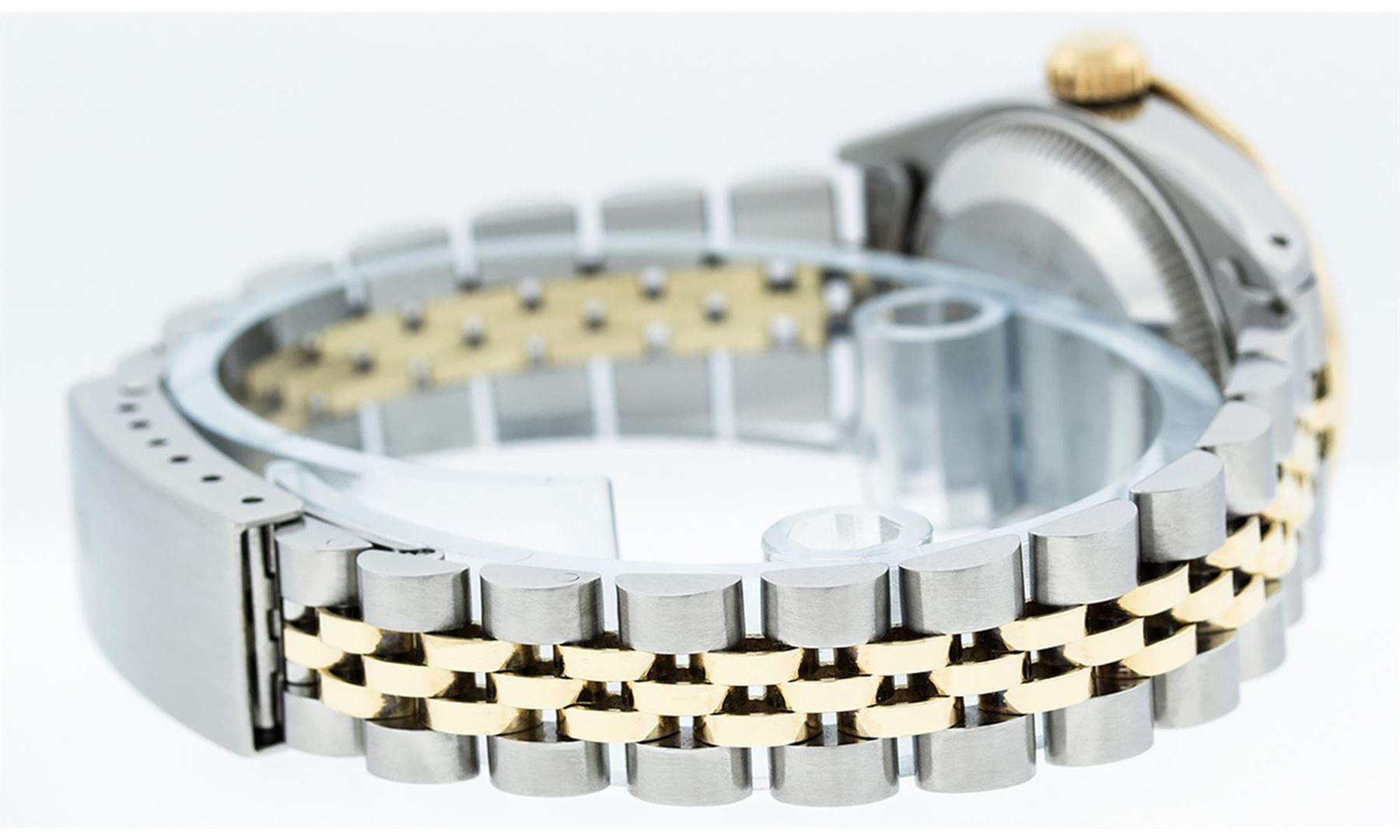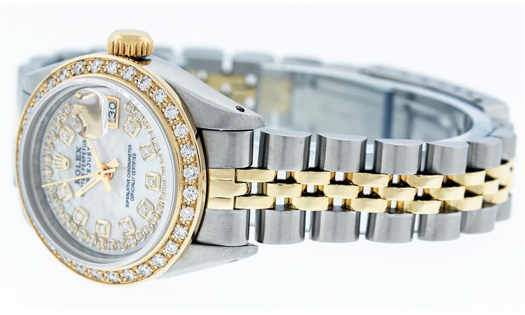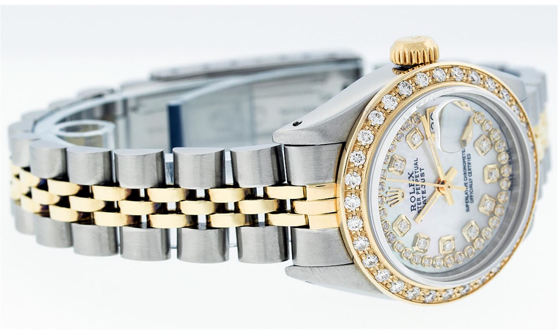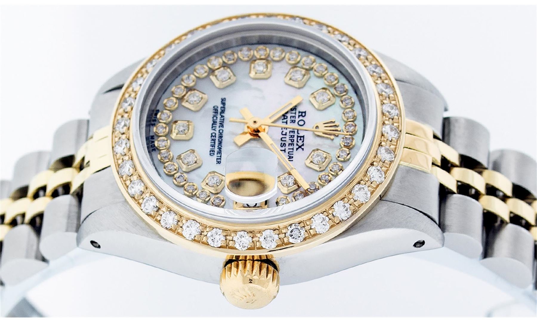 One Ladies 14K Two Tone Rolex Datejust Polished, Serviced & Electronically Tested, 14K Yellow Gold & Stainless Steel Case: 26mm, 14K Yellow Gold Crown, Custom Bezel: New 18K Yellow Gold Beadset Diamond Bezel, Diamond Count: 43 Diamonds in dial, Total Weight .70 Carat, Clarity: SI-VS, Color: G to H. Custom Crystal: New Synthetic Sapphire Cyclops Lens. Custom Hands: New Luminescent Hands. Movement: Automatic Winding Movement Caliber 2030. Custom Dial: Mother Of Pearl String Diamond Dial, Diamond Count: 43 Diamonds, Clarity: SI-VS, Color: G to H. Date Window: 3 O'Clock Position Date Display, Model: Datejust. Condition: G-6 Extra Fine. Bracelet: Two Tone 14K Yellow Gold & Stainless Steel Jubilee Band. Bright Polish. 6.0 Inch Length, Adjustable. Standard Clasp, With Rolex Logo. This Watch Has Been Serviced Time Tested And Is In Excellent Condition It Is Free Of All Scratches And Dents.