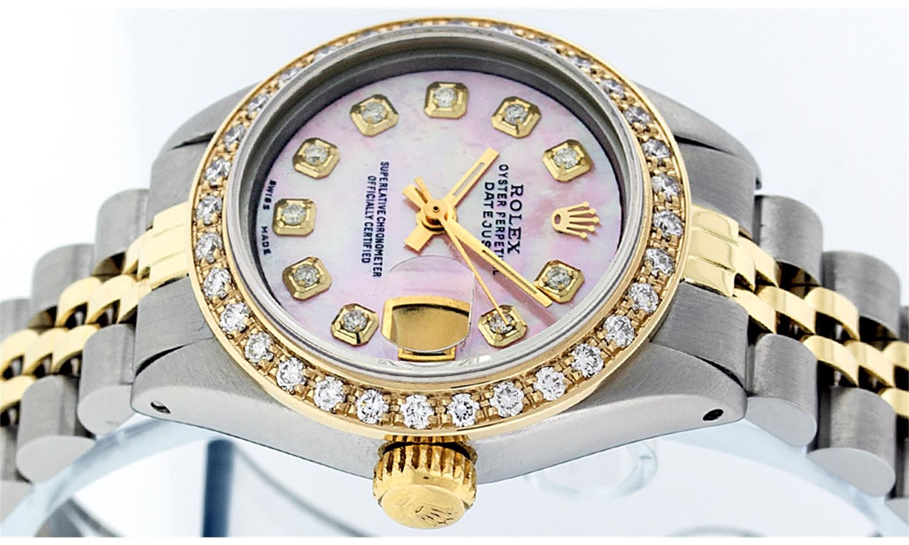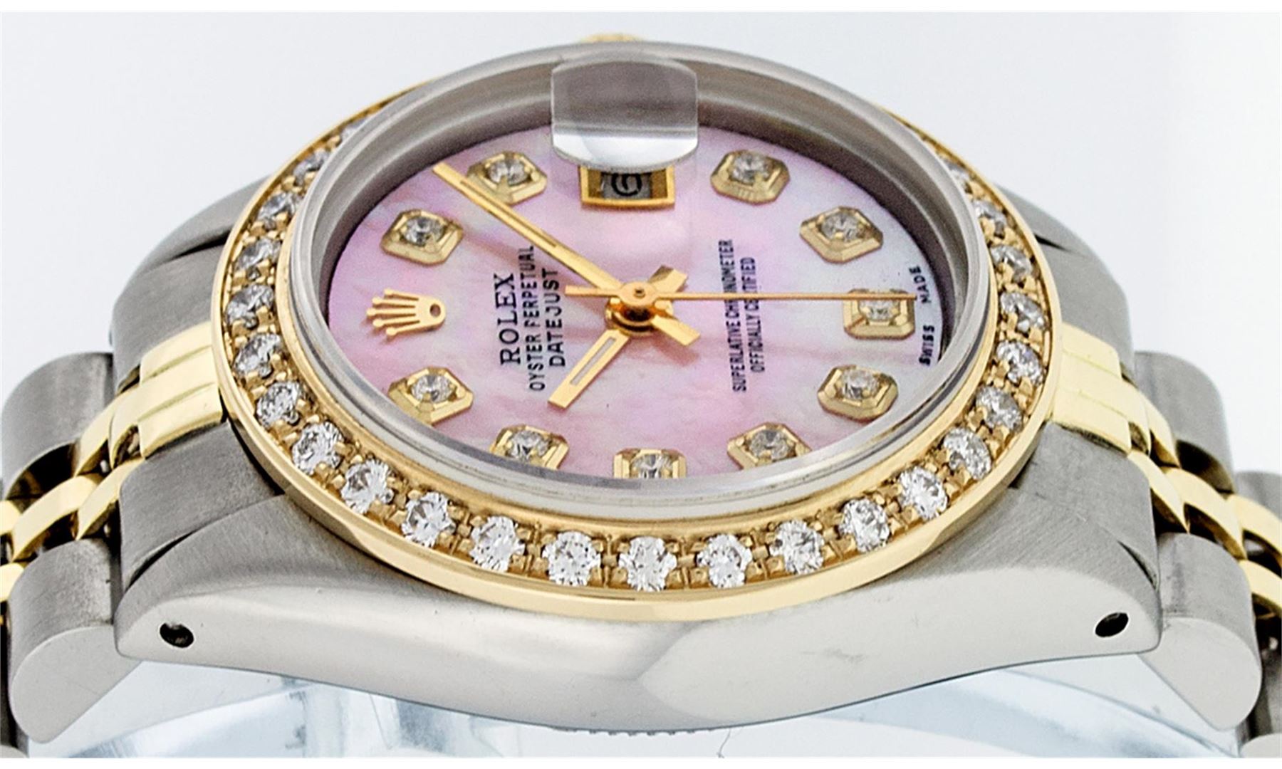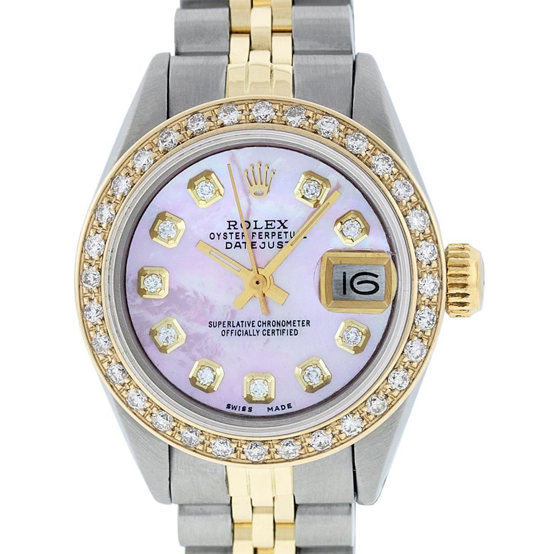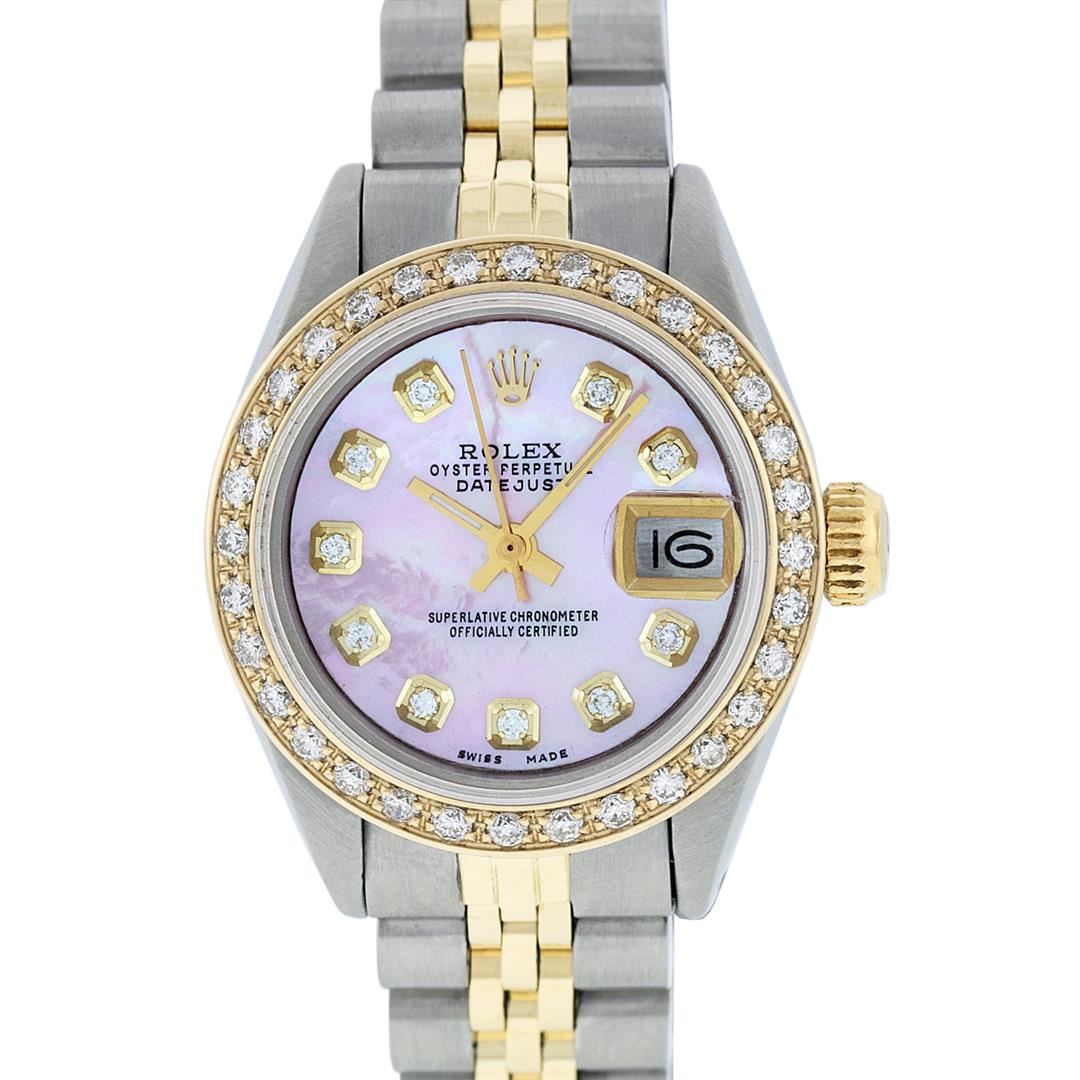 One Ladies 14K Two Tone Rolex Datejust Polished, Serviced & Electronically Tested, 14K Yellow Gold & Stainless Steel Case: 26mm, 14K Yellow Gold Crown, Custom Bezel: New 18K Yellow Gold Beadset Diamond Bezel, Diamond Count: 32 Diamonds, Total Weight .70 Carat, Clarity: SI-VS, Color: G to H. Custom Crystal: New Synthetic Sapphire Cyclops Lens. Custom Hands: New Luminescent Hands. Movement: Automatic Winding Movement Caliber 2030. Custom Dial: Pink Mother Of Pearl Diamond Dial, Diamond Count: 10 Diamonds in Dial, G To H In Color, VS Clarity. Date Window: 3 O'Clock Position Date Display, Model: Datejust, Condition: G-6 Extra Fine. Bracelet: Two Tone 14K Yellow Gold & Stainless Steel Jubilee. Bright Polish. 6.0 Inch Length, Adjustable. Standard Clasp, With Rolex Logo. This Watch Has Been Serviced Time Tested And Is In Excellent Condition It Is Free Of All Scratches And Dents.