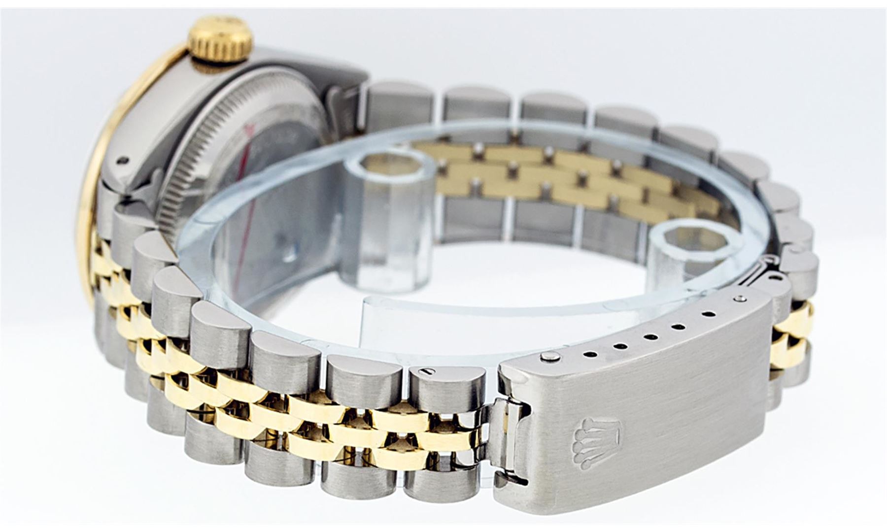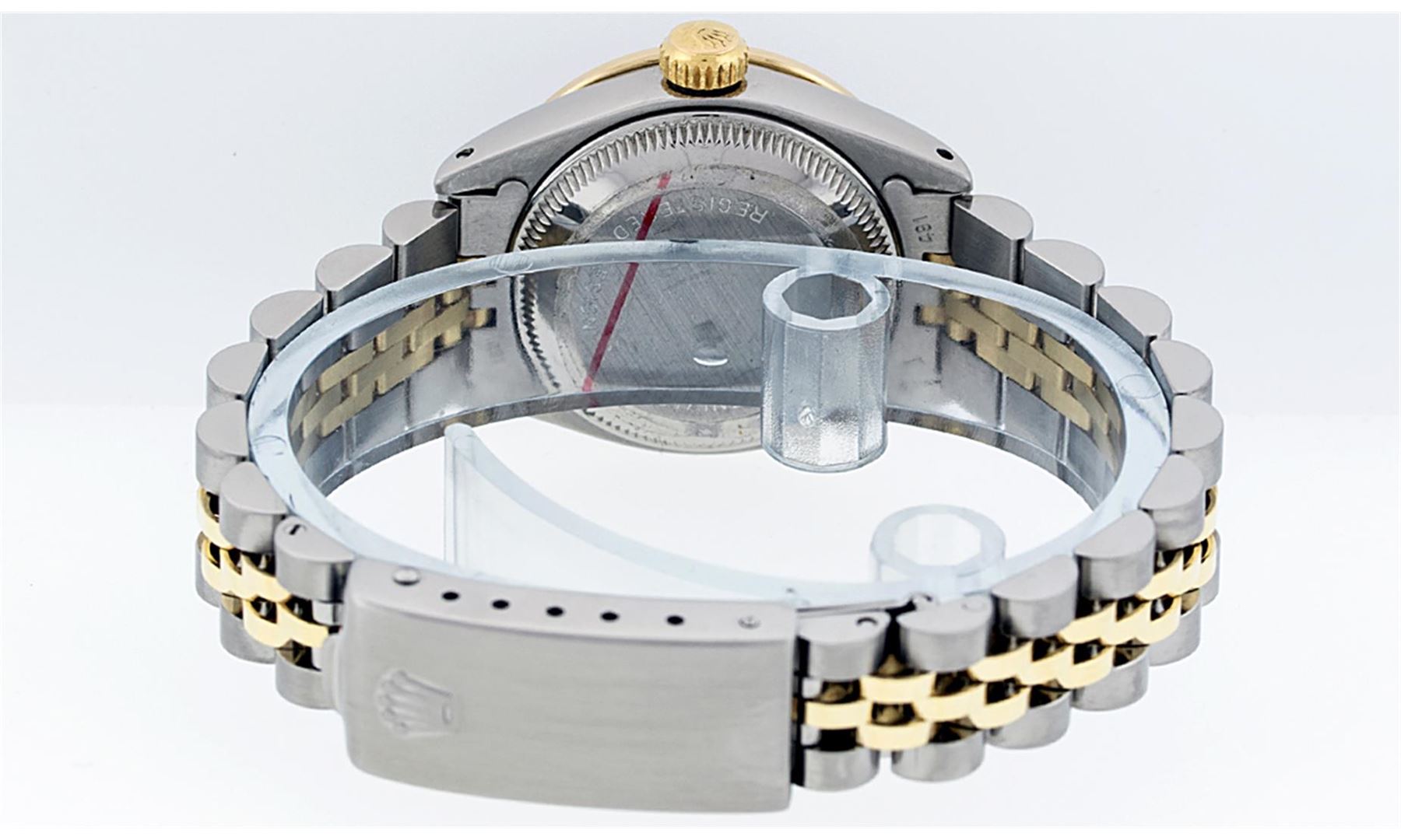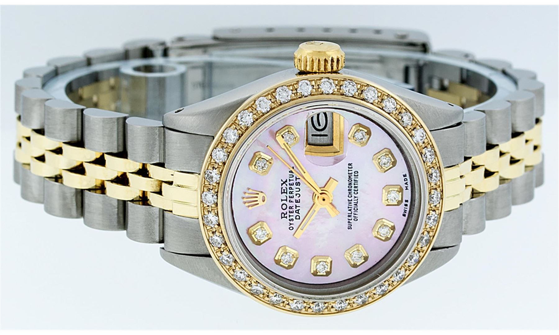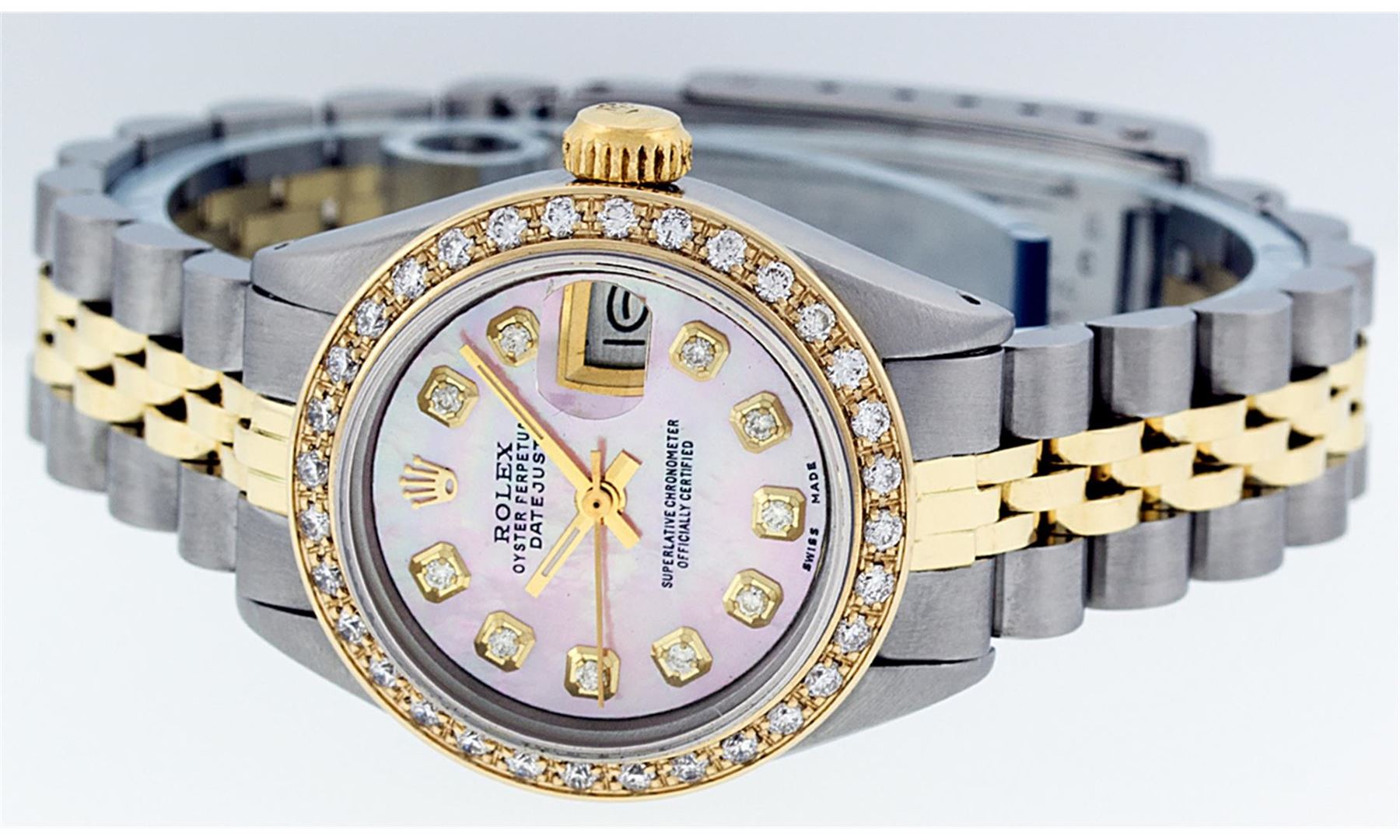 One Ladies 14K Two Tone Rolex Datejust Polished, Serviced & Electronically Tested, 14K Yellow Gold & Stainless Steel Case: 26mm, 14K Yellow Gold Crown, Custom Bezel: New 18K Yellow Gold Beadset Diamond Bezel, Diamond Count: 32 Diamonds, Total Weight .70 Carat, Clarity: SI-VS, Color: G to H. Custom Crystal: New Synthetic Sapphire Cyclops Lens. Custom Hands: New Luminescent Hands. Movement: Automatic Winding Movement Caliber 2030. Custom Dial: Pink Mother Of Pearl Diamond Dial, Diamond Count: 10 Diamonds in Dial, G To H In Color, VS Clarity. Date Window: 3 O'Clock Position Date Display, Model: Datejust, Condition: G-6 Extra Fine. Bracelet: Two Tone 14K Yellow Gold & Stainless Steel Jubilee. Bright Polish. 6.0 Inch Length, Adjustable. Standard Clasp, With Rolex Logo. This Watch Has Been Serviced Time Tested And Is In Excellent Condition It Is Free Of All Scratches And Dents.