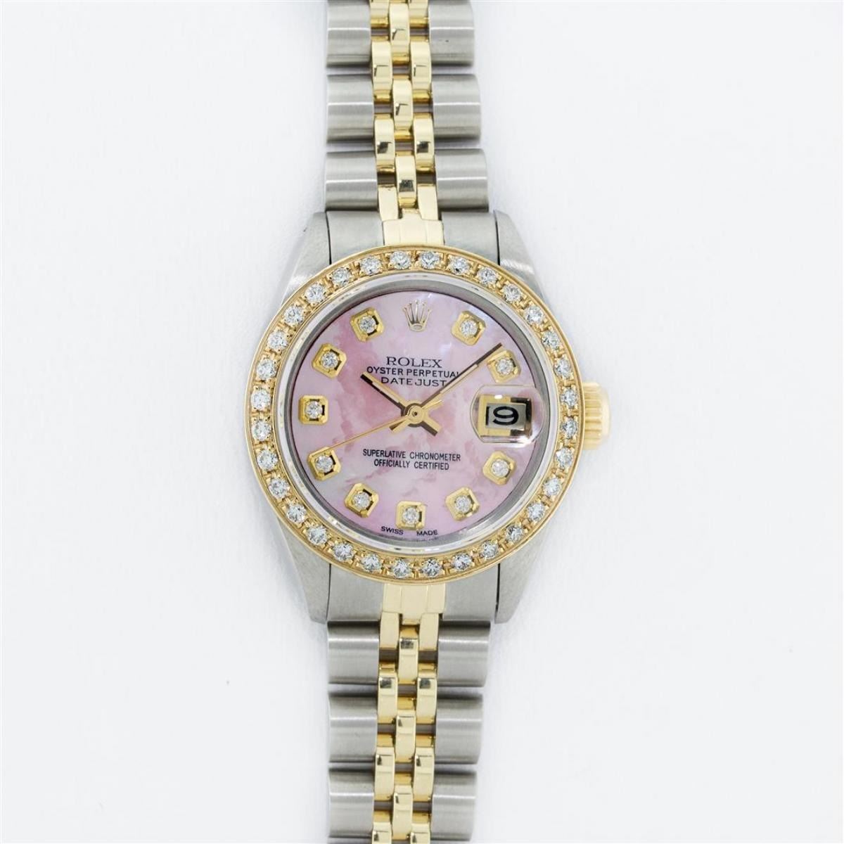 One Ladies 14K Two Tone Rolex Datejust Polished, Serviced & Electronically Tested, 14K Yellow Gold & Stainless Steel Case: 26mm, 14K Yellow Gold Crown, Custom Bezel: New 18K Yellow Gold Beadset Diamond Bezel, Diamond Count: 32 Diamonds, Total Weight .70 Carat, Clarity: SI-VS, Color: G to H. Custom Crystal: New Synthetic Sapphire Cyclops Lens. Custom Hands: New Luminescent Hands. Movement: Automatic Winding Movement Caliber 2030. Custom Dial: Pink Mother Of Pearl Diamond Dial, Diamond Count: 10 Diamonds in Dial, G To H In Color, VS Clarity. Date Window: 3 O'Clock Position Date Display, Model: Datejust, Condition: G-6 Extra Fine. Bracelet: Two Tone 14K Yellow Gold & Stainless Steel Jubilee. Bright Polish. 6.0 Inch Length, Adjustable. Standard Clasp, With Rolex Logo. This Watch Has Been Serviced Time Tested And Is In Excellent Condition It Is Free Of All Scratches And Dents.