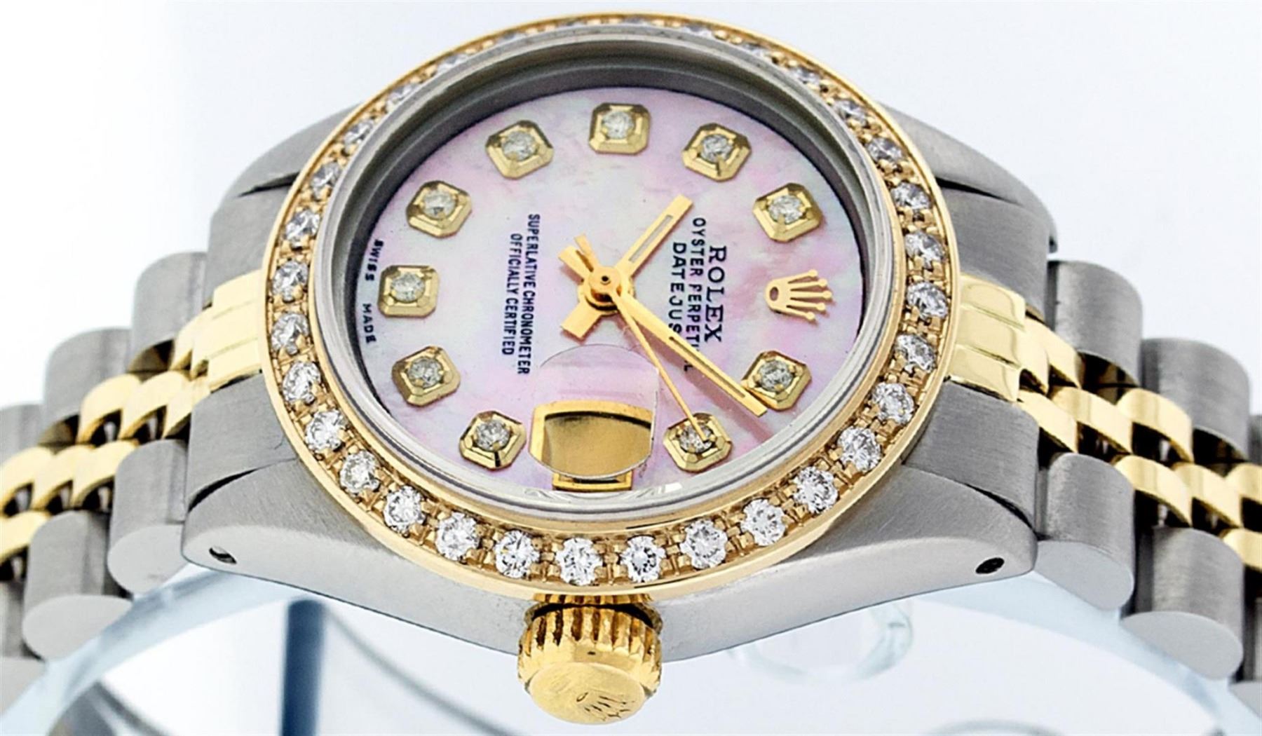 One Ladies 14K Two Tone Rolex Datejust Polished, Serviced & Electronically Tested, 14K Yellow Gold & Stainless Steel Case: 26mm, 14K Yellow Gold Crown, Custom Bezel: New 18K Yellow Gold Beadset Diamond Bezel, Diamond Count: 32 Diamonds, Total Weight .70 Carat, Clarity: SI-VS, Color: G to H. Custom Crystal: New Synthetic Sapphire Cyclops Lens. Custom Hands: New Luminescent Hands. Movement: Automatic Winding Movement Caliber 2030. Custom Dial: Pink Mother Of Pearl Diamond Dial, Diamond Count: 10 Diamonds in Dial, G To H In Color, VS Clarity. Date Window: 3 O'Clock Position Date Display, Model: Datejust, Condition: G-6 Extra Fine. Bracelet: Two Tone 14K Yellow Gold & Stainless Steel Jubilee. Bright Polish. 6.0 Inch Length, Adjustable. Standard Clasp, With Rolex Logo. This Watch Has Been Serviced Time Tested And Is In Excellent Condition It Is Free Of All Scratches And Dents.