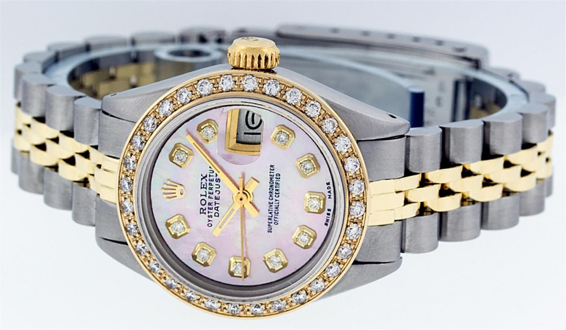 One Ladies 14K Two Tone Rolex Datejust Polished, Serviced & Electronically Tested, 14K Yellow Gold & Stainless Steel Case: 26mm, 14K Yellow Gold Crown, Custom Bezel: New 18K Yellow Gold Beadset Diamond Bezel, Diamond Count: 32 Diamonds, Total Weight .70 Carat, Clarity: SI-VS, Color: G to H. Custom Crystal: New Synthetic Sapphire Cyclops Lens. Custom Hands: New Luminescent Hands. Movement: Automatic Winding Movement Caliber 2030. Custom Dial: Pink Mother Of Pearl Diamond Dial, Diamond Count: 10 Diamonds in Dial, G To H In Color, VS Clarity. Date Window: 3 O'Clock Position Date Display, Model: Datejust, Condition: G-6 Extra Fine. Bracelet: Two Tone 14K Yellow Gold & Stainless Steel Jubilee. Bright Polish. 6.0 Inch Length, Adjustable. Standard Clasp, With Rolex Logo. This Watch Has Been Serviced Time Tested And Is In Excellent Condition It Is Free Of All Scratches And Dents.