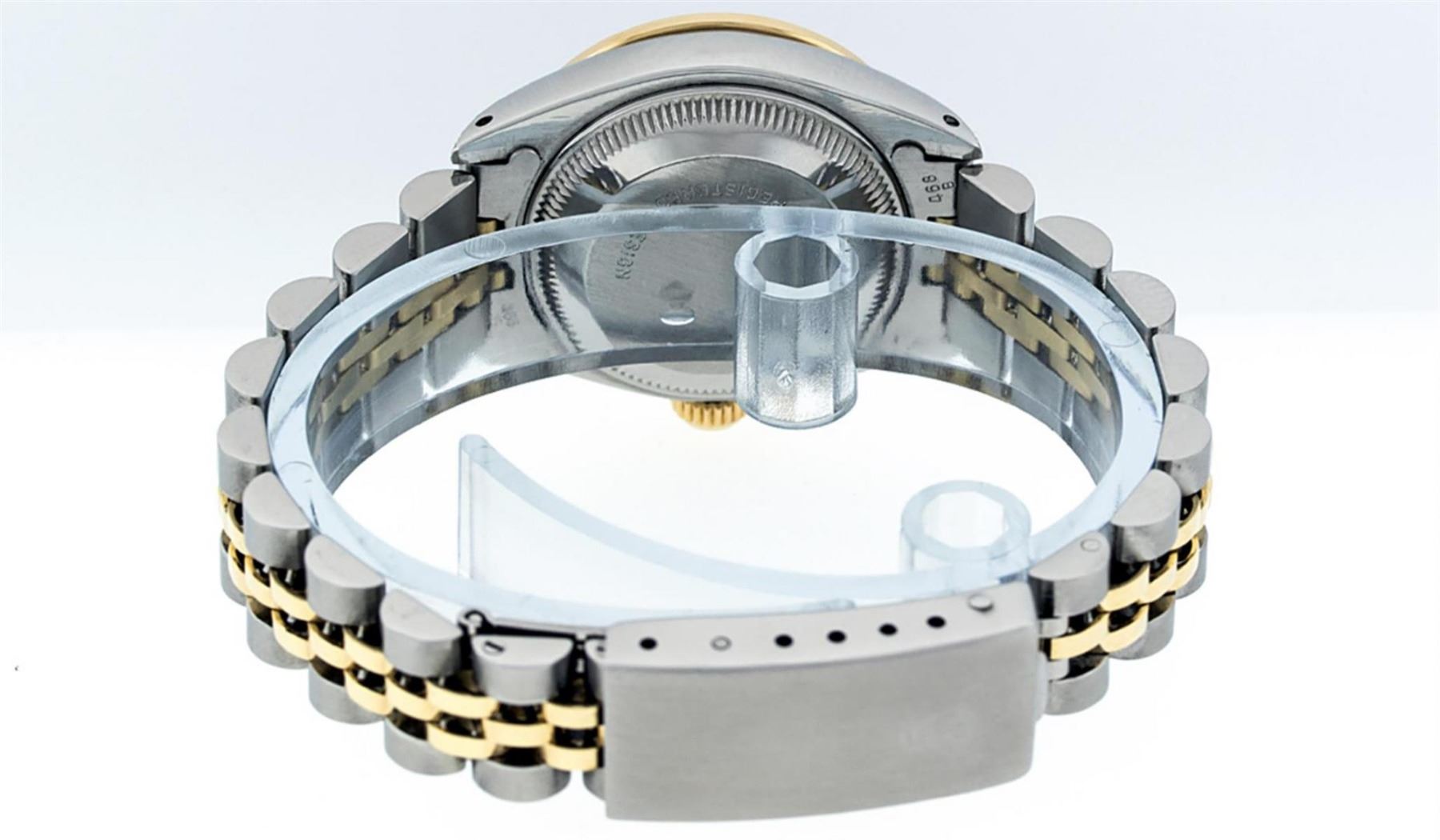 One Ladies 14K Two Tone Rolex Datejust Polished, Serviced & Electronically Tested, 14K Yellow Gold & Stainless Steel Case: 26mm, 14K Yellow Gold Crown, Diamond Lugs: 24 Diamonds On Lugs, Clarity: SI-VS, Color: G to H. Custom Bezel: New 18K Yellow Gold Pyramid Diamond Bezel, Diamond Count: 24 Diamonds, Total Bezel Weight .50 Carat, Clarity: SI-VS, Color: G to H. Custom Crystal: New Scratch Resistant Synthetic Sapphire Cyclops Lens. Custom Hands: New Luminescent Hands. Movement: Automatic Winding Movement Caliber 2030. Custom Dial: Pink Mother Of Pearl With Diamond Hour Markers, Diamond Count: 10 Diamonds In Dial, Clarity: SI-VS, Color: G to H. Date Window: 3 O'Clock Position Date Display, Model: Datejust. Condition: G-6 Extra Fine. Bracelet: Two Tone 14K Yellow Gold & Stainless Steel Jubilee Band. Bright Polish. 6.0 Inch Length, Adjustable. Standard Clasp, With Rolex Logo. This Watch Has Been Serviced Time Tested And Is In Excellent Condition It Is Free Of All Scratches And Dents.