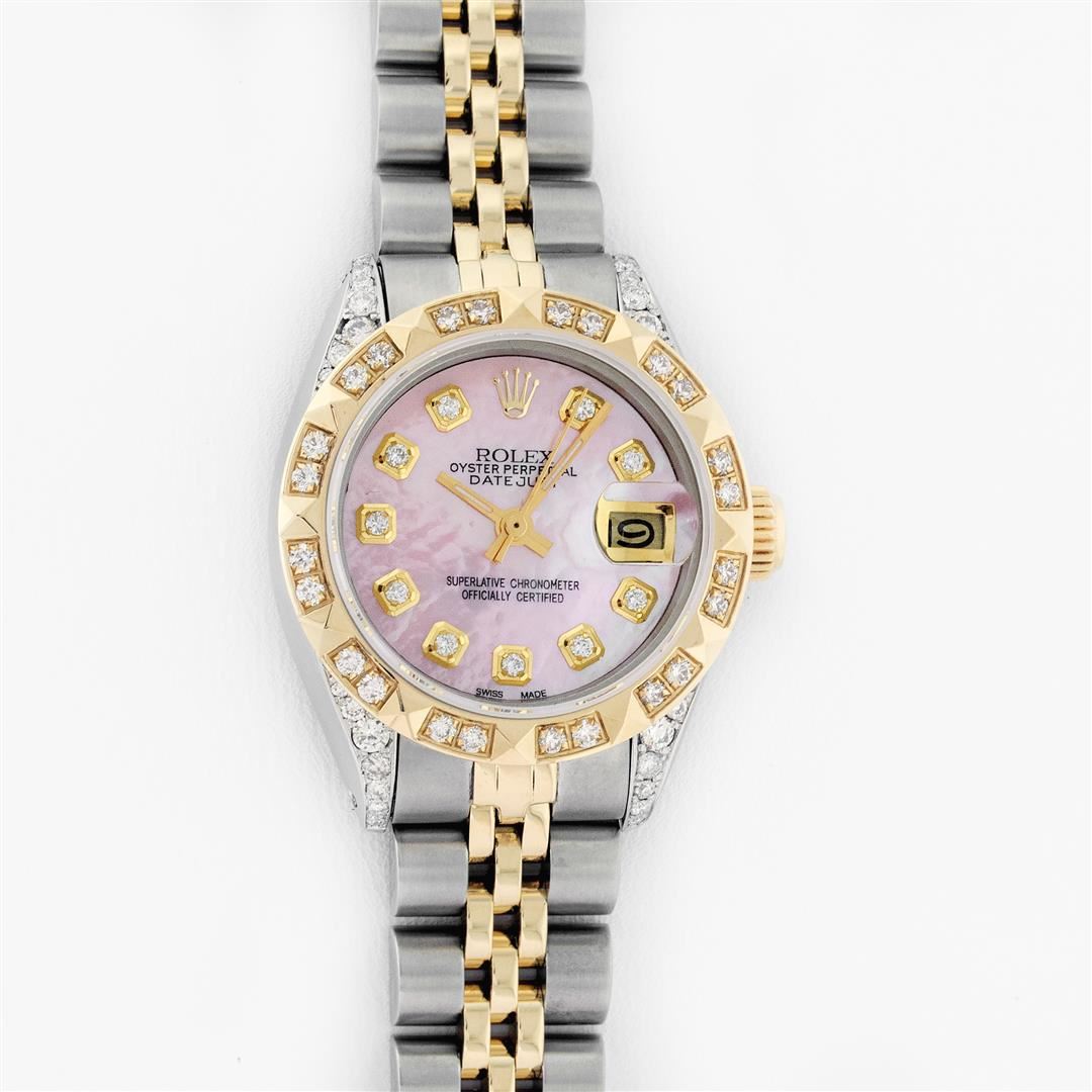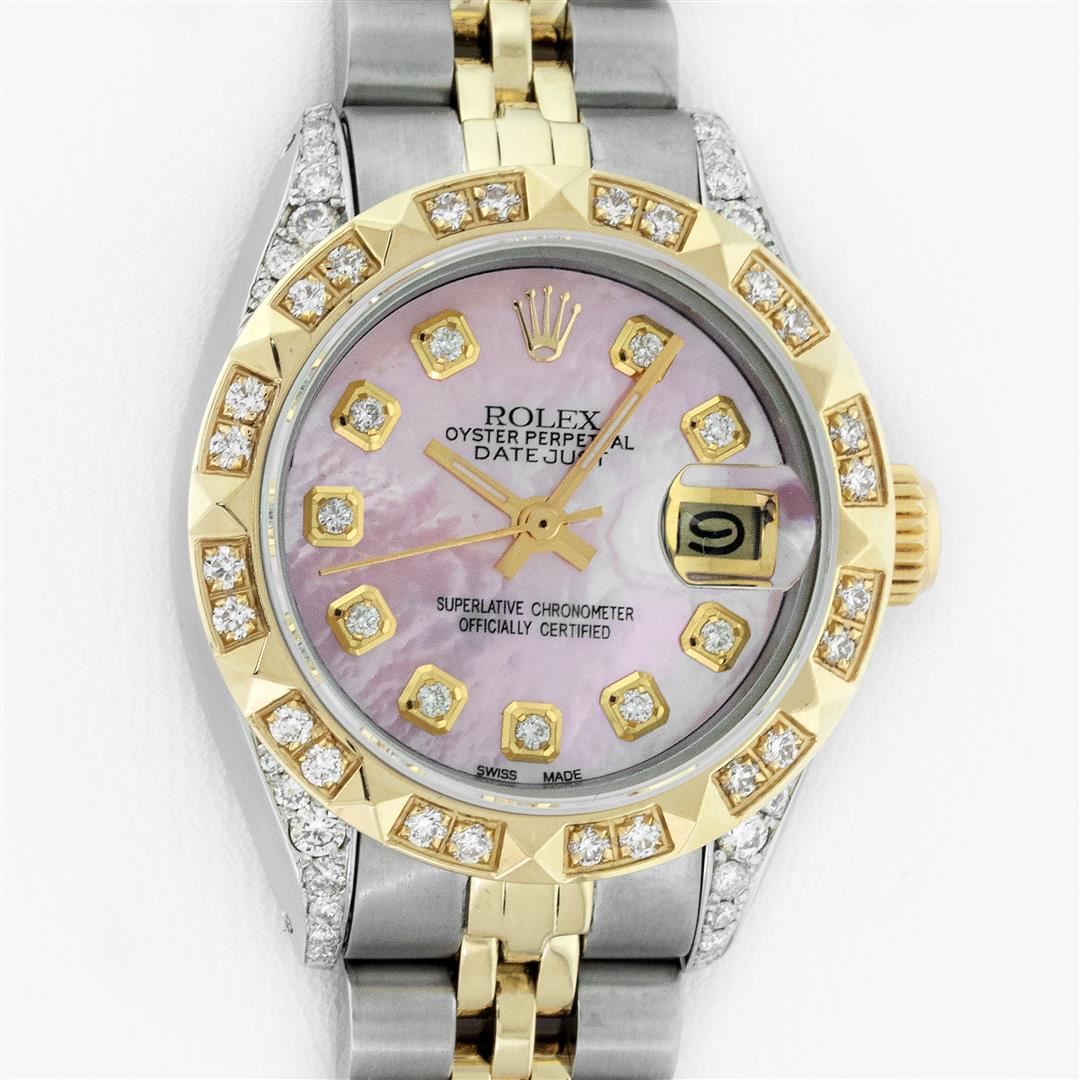 One Ladies 14K Two Tone Rolex Datejust Polished, Serviced & Electronically Tested, 14K Yellow Gold & Stainless Steel Case: 26mm, 14K Yellow Gold Crown, Diamond Lugs: 24 Diamonds On Lugs, Clarity: SI-VS, Color: G to H. Custom Bezel: New 18K Yellow Gold Pyramid Diamond Bezel, Diamond Count: 24 Diamonds, Total Bezel Weight .50 Carat, Clarity: SI-VS, Color: G to H. Custom Crystal: New Scratch Resistant Synthetic Sapphire Cyclops Lens. Custom Hands: New Luminescent Hands. Movement: Automatic Winding Movement Caliber 2030. Custom Dial: Pink Mother Of Pearl With Diamond Hour Markers, Diamond Count: 10 Diamonds In Dial, Clarity: SI-VS, Color: G to H. Date Window: 3 O'Clock Position Date Display, Model: Datejust. Condition: G-6 Extra Fine. Bracelet: Two Tone 14K Yellow Gold & Stainless Steel Jubilee Band. Bright Polish. 6.0 Inch Length, Adjustable. Standard Clasp, With Rolex Logo. This Watch Has Been Serviced Time Tested And Is In Excellent Condition It Is Free Of All Scratches And Dents.