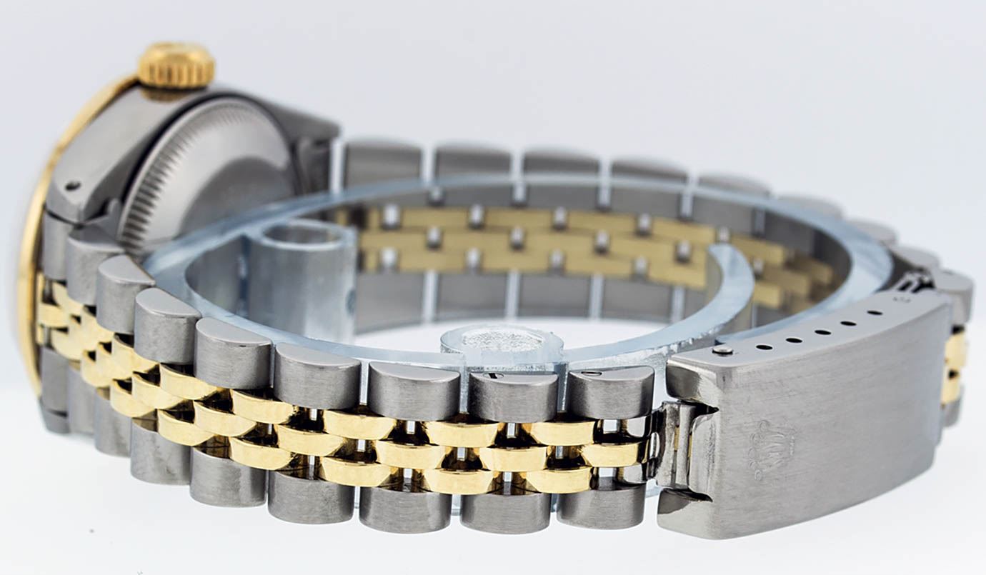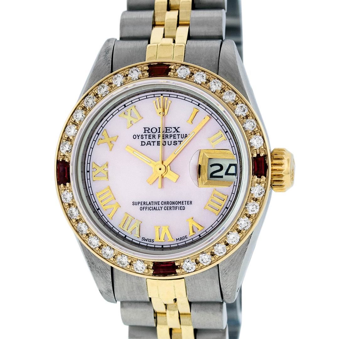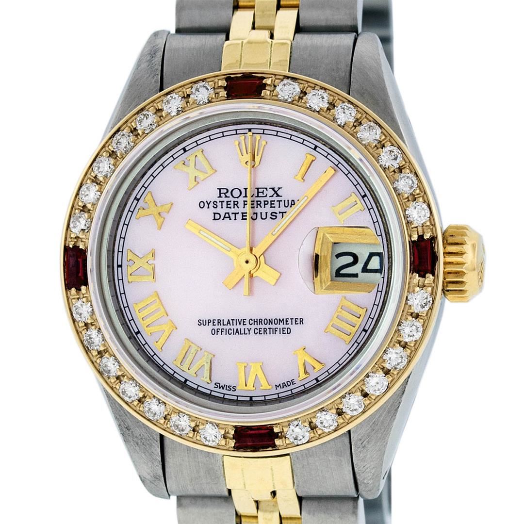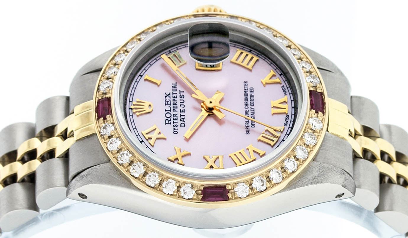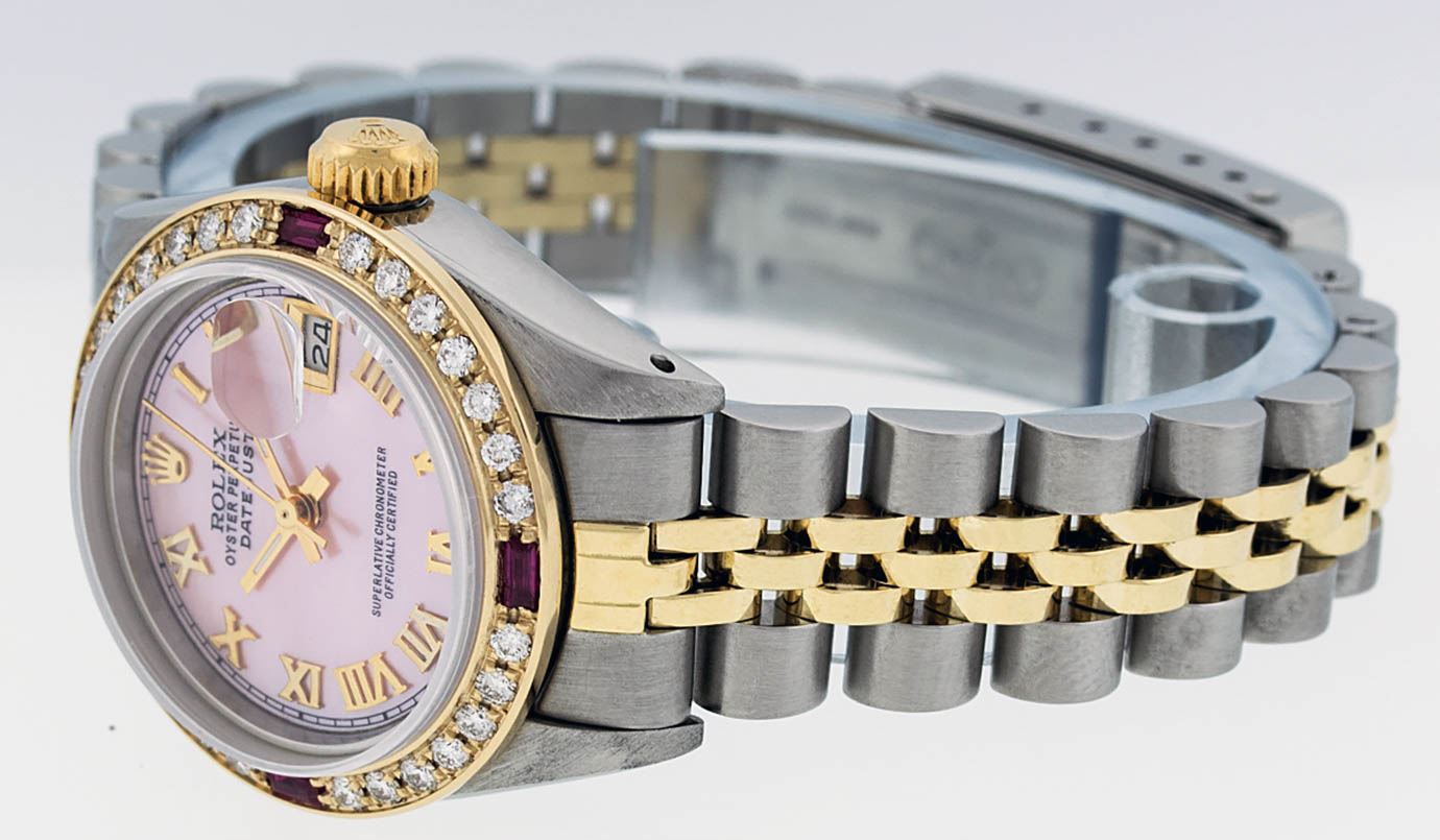 One Ladies 14K Two Tone Rolex Datejust Polished, Serviced & Electronically Tested, 14K Yellow Gold & Stainless Steel Case: 26mm, 14K Yellow Gold Crown, Custom Bezel: New 18K Yellow Gold Ruby Beadset Diamond Bezel, Diamond + Gem Count: 28 Diamonds + 4 Rubies Total Weight .70 Carat, Clarity: SI-VS, Color: G to H. Custom Crystal: New Synthetic Sapphire Cyclops Lens. Custom Hands: New Luminescent Hands. Movement: Automatic Winding Movement Caliber 2030. Custom Dial: Pink Mother Of Pearl Roman Dial With Square Track. Date Window: 3 O'Clock Position Date Display, Model: Datejust, Condition: G-6 Extra Fine. Bracelet: Two Tone 14K Yellow Gold & Stainless Steel Jubilee. Bright Polish. 6.0 Inch Length, Adjustable. Standard Clasp, With Rolex Logo. This Watch Has Been Serviced Time Tested And Is In Excellent Condition It Is Free Of All Scratches And Dents.